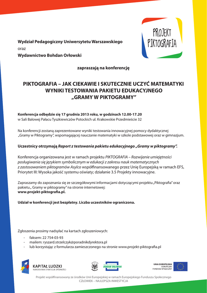 Wydział Pedagogiczny Uniwersytetu Warszawskiego oraz Wydawnictwo Bohdan Orłowski zapraszają na konferencję PIKTOGRAFIA – JAK CIEKAWIE I SKUTECZNIE UCZYĆ MATEMATYKI WYNIKI TESTOWANIA PAKIETU EDUKACYJNEGO „GRAMY W PIKTOGRAMY” Konferencja odbędzie się 17 grudnia 2013 roku, w godzinach 12.00-17.20 w Sali Balowej Pałacu Tyszkiewiczów Potockich ul. Krakowskie Przedmieście 32 Na konferencji zostaną zaprezentowane wyniki testowania innowacyjnej pomocy dydaktycznej „Gramy w Piktogramy”, wspomagającej nauczanie matematyki w szkole podstawowej oraz w gimnazjum. Uczestnicy otrzymają Raport z testowania pakietu edukacyjnego „Gramy w piktogramy”. Konferencja organizowana jest w ramach projektu PIKTOGRAFIA – Rozwijanie umiejętności posługiwania się językiem symbolicznym w edukacji z zakresu nauk matematycznych z zastosowaniem piktogramów Asylco współfinansowanego przez Unię Europejską w ramach EFS, Priorytet III: Wysoka jakość systemu oświaty; działanie 3.5 Projekty innowacyjne. Zapraszamy do zapoznania się ze szczegółowymi informacjami dotyczącymi projektu „Piktografia” oraz pakietu „ Gramy w piktogramy” na stronie internetowej: www.projekt-piktografia.pl. Udział w konferencji jest bezpłatny. Liczba uczestników ograniczona. Zgłoszenia prosimy nadsyłać na kartach zgłoszeniowych: ---- faksem: 22 754-03-93 mailem: [email protected] lub korzystając z formularza zamieszczonego na stronie www.projekt-piktografia.pl Projekt współfinansowany ze środków Unii Europejskiej w ramach Europejskiego Funduszu Społecznego CZŁOWIEK – NAJLEPSZA INWESTYCJA Ramowy program konferencji PIKTOGRAFIA – JAK CIEKAWIE I SKUTECZNIE UCZYĆ MATEMATYKI WYNIKI TESTOWANIA PAKIETU EDUKACYJNEGO „GRAMY W PIKTOGRAMY” Warszawa, Uniwersytet Warszawski, 17 grudnia 2013 r. 11:00 – 12:00 Rejestracja Uczestników 12:00 – 12:15 Rozpoczęcie konferencji – Powitanie Uczestników 12:15 – 12:30 Prezentacja projektu PIKTOGRAFIA i dotychczasowych działań 12:30 – 13:00 Wykład: „Edukacja matematyczna?” – dr Alina Kalinowska, Uniwersytet Warmińsko – Mazurski w Olsztynie 13:00 – 13:30 Filozofia edukacyjna pakietu „Gramy w piktogramy” 13:30 – 13:45 Prezentacja pakietu „Gramy w piktogramy” 13:45 – 14:15 Przerwa kawowo - kanapkowa 14:15 – 14:45 O umiejętnościach matematycznych uczniów testujących pakiet „Gramy w piktogramy” 14:45 – 15:00 O rozwoju innych umiejętności uczniów testujących pakiet „Gramy w piktogramy” 15:00 – 15:15 O nauczycielach testujących innowacyjną pomoc dydaktyczną 15:15 – 15:45 Dyskusja 15:45 – 16:15 Wykład: „Neurodydaktyka - procesy uczenia się w świetle badań nad mózgiem”, dr Marzena Żylińska, Uniwersytet Mikołaja Kopernika w Toruniu 16:15 – 16:30 Wystąpienie: „Innowacje społeczne w obszarze Edukacja i szkolnictwo wyższe”, Dariusz Pietrzyk Koordynator KST Edukacja i Szkolnictwo Wyższe 16:30 – 16:45 Upowszechnianie i wdrażanie pakietu „Gramy w Piktogramy” 16:45 – 16:50 Zakończenie konferencji 16:50 – 17:20 Obiad Prowadzący konferencję: Mirosław Dąbrowski - doktor nauk matematycznych, pracownik naukowy Wydziału Matematyki, Informatyki i Mechaniki Uniwersytetu Warszawskiego. Dydaktyk matematyki, specjalista w zakresie nauczania matematyki w szkole podstawowej. Autor licznych publikacji o nauczaniu matematyki, współautor pakietów „Matematyka 2001” oraz „Przygoda z klasą”. Anna Dereń - absolwentka Wydziału Pedagogiki Uniwersytetu Śląskiego w Cieszynie, dyrektor Centrym Inicjatyw Edukacyjnych w Kartuzach, autorka alternatywnego programu nauczania w klasach I-III oraz licznych publikacji o edukacji, wychowaniu, współautorka pakietu „Przygoda z klasą”, realizatorka wielu projektów edukacyjnych o zasięgu regionalnym, ogólnopolskim oraz międzynarodowym. Elżbieta Jabłońska - absolwentka Wydziału Matematyki, Informatyki i Mechaniki Uniwersytetu Warszawskiego, nauczycielka matematyki w Gimnazjum nr 42 z Oddziałami Dwujęzycznymi w Warszawie. W latach 1998-1999 członek zespołu opracowującego warianty sprzawdzianu dla uczniów kończących naukę w sześcioletniej szkole podstawowej, a w latach 2007-2010 członek zespołu badawczego projektu Nowa formuła sprawdzianu. Małgorzata Sieńczewska - doktor w dziedzinie nauk humanistycznych w zakresie pedagogiki, adiunkt w Katedrze Edukacji Początkowej Wydziału Pedagogicznego Uniwersytetu Warszawskiego. Autorka publikacji naukowych i edukacyjnych z zakresu wykorzystania dramy, metody projektów i nowoczesnych technologii informacyjno-komunikacyjnych w uczeniu się dzieci z klas I-III szkoły podstawowej, współautorka pakietów „Uczymy się z Psotką” i „Raz dwa trzy, teraz MY”. Małgorzata Żytko - doktor habilitowany w dziedzinie nauk humanistycznych w zakresie pedagogiki, profesor UW, pracownik naukowy Wydziału Pedagogicznego Uniwersytetu Warszawskiego, kierownik Katedry Edukacji Szkolnej i Kształcenia Nauczycieli. Autorka licznych publikacji dotyczących problematyki wspierania rozwoju dzieci, współpracy szkoły z rodzicami, kształcenia nauczycieli. Anna Pregler - absolwentka Akademii Sztuk Pięknych w Krakowie, nauczycielka w Szkole Podstawowej nr 48 w Krakowie, pracownik Instytutu Badań Edukacyjnych. Koordynator Ogólnopolskiego Badania Umiejętności Trzecioklasistów. Współautorka pakietu „Przygoda z klasą” i publikacji dotyczących edukacji wczesnoszkolnej. Projekt współfinansowany ze środków Unii Europejskiej w ramach Europejskiego Funduszu Społecznego CZŁOWIEK – NAJLEPSZA INWESTYCJA Karta zgłoszenia na konferencję PIKTOGRAFIA – JAK CIEKAWIE I SKUTECZNIE UCZYĆ MATEMATYKI WYNIKI TESTOWANIA PAKIETU EDUKACYJNEGO „GRAMY W PIKTOGRAMY” Termin konferencji: 17 grudnia 2013 roku, w godzinach od 12:00 do 17:20 Miejsce konferencji: Sala Balowa Pałacu Tyszkiewiczów Potockich ul. Krakowskie Przedmieście 32 imię i nazwisko Dane placówki nazwa placówki a