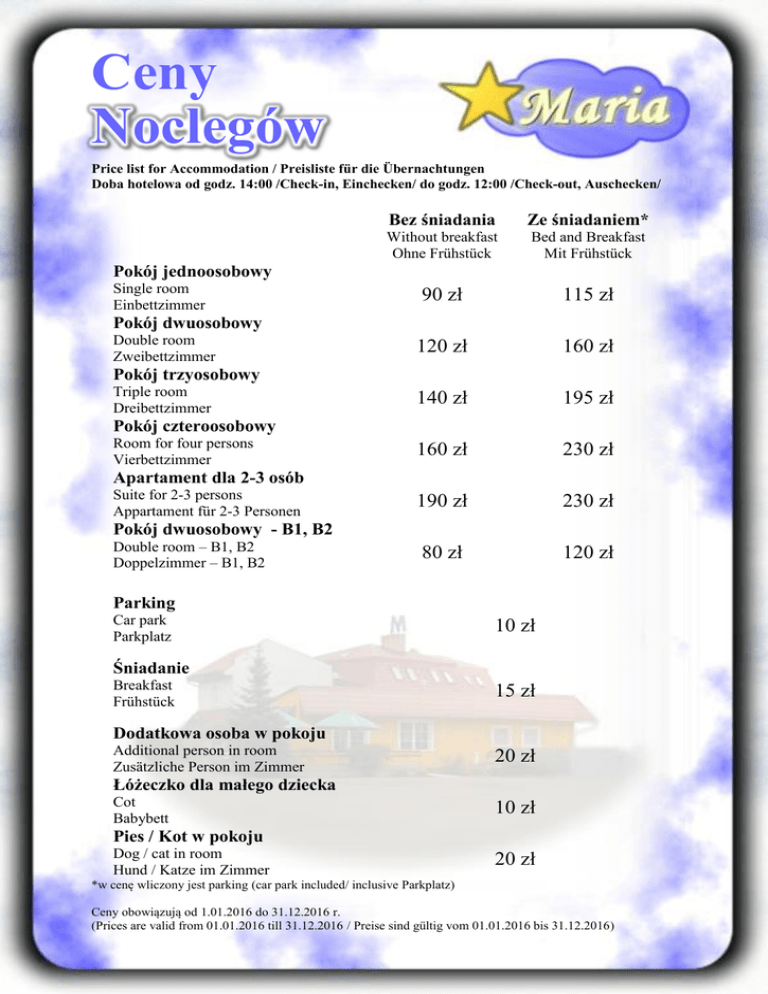 Ceny Noclegów Price list for Accommodation / Preisliste für die Übernachtungen Doba hotelowa od godz. 14:00 /Check-in, Einchecken/ do godz. 12:00 /Check-out, Auschecken/ Bez śniadania Ze śniadaniem* Without breakfast Ohne Frühstück Bed and Breakfast Mit Frühstück 90 zł 115 zł 120 zł 160 zł 140 zł 195 zł 160 zł 230 zł 190 zł 230 zł 80 zł 120 zł Pokój jednoosobowy Single room Einbettzimmer Pokój dwuosobowy Double room Zweibettzimmer Pokój trzyosobowy Triple room Dreibettzimmer Pokój czteroosobowy Room for four persons Vierbettzimmer Apartament dla 2-3 osób Suite for 2-3 persons Appartament für 2-3 Personen Pokój dwuosobowy - B1, B2 Double room – B1, B2 Doppelzimmer – B1, B2 Parking Car park Parkplatz 10 zł Śniadanie Breakfast Frühstück 15 zł Dodatkowa osoba w pokoju Additional person in room Zusätzliche Person im Zimmer 20 zł Łóżeczko dla małego dziecka Cot Babybett 10 zł Pies / Kot w pokoju Dog / cat in room Hund / Katze im Zimmer 20 zł *w cenę wliczony jest parking (car park included/ inclusive Parkplatz) Ceny obowiązują od 1.01.2016 do 31.12.2016 r. (Prices are valid from 01.01.2016 till 31.12.2016 / Preise sind gültig vom 01.01.2016 bis 31.12.2016)