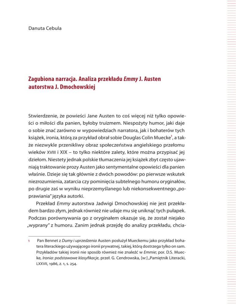 Danuta Cebula Zagubiona narracja. Analiza przekładu Emmy J. Austen autorstwa J. Dmochowskiej Stwierdzenie, że powieści Jane Austen to coś więcej niż tylko opowieści o miłości dla panien, byłoby truizmem. Niespożyty humor, jaki daje o sobie znać zarówno w wypowiedziach narratora, jak i bohaterów tych książek, ironia, którą za przykład obrał sobie Douglas Colin Muecke1, a także niezwykle przenikliwy obraz społeczeństwa angielskiego przełomu wieków XVIII i XIX – to tylko niektóre zalety, które można przypisać jej dziełom. Niestety jednak polskie tłumaczenia jej książek zbyt często ujawniają traktowanie prozy Austen jako sentymentalne opowieści dla panien właśnie. Dzieje się tak głównie z dwóch powodów: po pierwsze wskutek niezrozumienia, zatarcia czy pominięcia subtelnego humoru oryginałów, po drugie zaś w wyniku nieprzemyślanego lub niekonsekwentnego „poprawiania” języka autorki. Przekład Emmy autorstwa Jadwigi Dmochowskiej nie jest przekładem bardzo złym, jednak również nie udaje mu się uniknąć tych pułapek. Podczas porównywania go z oryginałem okazuje się, że został niejako „wyprany” z humoru. Zanim jednak przejdę do analizy przekładu, chcia1 Pan Bennet z Dumy i uprzedzenia Austen posłużył Mueckemu jako przykład bohatera literackiego używającego ironii prywatnej, takiej, którą dostrzega tylko on sam. Przykładów takiej ironii nie sposób również nie znaleźć w Emmie; por. D.S. Muecke, Ironia: podstawowe klasyfikacje, przeł. G. Cendrowska, [w:] „Pamiętnik Literacki, LXXVII, 1986, z. 1, s. 254. 136 | Danuta Cebula łabym zacząć od krótkiej interpretacji utworu, by sposobem Stanisława Barańczaka wydobyć z niego dominantę semantyczną2. Następnie przeanalizuję przekład kilku fragmentów Emmy, biorąc pod uwagę większość zabiegów deformacyjnych, które wyodrębnił w swej rozprawie Antoine Berman (niektórymi zajmę się szerzej, o innych tylko wspomnę)3 – sprawdzając, które z nich zubożają, a które – wręcz przeciwnie – wzbogacają polską wersję tekstu. Zabiegi te pozwolę sobie omawiać w innym porządku, niż to zaproponował w swej rozprawie Berman – po pierwsze dlatego, że jedne są widoczne w przekładzie Emmy bardziej, inne mniej; po wtóre zaś dlatego, iż wiele z nich występuje w przykładach, które omówię, równocześnie. 1. Powieść o pokorze. W poszukiwaniu dominanty semantycznej Emma Woodhouse, wychowywana przez starego, wiecznie zatroskanego o nią ojca i pobłażliwą guwernantkę, po wstąpieniu tej drugiej w związek małżeński czuje nieodpartą potrzebę znalezienia sobie przyjaciółki – i wkrótce odnajduje ją w osobie dość głupiutkiej Harriet Smith – panny nieznanego pochodzenia. Będąc niezwykle pewną siebie, Emma jest przekonana, że przenika zamysły otaczających ją osób i wobec tego jest predysponowana do kojarzenia par – staje się niejako patronką Harriet, próbując znaleźć jej męża. Jednak proponowany przez nią kandydat okazuje się ze wszech miar niestosowny. Od tej porażki zaczynają się wszystkie następne klęski Emmy: pycha ją zaślepia i, zamiast rozpoznawać faktyczną 2 3 Por. S. Barańczak, Mały, lecz maksymalistyczny manifest translatologiczny, albo: Tłumaczenie się z tego, że tłumaczy się wiersze również w celu wytłumaczenia innym tłumaczom, iż dla większości tłumaczeń nie ma wytłumaczenia, [w:] tegoż, Ocalone w tłumaczeniu: szkice o warsztacie tłumacza poezji z dodatkiem małej antologii przekładów – problemów, Kraków 2004. Por. A. Berman, Przekład jako doświadczenie Obcego, przeł. U. Hrehorowicz, [w:] Współczesne teorie przekładu. Antologia, red. P. Bukowski i M. Heydel, Kraków 2009. Zagubiona narracja. Analiza przekładu… | 137 sytuację, bohaterka próbuje narzucić światu swoje własne plany i koncepcje. Nie udaje jej się, jak to zamierzała, wynieść Harriet na wyżyny społeczne, sprawia, że dziewczyna, choć nadal nie może znaleźć odpowiedniego kandydata na męża, odrzuca propozycję mężczyzny na jej poziomie społecznym, a na domiar złego zaczyna kierować się próżnością. Ponadto Emma pozwala się wciągnąć we flirt z Frankiem Churchillem, majętnym synem sąsiadów, i całkowicie nie zauważa, że ten prowadzi dość osobliwą grę (jest bowiem potajemnie zaręczony z inną panną). Zamiast zająć się sobą, Emma projektuje życie innych – i to jest paradoksalny egoizm, na który wskazuje Austen w swej powieści. Na szczęście Emma w końcu odkrywa, co naprawdę kryje się w jej duszy: miłość do przyjaciela domu, pana Knightleya, mądrego, starszego od niej o kilkanaście lat mężczyzny, który nigdy nie był wobec niej pobłażliwy i zawsze służył jej dobrą radą. Powieść oczywiście kończy się dobrze, ale z morałem: pycha prowadzi do zaślepienia i może wyrządzić ogromne szkody w życiu naszym i innych. Morał ten jednak nie pojawia się w Emmie wprost – jak w każdej powieści z elementami wielojęzyczności4, wnioski wyciąga czytelnik sam, oceniając, który bohater zostaje w powieści ośmieszony lub potraktowany z ironią, który zaś nie. Prawda, która przebija z kart dzieła Austen, została w sposób dość subtelny przekazana w języku bohaterów i samego narratora. Dominantą semantyczną Emmy jest zatem narracja, która sprawia, że czytelnik widzi zaślepienie głównej bohaterki, lecz ona sama tego nie dostrzega. Co więcej, czytelnik zauważa również od pierwszych kart powieści, że to jedynie pan Jerzy Knightley, do którego miłość odkryje w sobie tak późno Emma, a także jej była guwernantka, pani Weston, oraz Jane Fairfax, ukryta wybranka Franka Churchilla, są bohaterami, z którymi może ona porozmawiać na podobnym poziomie intelektualnym, nie dostosowując się do ich możliwości bądź też nie wchodząc w sztuczną konwencję towarzyską. 4 Choć Bachtin, analizując angielską powi