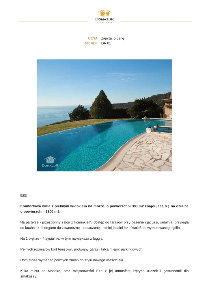 CENA: Zapytaj o cenę NR REF: DA 01 EZE Komfortowa willa z pięknym widokiem na morze, o powierzchni 380 m2 znajdującą się na działce o powierzchni 3800 m2. Na parterze - przestronny salon z kominkiem, dostęp do tarasów przy basenie i jacuzzi, jadalnia, przyległa do kuchni, z dostępem do zewnętrznej, zadaszonej, letniej jadalni jak również do wymurowanego grilla. Na 1 piętrze - 4 sypialnie, w tym największa z loggią. Pełnych rozmiarów kort tenisowy, podwójny garaż i kilka miejsc parkingowych. Dom może wymagać pewnych zmian do stylu nowego właściciela. Kilka minut od Monako, oraz miejscowości Eze z jej atmosferą krętych uliczek i gastronomii dla smakoszy. Dom azur Luxury Hom es Phone: 0033 640615143 Em ail: w [email protected] domazurfrance.com