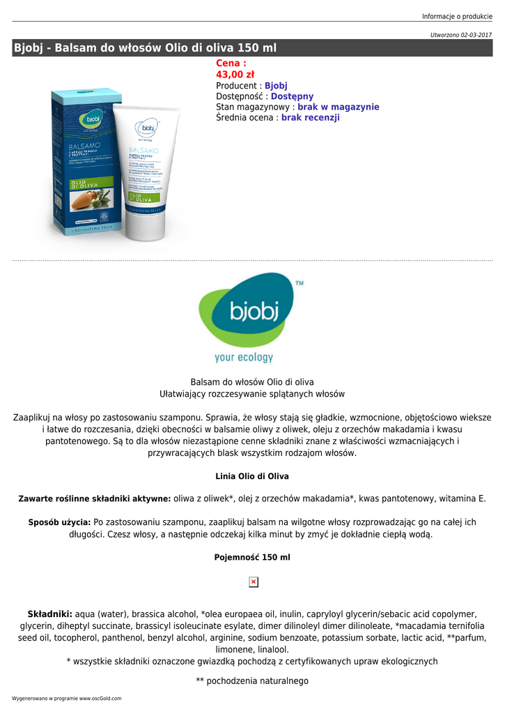 Informacje o produkcie Utworzono 02-03-2017 Bjobj - Balsam do włosów Olio di oliva 150 ml Cena : 43,00 zł Producent : Bjobj Dostępność : Dostępny Stan magazynowy : brak w magazynie Średnia ocena : brak recenzji Balsam do włosów Olio di oliva Ułatwiający rozczesywanie splątanych włosów Zaaplikuj na włosy po zastosowaniu szamponu. Sprawia, że włosy stają się gładkie, wzmocnione, objętościowo wieksze i łatwe do rozczesania, dzięki obecności w balsamie oliwy z oliwek, oleju z orzechów makadamia i kwasu pantotenowego. Są to dla włosów niezastąpione cenne składniki znane z właściwości wzmacniających i przywracających blask wszystkim rodzajom włosów. Linia Olio di Oliva Zawarte roślinne składniki aktywne: oliwa z oliwek*, olej z orzechów makadamia*, kwas pantotenowy, witamina E. Sposób użycia: Po zastosowaniu szamponu, zaaplikuj balsam na wilgotne włosy rozprowadzając go na całej ich długości. Czesz włosy, a następnie odczekaj kilka minut by zmyć je dokładnie ciepłą wodą. Pojemność 150 ml Składniki: aqua (water), brassica alcohol, *olea europaea oil, inulin, capryloyl glycerin/sebacic acid copolymer, glycerin, diheptyl succinate, brassicyl isoleucinate esylate, dimer dilinoleyl dimer dilinoleate, *macadamia ternifolia seed oil, tocopherol, panthenol, benzyl alcohol, arginine, sodium benzoate, potassium sorbate, lactic acid, **parfum, limonene, linalool. * wszystkie składniki oznaczone gwiazdką pochodzą z certyfikowanych upraw ekologicznych ** pochodzenia naturalnego Wygenerowano w programie www.oscGold.com Produkt certyfikowany HF