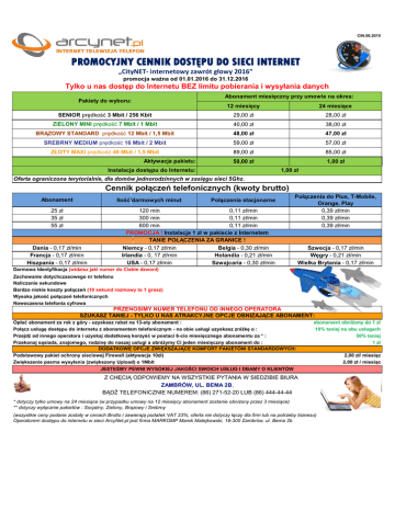 CIN.08.2015 PROMOCYJNY CENNIK DOSTĘPU DO SIECI INTERNET „CityNET- internetowy zawrót głowy 2016” promocja ważna od 01.01.2016 do 31.12.2016 Tylko u nas dostęp do Internetu BEZ limitu pobierania i wysyłania danych Abonament miesięczny przy umowie na okres: Pakiety do wyboru: 12 miesięcy 24 miesiące SENIOR prędkość 3 Mbit / 256 Kbit 29,00 zł 28,00 zł ZIELONY MINI prędkość 7 Mbit / 1 Mbit 40,00 zł 38,00 zł BRĄZOWY STANDARD prędkość 12 Mbit / 1,5 Mbit 48,00 zł 47,00 zł SREBRNY MEDIUM prędkość 16 Mbit / 2 Mbit 59,00 zł 57,00 zł ZŁOTY MAXI prędkość 40 Mbit / 1,5 Mbit 89,00 zł 85,00 zł Aktywacja pakietu: 50,00 zł Instalacja dostępu do Internetu: 1,00 zł 1,00 zł Oferta ograniczona terytorialnie, dla domów jednorodzinnych w zasięgu sieci 5Ghz. Cennik połączeń telefonicznych (kwoty brutto) Ilość darmowych minut Abonament 25 zł 35 zł 55 zł Dania - 0,17 zł/min Francja - 0,17 zł/min Hiszpania - 0,17 zł/min Połączenia stacjonarne 120 min 0,11 zł/min 300 min 0,11 zł/min 600 min 0,11 zł/min PROMOCJA ! Instalacja 1 zł w pakiecie z Internetem TANIE POŁĄCZENIA ZA GRANICE ! Niemcy - 0,17 zł/min Belgia - 0,30 zł/min Irlandia - 0, 17 zł/min Holandia - 0,21 zł/min USA - 0,17 zł/min Szwajcaria - 0,30 zł/min Połączenia do Plus, T-Mobile, Orange, Play 0,39 zł/min 0,39 zł/min 0,39 zł/min Szwecja - 0,17 zł/min Węgry - 0,21 zł/min Wielka Brytania - 0,17 zł/min Darmowa Identyfikacja (widzisz jaki numer do Ciebie dzwoni) Zachowanie dotychczasowego nr telefonu Naliczanie sekundowe Bardzo niskie koszty połączeń (10 sekund rozmowy to 1 grosz) Wysoka jakość połączeń telefonicznych Nowoczesna telefonia cyfrowa PRZENOSIMY NUMER TELEFONU OD INNEGO OPERATORA SZUKASZ TANIEJ - TYLKO U NAS ATRAKCYJNE OPCJE OBNIŻAJĄCE ABONAMENT: Opłać abonament za rok z góry - uzyskasz rabat na 13-sty abonament : Połącz usługę dostępu do internetu z abonamentem telefonicznym - na obie usługi uzyskasz zniżkę o : Przejdź od innego operatora i uzyskaj dodatkową korzyść w postaci 6-cio miesięcznego abonamentu za * : Przekonaj sąsiada, znajomego, rodzinę do naszej usługi a obniżymy Ci jeden miesięczny abonament do : DODATKOWE OPCJE ZWIĘKSZAJĄCE KOMFORT PAKIETÓW STANDARDOWYCH: Podstawowy pakiet ochrony sieciowej Firewall (aktywacja 10zł) Zwiększenie pasma wysyłania (zwiększony Upload) o 1Mbit JESTEŚMY PEWNI WYSOKIEJ JAKOŚCI SWOICH USŁUG I DBAMY O KLIENTÓW abonament obniżony do 1 zł 10% taniej na obu usługach 50% taniej 1 zł Z CHĘCIĄ ODPOWIEMY NA WSZYSTKIE PYTANIA W SIEDZIBIE BIURA ZAMBRÓW, UL. BEMA 2B, BĄDŹ TELEFONICZNIE NUMEREM: (86) 271-52-20 LUB (86) 444-44-44 * dotyczy tylko umowy na 24 miesiące (w przypadku umowy na 12 miesięcy abonament zostanie obnizony przez 3 miesiące) ** dotyczy wyłącznie pakietów : Socjalny, Zielony, Brązowy i Srebrny (wszystkie ceny podane zostały w cenach Brutto i zawierają podatek VAT 23%, oferta nie dotyczy łączy dla firm lub na potrzeby biznesu) Operatorem dostępu do internetu w sieci ArcyNet.pl jest firma MARKOMP Marek Matejkowski, 18-300 Zambrów, ul. Bema 2b 2,00 zł/ miesiąc 2,00 zł / miesiąc