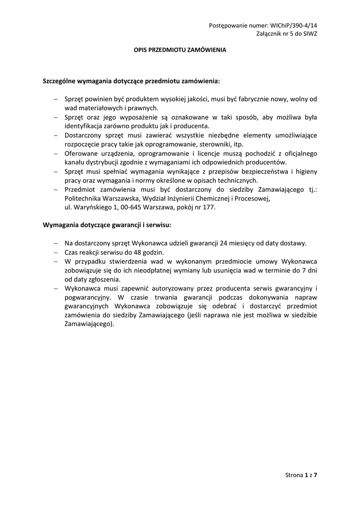Postępowanie numer: WIChiP/390-4/14 Załącznik nr 5 do SIWZ OPIS PRZEDMIOTU ZAMÓWIENIA Szczególne wymagania dotyczące przedmiotu zamówienia: − Sprzęt powinien być produktem wysokiej jakości, musi być fabrycznie nowy, wolny od wad materiałowych i prawnych. − Sprzęt oraz jego wyposażenie są oznakowane w taki sposób, aby możliwa była identyfikacja zarówno produktu jak i producenta. − Dostarczony sprzęt musi zawierać wszystkie niezbędne elementy umożliwiające rozpoczęcie pracy takie jak oprogramowanie, sterowniki, itp. − Oferowane urządzenia, oprogramowanie i licencje muszą pochodzić z oficjalnego kanału dystrybucji zgodnie z wymaganiami ich odpowiednich producentów. − Sprzęt musi spełniać wymagania wynikające z przepisów bezpieczeństwa i higieny pracy oraz wymagania i normy określone w opisach technicznych. − Przedmiot zamówienia musi być dostarczony do siedziby Zamawiającego tj.: Politechnika Warszawska, Wydział Inżynierii Chemicznej i Procesowej, ul. Waryńskiego 1, 00-645 Warszawa, pokój nr 177. Wymagania dotyczące gwarancji i serwisu: − Na dostarczony sprzęt Wykonawca udzieli gwarancji 24 miesięcy od daty dostawy. − Czas reakcji serwisu do 48 godzin. − W przypadku stwierdzenia wad w wykonanym przedmiocie umowy Wykonawca zobowiązuje się do ich nieodpłatnej wymiany lub usunięcia wad w terminie do 7 dni od daty zgłoszenia. − Wykonawca musi zapewnić autoryzowany przez producenta serwis gwarancyjny i pogwarancyjny. W czasie trwania gwarancji podczas dokonywania napraw gwarancyjnych Wykonawca zobowiązuje się odebrać i dostarczyć przedmiot zamówienia do siedziby Zamawiającego (jeśli naprawa nie jest możliwa w siedzibie Zamawiającego). Strona 1 z 7 Postępowanie numer: WIChiP/390-4/14 Załącznik nr 5 do SIWZ POZYCJA 1 Komputer stacjonarny (All in One) – 1 szt. Parametry techniczne Typ Procesor Płyta Główna Pamięć RAM Dyski Karta graficzna Karta muzyczna Głośniki Wbudowane napędy optyczne Akcesoria dodatkowe Ekran System operacyjny Warunki gwarancji Komputer stacjonarny typu All in One Procesor o parametrach nie gorszych niż parametry procesora „AMD A8-5550M (4 rdzenie, od 2.10 GHz do 3.10 GHz, 4 MB cache)” Płyta główna o parametrach nie gorszych niż parametry płyty głównej „Asus Eee Top ET2221AGKR” 8GB (DIMM DDR3, 1600MHz) Dysk o parametrach nie gorszych niż parametry dysku „1000 GB SATA 7200 obr.” Karta graficzna o parametrach nie gorszych niż parametry karty graficznej „AMD Radeon HD 8670M” Zintegrowana karta dźwiękowa zgodna z Intel High Definition Audio Wbudowane głośniki stereo, wbudowany mikrofon Nagrywarka DVD+/-RW DualLayer Mysz bezprzewodowa Klawiatura bezprzewodowa Pilot zdalnego sterowania Przekątna ekranu: 21,5” Nominalna rozdzielczość: 1920x1080 (FullHD) Zainstalowany system operacyjny Microsoft Windows 8 PL (wersja 64-bitowa) z nośnikiem i certyfikatem firmy Microsoft. 24 miesiące od daty dostawy. Serwis urządzeń musi być realizowany przez producenta lub autoryzowanego partnera serwisowego producenta. pozostałe parametry nie gorsze jak: All in One Asus Eee Top ET2221AGKR Strona 2 z 7 Postępowanie numer: WIChiP/390-4/14 Załącznik nr 5 do SIWZ POZYCJA 2 Drukarka atramentowa – 1 szt. Parametry techniczne Technologia druku Druk photo Max. rozmiar podajnika Szybkość druku mono Szybkość druku kolor Rozdzielczość mono (pion x poziom) Rozdzielczość kolor (pion x poziom) Złącze Pojemość podajnika atramentowa Tak A4 20 str/min 16 str/min 1200 dpi x 600 dpi 1200 dpi x 1200 dpi USB 250 arkuszy - wbudowany interfejs Ethernet 10/100 Base-TX (RJ45) Inne - wbudowany interfejs bezprzewodowy 802.11b/g/n - automatyczny moduł druku dwustronnego Wyświetlacz LCD z ikonami Dołączone akcesoria Zasilacz pozostałe parametry nie gorsze jak: HP Officejet Pro 8100 WiFi POZYCJA 3 Urządzenie wielofunkcyjne – 3 szt. Parametry techniczne Typ Urządzenie wielofunkcyjne - kopiarka Podstawowe funkcje - skaner - drukarka Technologia druku atramentowa Maksymalna szybkość druku (mono) 16 str./min. Maksymalna szybkość druku (kolor) 9 str./min. - 1 x USB - 1 x RJ45 (karta sieciowa) Złącza zewnętrzne - bezprzewodowa sieć Ethernet 802.11 b/g/n (WiFi) - 1 x RJ11 (fax) Maks. rozmiar nośnika A4 - kolorowy Typ skanera - stolikowy pozostałe parametry nie gorsze jak: HP Officejet 6700 Premium WiFi MFP Strona 3 z 7 Postępowanie numer: WIChiP/390-4/14 Załącznik nr 5 do SIWZ POZYCJA 4 Zasilacz awaryjny – 1 szt. Parametry techniczne Typ Zasilacz awaryjny UPS Moc 420 W Moc pozorna 700 VA Napięcie wej./wyj. 230 V Kształt napięcia wyj. sinusoidalny Czas podtrzymania min. 5 minut Częstotliwość prądu akumulatora 50 Hz Ilość gniazd wyj. 2 pozostałe parametry nie gorsze jak: UPS EVER ECO Pro 700 CDS Strona 4 z 7 Postępowanie numer: WIChiP/390-4/14 Załącznik nr 5 do SIWZ POZYCJA 5 Notebook – 1 szt. Parametry techniczne Procesor o parametrach nie gorszych niż parametry procesora: Intel Core i5-4200M Procesor - Liczba rdzeni: 2 - Częstotliwość taktowania: od 2.5 GHz do 3.1 GHz, - pamięć podręczna (cache): 3 MB Pamięć o pojemności min.: Pamięć RAM 8 GB (SO-DIMM DDR3, 1600 MHz) Rodzaj dysku o parametrach nie gorszych niż: Dysk twardy 1000 GB SATA 5400 obr. Express Cache 8 GB Wbudowane napędy optyczne Nagrywarka DVD+/-RW DualLayer Przekątna: 15,6" Nominalna rozdzielczość: 1366 x 768 (HD) Ekran Rodzaj matrycy: Matowy Rodzaj podświetlenia: LED Chipset o parametrach nie gorsza niż parametry : Intel Lynx Płyta główna Point Karta graficzna o parametrach nie gorszych niż parametry karty graficznej: Karta graficzna NVIDIA GeForce GT 740M - ilość pamięci: 2048 MB, GDDR 3 - typ pamięci: własna Wbudowane głośniki stereo Dźwięk Wbudowany mikrofon Zintegrowana karta dźwiękowa Kamera internetowa Wbudowana Wi-Fi 802.11 b/g/n LAN 10/100 Mbps Łączność Intel Wireless Display (WiDi) Bluetooth DC-in (wejście zasilania) - 1 szt. VGA (D-sub) - 