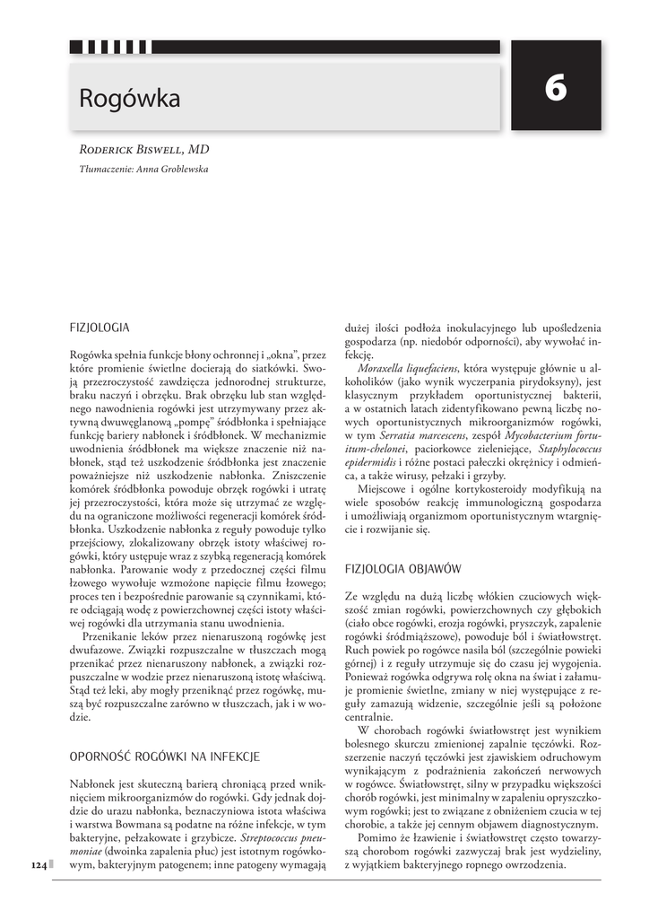 6 Rogówka Roderick Biswell, MD Tłumaczenie: Anna Groblewska FIZJOLOGIA Rogówka spełnia funkcje błony ochronnej i „okna”, przez które promienie świetlne docierają do siatkówki. Swoją przezroczystość zawdzięcza jednorodnej strukturze, braku naczyń i obrzęku. Brak obrzęku lub stan względnego nawodnienia rogówki jest utrzymywany przez aktywną dwuwęglanową „pompę” śródbłonka i spełniające funkcję bariery nabłonek i śródbłonek. W mechanizmie uwodnienia śródbłonek ma większe znaczenie niż nabłonek, stąd też uszkodzenie śródbłonka jest znaczenie poważniejsze niż uszkodzenie nabłonka. Zniszczenie komórek śródbłonka powoduje obrzęk rogówki i utratę jej przezroczystości, która może się utrzymać ze względu na ograniczone możliwości regeneracji komórek śródbłonka. Uszkodzenie nabłonka z reguły powoduje tylko przejściowy, zlokalizowany obrzęk istoty właściwej rogówki, który ustępuje wraz z szybką regeneracją komórek nabłonka. Parowanie wody z przedocznej części filmu łzowego wywołuje wzmożone napięcie filmu łzowego; proces ten i bezpośrednie parowanie są czynnikami, które odciągają wodę z powierzchownej części istoty właściwej rogówki dla utrzymania stanu uwodnienia. Przenikanie leków przez nienaruszoną rogówkę jest dwufazowe. Związki rozpuszczalne w tłuszczach mogą przenikać przez nienaruszony nabłonek, a związki rozpuszczalne w wodzie przez nienaruszoną istotę właściwą. Stąd też leki, aby mogły przeniknąć przez rogówkę, muszą być rozpuszczalne zarówno w tłuszczach, jak i w wodzie. OPORNOŚĆ ROGÓWKI NA INFEKCJE 124 ❚ Nabłonek jest skuteczną barierą chroniącą przed wniknięciem mikroorganizmów do rogówki. Gdy jednak dojdzie do urazu nabłonka, beznaczyniowa istota właściwa i warstwa Bowmana są podatne na różne infekcje, w tym bakteryjne, pełzakowate i grzybicze. Streptococcus pneumoniae (dwoinka zapalenia płuc) jest istotnym rogówkowym, bakteryjnym patogenem; inne patogeny wymagają dużej ilości podłoża inokulacyjnego lub upośledzenia gospodarza (np. niedobór odporności), aby wywołać infekcję. Moraxella liquefaciens, która występuje głównie u alkoholików (jako wynik wyczerpania pirydoksyny), jest klasycznym przykładem oportunistycznej bakterii, a w ostatnich latach zidentyfikowano pewną liczbę nowych oportunistycznych mikroorganizmów rogówki, w tym Serratia marcescens, zespół Mycobacterium fortuitum-chelonei, paciorkowce zieleniejące, Staphylococcus epidermidis i różne postaci pałeczki okrężnicy i odmieńca, a także wirusy, pełzaki i grzyby. Miejscowe i ogólne kortykosteroidy modyfikują na wiele sposobów reakcję immunologiczną gospodarza i umożliwiają organizmom oportunistycznym wtargnięcie i rozwijanie się. FIZJOLOGIA OBJAWÓW Ze względu na dużą liczbę włókien czuciowych większość zmian rogówki, powierzchownych czy głębokich (ciało obce rogówki, erozja rogówki, pryszczyk, zapalenie rogówki śródmiąższowe), powoduje ból i światłowstręt. Ruch powiek po rogówce nasila ból (szczególnie powieki górnej) i z reguły utrzymuje się do czasu jej wygojenia. Ponieważ rogówka odgrywa rolę okna na świat i załamuje promienie świetlne, zmiany w niej występujące z reguły zamazują widzenie, szczególnie jeśli są położone centralnie. W chorobach rogówki światłowstręt jest wynikiem bolesnego skurczu zmienionej zapalnie tęczówki. Rozszerzenie naczyń tęczówki jest zjawiskiem odruchowym wynikającym z podrażnienia zakończeń nerwowych w rogówce. Światłowstręt, silny w przypadku większości chorób rogówki, jest minimalny w zapaleniu opryszczkowym rogówki; jest to związane z obniżeniem czucia w tej chorobie, a także jej cennym objawem diagnostycznym. Pomimo że łzawienie i światłowstręt często towarzyszą chorobom rogówki zazwyczaj brak jest wydzieliny, z wyjątkiem bakteryjnego ropnego owrzodzenia. ❚ Rogówka Drobne barwiące się fluoresceiną ubytki nabłonka; głównie zajęta dolna trzecia część rogówki Typowo drzewkowate (sporadycznie okrągłe lub owalne) z obrzękiem i zwyrodnieniem Bardziej rozsiane niż zmiany w HSK, sporadycznie liniowe (pseudodrzewkowate) 1. Gronkowcowe zapalenie rogówki 2. Opryszczkowe zapalenie rogówki (herpetic keratitis – HSK) 3. Opryszczkowe zapalenie rogówki Drobne barwiące się fluoresceiną ubytki Drobne wielopostaciowe, barwiące się flu- Drobne barwiące się fluoresceiną nieregularnabłonka; rozsiane, ale najbardziej widoczne oresceiną uszkodzenia nabłonka i erozje; ty- ne ubytki nabłonka; przede wszystkim zajęta w obszarze źrenicy powe są filamenty śluzowe nabłonka; przede dolna połowa rogówki wszystkim zajęta dolna połowa rogówki 4. Adenowirusowe zapalenie rogówki 5. Zapalenie rogówki w zespole Sjögrena 6. Zapalenie rogówki ekspozycyjne – z powodu niedomykalności lub wytrzeszczu Drobne barwiące się fluoresceiną ubytki Plamkowate, szare, nieprzezroczyste, przyPlamkowaty obrzęk nabłonka; rozsiany, ale najbardziej widoczny w szparze powiekowej, nabłonka z kropkowanym obrzękiem komórpominające syncytium zmiany, najbardziej godz. 9.00-3.00. kowym, wiry nabłonkowe widoczne w górnej części źrenicy. Czasami tworzy się nieprzezroczysta tarczka nabłonka 7. Wiosenne zapalenie rogówki i spojówek 8. Neurotroficzne zapalenie rogówki – następstwo opryszczki, półpaśca i zniszczenia zwoju Gassera 9. Polekowe zapalenie rogówki – szczególnie po antybiotykach i środkach konserwujących Ogniska obrzękniętych komórek nabłonka, okrągłe lub owalne, jeśli choroba jest aktywna – uniesione Drobne barwiące się fluoresceiną ubytki nabłonka górnej trzeciej części rogówki; podczas zaostrzeń filamenty, przekrwienie gałkowe, pogrubiały zrogowaciały rąbek, mikrołuszczka Ubytki typu wirusowego przypominające występujące w SPK; w obszarze źrenicy 10. Powierzchowne punktowe zap