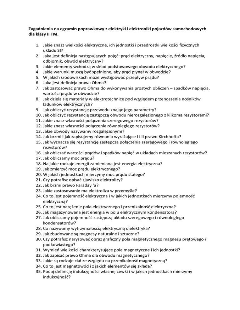Zagadnienia na egzamin poprawkowy z elektryki i elektroniki pojazdów samochodowych dla klasy II TM. 1. Jakie znasz wielkości elektryczne, ich jednostki i przedrostki wielkości fizycznych układu SI? 2. Jaka jest definicja następujących pojęć: prąd elektryczny, napięcie, źródło napięcia, odbiornik, obwód elektryczny? 3. Jakie elementy wchodzą w skład podstawowego obwodu elektrycznego? 4. Jakie warunki muszą być spełnione, aby prąd płynął w obwodzie? 5. W jakich środowiskach może występować przepływ prądu? 6. Jaka jest definicja prawa Ohma? 7. Jak zastosować prawo Ohma do wykonywania prostych obliczeń – spadków napięcia, wartości prądu w obwodzie? 8. Jak dzielą się materiały w elektrotechnice pod względem przenoszenia nośników ładunków elektrycznych? 9. Jak obliczyć rezystancję przewodu znając jego parametry? 10. Jak obliczyć rezystancję zastępczą obwodu nierozgałęzionego z kilkoma rezystorami? 11. Jakie znasz własności połączenia szeregowego rezystorów? 12. Jakie znasz własności połączenia równoległego rezystorów? 13. Jakie obwody nazywamy rozgałęzionymi? 14. Jak brzmi i jak zapisujemy równania wyrażające I i II prawo Kirchhoffa? 15. Jak wyznacza się rezystancję zastępczą połączenia szeregowego i równoległego rezystorów? 16. Jak obliczać wartości prądów i spadków napięć w układach mieszanych rezystorów? 17. Jak obliczamy moc prądu? 18. Na jakie rodzaje energii zamieniana jest energia elektryczna? 19. Jak zmierzyć moc prądu elektrycznego? 20. W jakich jednostkach mierzymy moc prądu stałego? 21. Czy potrafisz opisać zjawisko elektrolizy? 22. Jak brzmi prawo Faraday ‘a? 23. Jakie zastosowanie ma elektroliza w przemyśle? 24. Co to jest pojemność elektryczna i w jakich jednostkach mierzymy pojemność elektryczną? 25. Co to jest natężenie pola elektrycznego i przenikalność elektryczna? 26. Jak magazynowana jest energia w polu elektrycznym kondensatora? 27. Jak obliczamy pojemność zastępczą układu szeregowego i równoległego kondensatorów? 28. Co nazywamy wytrzymałością elektryczną dielektryka? 29. Jak zbudowane są magnesy naturalne i sztuczne? 30. Czy potrafisz narysować obraz graficzny pola magnetycznego magnesu prętowego i podkowiastego? 31. Wymień wielkości charakteryzujące pole magnetyczne i ich jednostki? 32. Jak zapisać prawo Ohma dla obwodu magnetycznego? 33. Jakie są rodzaje ciał ze względu na przenikalność magnetyczną? 34. Co to jest magnetowód i z jakich elementów się składa? 35. Podaj definicję indukcyjności własnej cewki i w jakich jednostkach mierzymy indukcyjność? 36. Jak wyznacza się kierunek siły elektromotorycznej indukowanej w przewodniku poruszającym się w polu magnetycznym? 37. Czy możesz wskazać sposób (sposoby) wykorzystania zjawiska indukcji wzajemnej? 38. Jak obliczyć wartość siły elektromotorycznej SEM indukowanej w przewodzie poruszającym się w polu magnetycznym? 39. Jaka jest zasada działania silnika prądu stałego? 40. Jaka jest zasada działania prądnicy prądu stałego? 41. Jaki prąd nazywamy prądem zmiennym? 42. Jaka maszyna elektryczna wytwarza prąd zmienny? 43. Jakie znasz parametry przebiegu sinusoidalnego? 44. Jaka jest częstotliwość napięcia w sieci przemysłowej? 45. Jakim wzorem ogólnym określone jest napięcie sinusoidalne? 46. W jakich jednostkach mierzymy okres napięcia? 47. Określ wartość skuteczną napięcia sinusoidalnego. 48. Jaka jest wartość średnia napięcia sinusoidalnego za okres przebiegu? 49. Jaki wykres nazywamy wektorowym, a jaki czasowym? 50. Jakie jest przesunięcie fazy między prądem i napięciem na idealnej rezystancji? 51. Jakie jest przesunięcie fazy między prądem i napięciem na idealnej cewce? 52. Jakie jest przesunięcie fazy między prądem i napięciem na idealnym kondensatorze? 53. Jak obliczamy reaktancję indukcyjną i pojemnościową? 54. Jakie dwie składowe ma moc chwilowa prądu sinusoidalnego? 55. Jaka jest zależność między mocą czynną, mocą bierną i mocą pozorną prądu sinusoidalnego? 56. Jaką moc pobiera rezystor idealny, a jaką cewka idealna? 57. Jakie cechy ma prąd przemienny trójfazowy? 58. Jak można skojarzyć układy trójfazowe? 59. Jaka jest różnica między wielkościami fazowymi, a przewodowymi? 60. Kiedy układ trójfazowy jest symetryczny? 61. Jakie rozróżniamy połączenia w gwiazdę? 62. Jaka jest zależność między wartościami skutecznymi napięć fazowych i międzyfazowych w układzie trójfazowym symetrycznym? 63. Na czym polega połączenie uzwojeń w trójkąt? 64. Jaką wartość ma suma sił elektromotorycznych w układzie trójfazowym symetrycznym? 65. Wypisz wzory na obliczanie mocy: czynnej, biernej i pozornej w układach trójfazowych symetrycznych? 66. Jaką maszynę nazywamy transformatorem? 67. Jak zbudowany jest transformator? 68. Jak dzielimy transformatory? 69. Co to jest przekładnia napięciowa transformatora? 70. Co to jest przekładnia prądowa transformatora? 71. Co to jest przekładnia zwojowa transformatora? 72. Jak dzielimy maszyny prądu stałego, ze względu na sposób wzbudzenia? 73. Jakie dane zawiera tabliczka znamionowa urządzenia elektrycznego? 74. Jak znasz rodzaje maszyn prądu przemiennego jednofazowego? 75. Jakie znasz rodzaje maszyn prądu trójfazowego? 76. Jak powstaje prąd przemienny trójfazowy?