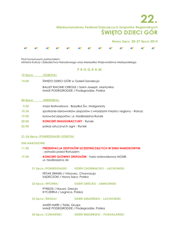 22. Międzynarodowy Festiwal Dziecięcych Zespołów Regionalnych ŚWIĘTO DZIECI GÓR Nowy Sącz, 20-27 lipca 2014 Pod honorowym patronatem: Ministra Kultury i Dziedzictwa Narodowego oraz Marszałka Województwa Małopolskiego PROGRAM 19 lipca /SOBOTA/ 14.00 ŚWIĘTO DZIECI GÓR w Galerii Sandecja BALLET RACINE CREOLE / Saint-Joseph, Martynika MAŁE PODEGRODZIE / Podegrodzie, Polska 20 lipca 9.00 /NIEDZIELA/ msza festiwalowa - Bazylika Św. Małgorzaty 10.30 spotkanie kierowników zespołów z władzami miasta i regionu - Ratusz 19.00 korowód zespołów: ul. Nadbrzeżna-Rynek 20.00 KONCERT INAUGURACYJNY - Rynek 22.00 pokaz sztucznych ogni - Rynek 21-26 lipca /PONIEDZIAŁEK-SOBOTA/ DNI NARODOWE 11.00 PREZENTACJA ZESPOŁÓW UCZESTNICZĄCYCH W DNIU NARODOWYM - estrada przed Ratuszem 19.00 KONCERT GŁÓWNY ZESPOŁÓW - hala widowiskowa MOSiR, ul. Nadbrzeżna 34 21 lipca /PONIEDZIAŁEK/ DZIEŃ CHORWACKO - LACHOWSKI PETAR ZRINSKI / Vrbovec, Chorwacja SĄDECZOKI / Nowy Sącz, Polska 22 lipca /WTOREK/ DZIEŃ GRECKO - ŁEMKOWSKI PYRSOS / Nausa, Grecja KYCZERKA / Legnica, Polska 23 lipca /ŚRODA/ DZIEŃ GRUZIŃSKO - LACHOWSKI AMER-IMERI / Tbilisi, Gruzja MAŁE PODEGRODZIE / Podegrodzie, Polska 24 lipca /CZWARTEK/ DZIEŃ WĘGIERSKO - PODHALAŃSKI CSICSERGŐK / Üllés, Węgry MALI HAMERNICY / Kraków, Polska 25 lipca /PIĄTEK/ DZIEŃ KREOLSKO - BABIOGÓRSKI BALLET RACINE CREOLE / Saint-Joseph, Martynika JUZYNA / Zawoja, Polska 26 lipca /SOBOTA/ DZIEŃ AUSTRIACKO - LACHOWSKI ROSSECKER / Bruck an der Mur, Austria PNIOKI / Sadek-Kostrza, Polska 27 LIPCA 9.00 /NIEDZIELA/ msza festiwalowa - Bazylika Św. Małgorzaty 10.00 pożegnanie miasta - Rynek 11.00 konferencja prasowa - Małopolskie Centrum Kultury SOKÓŁ, sala Sichrawy 19.00 KONCERT FINAŁOWY - hala widowiskowa MOSiR, ul. Nadbrzeżna 34 Wydarzenia towarzyszące: 4 lipca - 03 sierpnia, wystawa „Dziecięca przyjaźń buduje pokój świata dorosłych” - Galeria SOKÓŁ, ul. Długosza 3 21-27 lipca, godz. 18.00-21.00, kiermasz twórczości ludowej i rękodzieła artystycznego - plac przed Halą MOSiR, ul. Nadbrzeżna 34 Estrady plenerowe poza Nowym Sączem: 24 lipca, godz. 18.00 25 lipca, godz. 18.30 26 lipca, godz. 17.00 26 lipca, godz. 17.00 26 lipca, godz. 18.00 Gródek nad Dunajcem, scena w centrum przy GOK Bardejovskie Kupele - Słowacja, scena pod kolumnadą Biecz, estrada w Rynku Limanowa, Muszla Koncertowa w Parku Miejskim Muszyna, Amfiteatr Zapopradzie Zajęcia edukacyjne: Dzieciaki lubią zwierzaki - warsztaty plastyczne dla dzieci z klas II–VI SP 23-25 lipca, godz. 11.00-12.00 - sala edukacyjna BWA SOKÓŁ Warsztaty wykorzystujące motyw zwierząt, zamieszkujących Węgry, Grecję oraz Chorwację. W czasie zajęć dzieci będą mogły przyjrzeć się zwyczajom żółtopuzika bałkańskiego, żółwia greckiego, węża Eskulapa i innych, mniej znanych zwierzaków. Poszukają zwierzęcych tropów w sztuce współczesnej i... spróbują przełożyć zdobytą wiedzę na płócienne obrusy, szklane naczynia, malowane torby. 16. Ogólnopolskie Warsztaty Instruktorskie Tematyka: TAŃCE KRAKOWIAKÓW ZACHODNICH W OPRACOWANIU DLA DZIECI I MŁODZIEŻY. www.swietodziecigor.pl