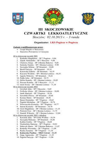 III SKOCZOWSKIE CZWARTKI LEKKOATLETYCZNE Skoczów; 02.10.2013 r. – 3 runda Organizator: LKS Pogórze w Pogórzu Zadanie współfinansowane przez: • Urząd Miejski w Skoczowie • Starostwo Powiatowe w Cieszynie 60 m dziewcząt rocznik 2001 1. Rodenko Magdalena – SP 7 Pogórze – 8,86 2. Ziętek Aleksandra – SP 3 Skoczów – 9,46 3. Cholewa Alicja – SP 2 Brenna Bukowa – 9,68 4. Setnicka Natalia – SP 1 Brenna Leśnica – 9.99 5. Szczypka Milena – SP Strumień – 10,08 6. Berek Patrycja – SP Strumień – 10,14 7. Kurowska Izabela – SP Strumień – 10,19 8. Kuczera Wioletta – SP 1 Brenna Leśnica – 10,35 9. Jagieła Wiktoria – SP Strumień – 10,41 10. Pudło Julia – SP Strumień – 10,75 11. Heller Kamila – SP 1 Brenna Leśnica – 10,85 12. Procner Kamila – SP 3 Skoczów – 11,11 13. Greń Iwona – SP 1 Brenna Leśnica – 11,34 60 m dziewcząt rocznik 2002 1. Grzybek Julia – SP 3 Skoczów – 9,69 2. Ferfecka Alicja – SP 1 Brenna Leśnica – 10,09 3. Janik Martyna – SP 7 Pogórze – 10,26 4. Szweblik Oliwia – SP Strumień – 10,44 5. Kornas Marta – SP Strumień – 10,56 6. Banot Dominika – SP 7 Pogórze – 10,62 7. Pagieła Michalina – SP 7 Pogórze – 10,74 8. Wawrzeczko Kornelia – SP 7 Pogórze – 10,77 9. Staroń Kornelia – SP Strumień – 10,78 10. Greń Magdalena – SP 1 Brenna Leśnica – 11,35 11. Pietrzyk Ewa – SP 1 Brenna Leśnica – 11,75 12. Staniek Wiktoria – SP 1 Brenna Leśnica – 12,04 60 m dziewcząt rocznik 2003 i młodsze 1. Kocurek Julia – SP Górki Wielkie – 10,34 2. Szczypka Roksana – SP Strumień – 10,46 3. Kubies Emilia – SP 7 Pogórze – 10,68 4. Niedzielska Martyna – SP 7 Pogórze – 10,81 5. Hubczyk Marta – SP 2 Brenna Bukowa – 11,07 6. Rodenko Weronika – SP 7 Pogórze – 11,09 7. Rucka Zuzanna – SP 7 Pogórze – 11,10 8. Kukuczka Paulina – MKS Ustroń – 11,33 9. Zając Agnieszka – SP 7 Pogórze – 11,35 10. Pagieła Patrycja – SP 7 Pogórze – 11,86 11. Sikora Maja – SP 2 Brenna Bukowa – 11,87 12. Duraj Agnieszka – SP 1 Brenna Leśnica – 12,14 13. Greń Anna – SP 1 Brenna Leśnica – 12,16 14. Podżorska Magdalena – SP 2 Brenna Bukowa – 12,24 15. Greń Julia – SP 1 Brenna Leśnica – 12,41 16. Korzonek Martyna – SP 7 Pogórze – 12,94 17. Przybyła Kinga – SP 2 Brenna Bukowa – 13,07 18. Stanna Karolinna – MKS Ustroń – 13,48 60 m chłopców rocznik 2001 1. Ciałoń Jakub – SP Strumień – 9,25 2. Bojda Sebastian – SP 1 Brenna Leśnica – 9,96 3. Wojtas Jakub – SP 3 Skoczów – 10,09 4. Słowiok Mateusz – SP 1 Brenna Leśnica – 10,36 5. Gaszczyk Tomasz – SP 1 Brenna Leśnica – 11,68 60 m chłopców rocznik 2002 1. Wilczyński Kamil – SP Strumień – 8,74 2. Cieślar Konrad – SP 1 Brenna Leśnica – 9,51 3. Kłósko Grzegorz – SP 2 Brenna Bukowa – 9,76 4. Ochodek Dominik – SP Strumień – 9,81 5. Uchyła Kacper – SP Strumień – 9,85 6. Waleczek Jan – SP Strumień – 9,86 7. Maciąg Mateusz – SP Strumień – 10,36 8. Rękawek Kamil – SP Strumień – 10,42 9. Płonka Patryk – SP Strumień – 10,64 10. Tomaszko Tomasz – MKS Ustroń – 10,75 11. Habarta Igor – SP 7 Pogórze – 10,86 12. Gaszczyk Przemysław – SAP 1 Brenna Leśnica – 11,09 13. Grzywa Andrzej – SP Strumień – 11,55 14. Dłucik Szymon – SP 1 Brenna Leśnica – 11,92 60 m chłopców rocznik 2003 i młodsi 1. Rodenko Paweł – SP 7 Pogórze – 9,99 2. Kluz Kacper – MKS Ustroń – 10,08 3. Krysiński Krzysztof – MKS Ustroń – 10,40 4. Górecki Przemysław – SP 7 Pogórze – 10,74 5. Madzia Dawid – SP 1 Brenna Leśnica – 10,76 6. Kawulok Dominik – SP 1 Brenna Leśnica – 10.93 7. Fiedor Kamil – MKS Ustroń – 10,96 8. Rajski Niko – SP 7 Pogórze – 11,07 9. Klajmon Filip – MKS Ustroń – 11,11 10. Markuzel Paweł – MKS Ustroń – 11,41 11. Dybczyński Kacper – SP Górki Wielkie – 11,47 12. Heczko Szymon – MKS Ustroń – 11,66 13. Gawlas Dominik – SP 2 Brenna Bukowa – 11,88 14. Mikler Konrad – MKS Ustroń – 11,89 15. Greń Krzysztof – SP 2 Brenna Bukowa – 11,93 16. Puzoń Dawid – SP 2 Brenna Bukowa – 12,10 17. Paprota Oliwier – SP 3 Skoczów – 12,45 18. Moskała Robert – SP 1 Brenna Leśnica – 12,74 19. Greń Patryk – SP 1 Brenna Leśnica – 12,94 20. Greń Gabriel – SP 1 Brenna Leśnica – 13,18 21. Lorek Jakub – SP 1 Brenna Leśnica – 13,46 300 m dziewcząt rocznik 2001 1. Kobus Magdalena – SP 3 Skoczów – 53,41 2. Żwak Emilia – SP Ogrodzona – 54,08 3. Laszczok Anna – SP 2 Brenna Bukowa – 54,23 4. Chrapek Dominika – SP 2 Brenna Bukowa – 56,76 5. Holeksa Wiktoria – SP 2 Brenna Bukowa – 59,56 6. Taberska Natalia – SP 2 Brenna Bukowa – 60,58 7. Ratajek Nikola – SP 3 Skoczów – 63,76 300 m dziewcząt rocznik 2002 1. Chujeba Patrycja – SP 2 Brenna Bukowa – 57,08 2. Uchyła Alicja – SP 7 Pogórze – 59,46 3. Greń Agnieszka – SP 2 Brenna Bukowa – 63,34 4. Greń Bożena – SP 2 Brenna Bukowa – 66,88 5. Jurkowska Oliwia – SP Ogrodzona – 68,06 300 m dziewcząt rocznik 2003 i młodsze 1. Kmiecik Wiktoria – SP 2 Brenna Bukowa – 60,08 2. Greń Małgorzata - SP 2 Brenna Bukowa – 60,27 3. Lorek Zuzanna – SP 1 Brenna Leśnica – 61,84 4. Krzempek Nadia – SP 2 Brenna Bukowa – 62,96 300 m chłopców rocznik 2001 1. Wojtyła Wojciech – SP 7 Pogórze – 51,38 2. Żur Jakub – SP Strumień – 54,09 300 m chłopców rocznik 2002 1. Oleś Dawid – SP 1 Brenna Leśnica – 51,20 2. Niedoba Paweł – SP Górki Wielkie – 51,38 3. Szymala Mateusz – SP 5 Ochaby – 56,73 4. Wojtek Szymon – SP Strumień – 58,88 5. Krzempek Jakub – SP 2 Brenna Bukowa – 63,77 6. Herzyk Łukasz – SP 2 Brenna Bukowa – 67,06 300 m chłopców rocznik 2003 i młodsi 1. Kuczera Samuel – SP 1 Brenna Leśnica – 55,59 2. Oleś Daniel – SP 1 Brenna Leśnica – 62,51 600 m dziewcząt rocznik 2001 1. Chrapek