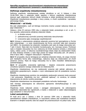 Specyfika zarządzania nieruchomościami mieszkaniowymi stanowiącymi własność osób fizycznych i prawnych z wyodrębnioną własnością lokali. Definicja wspólnoty mieszkaniowej Definicja wspólnoty mieszkaniowej została określona w art. 6 Ustawy z dnia 24.06.1994 roku o własności lokali, zgodnie z którym wspólnotę mieszkaniową stanowi ogół właścicieli, których lokale wchodzą w skład określonej nieruchomości. Wspólnota mieszkaniowa powstaje z mocy prawa, w chwili wydzielenia i sprzedaży pierwszego lokalu. Właściciel – od kiedy Kto jest właścicielem, czyli od którego momentu można uważać nabywcę lokalu za jego właściciela ? Ustawa z dnia 24 czerwca 1994 roku o własności lokali, przewiduje w art. w art. 7, trzy sposoby ustanowienia odrębnej własności lokalu: 1 - w drodze umowy 2 - jednostronnej czynności prawnej właściciela nieruchomości 3 - orzeczenia sądu znoszącego współwłasność Ad.1 Umowa o ustanowienie odrębnej własności powinna być sporządzona w formie aktu notarialnego – w razie niezachowania tej formy czynność taka jest nieważna (art.58KC). Do powstania tej własności niezbędny jest wpis do księgi wieczystej (art. 7 pkt 2 Uowl). Wpis taki ma charakter konstytucyjny, tzn. tworzący prawo. Ponieważ wpis w księdze wieczystej ma moc wsteczną od chwili złożenia wniosku o dokonanie wpisu, należy uznać, iż nabywca wyodrębnionego lokalu staje się właścicielem lokalu od dnia złożenia wniosku o wpis tego prawa do księgi wieczystej (art. 29 ustawy z dnia 6 lipca 1982 r. księgach wieczystych i hipotece). Ad.2 W przypadku zbycia istniejącej już odrębnej własności lokalu, do czego również jest niezbędna forma aktu notarialnego, nabywca staje się właścicielem od chwili zawarcia umowy. Wpis do księgi wieczystej ma tu tylko charakter deklaratoryjny (potwierdzający). Ad.3 W przypadku orzeczenia sądowego – dopiero orzeczenie prawomocne umożliwia wpisanie nowego właściciela we właściwej KW. Wspólnota mieszkaniowa nie ma osobowości prawnej jest jednak zaliczana do podmiotów gospodarczych, związku z czym zobowiązana jest do posiadania numeru REGON. Wspólnota mieszkaniowa pomimo nie posiadania osobowości prawnej może pozywać i być pozywana. Wspólnota ma tzw. „zdolność sądową”, co oznacza, że została dopuszczona do obrotu cywilno-prawnego. Wspólnota mieszkaniowa ma obowiązek posiadania rachunku bankowego. Jest również zobowiązana do dokonania zgłoszenia identyfikacyjnego w celu uzyskania NIP. Wspólnota może nabywać prawa i zaciągać zobowiązania. Za zobowiązania wspólnota odpowiada bez ograniczeń, a każdy z właścicieli w części odpowiadającej jego udziałowi w nieruchomości. Lokal samodzielny W myśl art.2 ust. 2 ustawy z dnia 24 czerwca 1994 roku o własności lokali, samodzielnym lokalem mieszkalnym, w rozumieniu ustawy jest wydzielona trwałymi ścianami w obrębie budynku izba lub zespół izb przeznaczonych na pobyt ludzi, które Specyfika zarządzania nieruchomościami mieszkaniowymi stanowiącymi własność osób fizycznych i prawnych z wyodrębnioną własnością lokali. w raz z pomieszczeniami pomocniczymi służą zaspokajaniu ich potrzeb mieszkaniowych. Przepis ten stosuje się również do samodzielnych lokali wykorzystywanych zgodnie z przeznaczeniem na cele inne niż mieszkaniowe. Spełnienie wymagań, o których mowa powyżej stwierdza starosta w formie zaświadczenia. Pomieszczenie przynależne do lokalu Do lokalu mogą przynależeć, jako jego części składowe, pomieszczenia choćby do niego bezpośrednio nie przylegały lub były położone w granicach nieruchomości gruntowej poza budynkiem, w którym wyodrębniono dany lokal, są to m.in.: piwnica, strych, komórka, garaż, zwane dalej „pomieszczeniami przynależnymi” Art. 2 ust. 4 Uowl. Ponieważ pomieszczenie przynależne określono jako część składową lokalu, nie jest możliwe zbycie samego pomieszczenia przynależnego, gdyż byłaby to czynność sprzeczna z art.47 § 1 KC, która określa iż część składowa rzeczy nie może być odrębnym przedmiotem własności i innych praw rzeczowych. Nieruchomość wspólna Z prawem własności lokalu nierozerwalnie związane jest prawo właściciel lokalu do udziału w nieruchomości wspólnej. Zgodnie z Art. 3 Uowl, w razie wyodrębnienia własności lokali właścicielowi przysługuje udział w nieruchomości wspólnej jako prawo związane z własnością lokalu. Nie można żądać zniesienia współwłasności nieruchomości wspólnej dopóki trwa odrębna własność lokalu. Nieruchomość wspólną stanowi grunt oraz części budynku i urządzenia, które nie służą wyłącznie do użytku właścicieli lokali. Udział w nieruchomości wspólnej Udział właściciela w nieruchomości wspólnej wyznacza zakres praw i obowiązków właściciela w stosunku do przedmiotu współwłasności oraz zakres jego uprawnień. Udział właściciela lokalu wyodrębnionego w nieruchomości wspólnej odpowiada, zgodnie z Art. 3 ust. 3 Uowl stosunkowi powierzchni użytkowej lokalu wraz z pomieszczeniami przynależnymi do łącznej powierzchni użytkowej wszystkich lokali wraz z pomieszczeniami do nich przynależnymi. Powierzenie zarządu i wybór zarządu Akt notarialny, uchwała zaprotokołowana przez notariusza Termin „powierzania zarządu” został zastrzeżony tylko dla umów zawieranych w formie aktu notarialnego, które muszą być zawierane przez wszystkich właścicieli lokali ( w dużych wspólnotach mogą być zmienione z woli większości). Jednym z podstawowych atrybutów prawa własności jest możliwość decydowania przez właścicieli o podstawowych kwestiach związanych z zarządzaniem własnością. Zapisy art. 18 Uowl umożliwiają właścicielom lokali określenie sposobu zarządu nieruchomością wspólną w sposób inny niż to określają kolejne zapisy Uowl, przy czym to określenie sposobu zarządu ma nastąpić w 