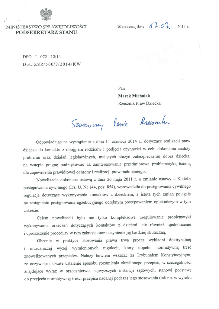 Warszawa, dnia Ę SPRAWIEDLIWOŚCI 1 NiINISTERS O /1 . O- 2014r. PODSEKRETARZ STANU DSO-I-072-12/14 Dot. ZSR/500/7/20 14/KW Pan Marek Michalak Rzecznik Praw Dziecka Odpowiadając na wystąpienie z dnia 11 czerwca 2014 r., dotyczące realizacji praw dziecka do kontaktu z obojgiem rodziców i podjęcia czynności w celu dokonania analizy problemu oraz działań legislacyjnych, mających służyć zabezpieczeniu dobra dziecka, na wstępie pragnę podziękować za zainteresowanie przedmiotową problematyką istotną dla zapewnienia prawidłowej ochrony i realizacji praw małoletniego. Nowelizacja dokonana ustawą z dnia 26 maja 2011 r. o zmianie ustawy Kodeks postępowania cywilnego (Dz. U. Nr 144, poz. 854), wprowadziła do postępowania cywilnego — regulacje dotyczące wykonywania kontaktów z dzieckiem, a istota tych zmian polegała na zastąpieniu postępowania egzekucyjnego odrębnym postępowaniem opiekuńczym w tym zakresie. Celem nowelizacji było nie tylko kompleksowe uregulowanie problematyki wykonywania orzeczeń dotyczących kontaktów z dziećmi. ale również ujednolicenie i uproszczenie procedury w Obecnie i orzeczniczej tym w praktyce wyżej zakresie oraz uczynienie jej bardziej skuteczną. stosowania prawa trwa proces wymienionych regulacji, który wykładni dopełni doktrynalnej normatywną treść znowelizowanych przepisów. Należy bowiem wskazać za Trybunałem Konstytucyjnym. że oczywiste i trwałe ustalenie sposobu rozumienia określonego przepisu, w szczególności znajdujące wyraz w orzecznictwie najwyższych instancji sądowych, stanowi podstawę do przyjęcia normatywnej treści przepisu nadanej podczas jego stosowania (tak np. w wyroku TK z dnia 11 lipca 2011 r., P 1/10, OTK-A 201 l/6/53, czy w wyroku TK z dnia 27 października 2010 r., K 10/08, OTK ZU nr 8/A/2010, poz. 81). Ministerstwo Sprawiedliwości z uwagą analizuje zgłaszane postulaty i oceny obowiązujących uregulowań prawnych w obszarze prawa rodzinnego. Wyrazem tego zainteresowania było powołanie Zespołu problemowego ds. prawa rodzinnego przy Komisji Kodyfikacyjnej Prawa Cywilnego, działającej przy Ministrze Sprawiedliwości. W opracowanym projekcie założeń projektu ustawy o zmianie ustawy cywilny, ustawy — Kodeks rodzinny i opiekuńczy, ustawy — — Kodeks Kodeks postępowania cywilnego, ustawy o wspieraniu rodziny i systemie pieczy zastępczej oraz niektórych innych ustaw. przewidziano regulacje, których celem jest poprawa efektywności postępowań sądowych w sprawach rodzinnych oraz wykonywania orzeczeń sądu rodzinnego, w tym w sprawach o odebranie dziecka poprzez możliwość przeszukania mieszkania i innych miejsc z udziałem Policji. Obecnie projekt pozostaje w fazie konsultacji publicznych i opiniowania. Ponadto Ministerstwo Sprawiedliwości zgłosiło do planu pracy badań naukowych Instytutu Wymiaru Sprawiedliwości na 2014 r. propozycję dokonania analizy w sprawach rozwodowych odnośnie porozumienia małżonków o sposobie wykonywania władzy rodzicielskiej i utrzymywaniu kontaktów z małoletnim dzieckiem po rozwodzie w praktyce sądowej. W związku z wyst ąpieniem Pana Rzecznika zwrócono się do Instytutu Wymiaru Sprawiedliwości_o dokonanie analizy i oceny praktyki sądowej co do funkcjonowania obecnych regulacji dotyczących postępowania o wykonywanie kontaktów z dzieckiem. Uwzględnienie przez Instytut w szerszej problematyki z zakresu omawianych stosunków niż pierwotnie określona w przedstawionej propozycji pozwoli na jej wielopłaszczyznowe przeanalizowanie i wypracowanie na tej podstawie kompleksowych wniosków. Ministerstwo Sprawiedliwości nie dokonywało dotychczas analizy fimkcjonowania uregulowań prawnych wprowadzonych nowelizacją z 2011 r., gdyż krótki czas ich obowiązywania nie uzasadniał tego rodzaju działań. Z kolei informacje zawarte w sprawozdaniach statystycznych posiadanych przez Ministerstwo Sprawiedliwości, dotyczące liczby spraw o ustalenie kontaktów i o zmianę kontaktów z małoletnim, w tym liczby spraw, w których uwzględniono wniosek w całości lub w części, jak również liczby małoletnich, których sprawa dotyczy, nie pozwalają na przeprowadzenie analizy pod kątem zdiagnozowania zagadnień podniesionych w wystąpieniu Pana Rzecznika. Pozostaję w przekonaniu, że podjęte działania pozwolą na wypracowanie dobrych praktyk w sprawach dotyczących wykonywania kontaktów z dzieckiem. 1 W Wohech Hajduk