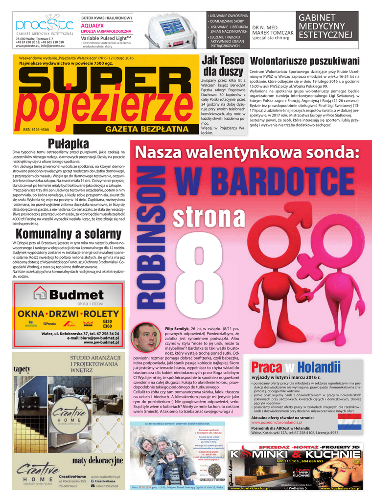 • USUWANIE OWŁOSIENIA • ODMŁADZANIE SKÓRY • USUWANIE I REDUKCJA ZMIAN NACZYNIOWYCH • LECZENIE TRĄDZIKU AKTYWNEGO I ZMIAN POTRĄDZIKOWYCH BOTOX KWAS HIALURONOWY AQUALYX LIPOLIZA FARMAKOLOGICZNA Variable Pulsed LightTM - dowiedziona skuteczność w leczeniu niedoskonałości skóry Weekendowe wydanie „Pojezierza Wałeckiego”. (Nr 6) 12 lutego 2016 SUPER Największe wydawnictwo w powiecie 7500 egz. GAZETA BEZPŁATNA Pułapka Dwa tygodnie temu ostrzegaliśmy przed pułapkami, jakie czekają na uczestników różnego rodzaju darmowych prezentacji. Dzisiaj na poczcie natknęliśmy się na ofiarę takiego spotkania. Pani Jadwiga (imię zmienione) wróciła ze spotkania, na którym demonstrowano podobno rewelacyjny sprzęt medyczny do użytku domowego, z przyrządem do masażu. Wzięła go do darmowego testowania, oczywiście bez obowiązku zakupu. Na zwrot miała 14 dni. Zatrzymanie przyrządu lub zwrot po terminie miały być traktowane jako decyzja o zakupie. Przez pierwsze trzy dni pani Jadwiga testowała urządzenie, potem o nim zapomniała, bo żadna rewelacja, a kiedy sobie przypomniała, akurat źle się czuła. Wybrała się więc na pocztę w 14 dniu. Zapłakana, roztrzęsiona i załamana, bo przed wyjściem z domu doczytała na umowie, że liczy się data doręczenia paczki, a nie nadania. Co oznaczało, że stała się nieszczęśliwą posiadaczką przyrządu do masażu, za który będzie musiała zapłacić 4000 zł! Paczkę na wszelki wypadek wysłała licząc, że ktoś zlituje się nad biedną rencistką. Komunalny a solarny W Człopie przy ul. Brzozowej jeszcze w tym roku ma ruszyć budowa nowoczesnego i taniego w eksploatacji domu komunalnego dla 12 rodzin. Budynek wyposażony zostanie w instalacje energii odnawialnej i panele solarne. Koszt inwestycji to półtora miliona złotych, ale gmina ma już obiecaną dotację z Wojewódzkiego Funduszu Ochrony Środowiska i Gospodarki Wodnej, a stara się też o inne dofinansowanie. Na liście oczekujących na komunalny dach nad głową jest około trzydziestu rodzin. Związany przez kilka lat z Wałczem ksiądz Benedykt Pączka założył Pogotowie Duchowe. 30 kapłanów z całej Polski rotacyjnie przez 24 godziny na dobę dyżuruje przy swoich telefonach komórkowych, aby móc w każdej chwili i każdemu pomóc. Więcej w Pojezierzu Wałeckim. Centrum Wolontariatu Sportowego działające przy Klubie Uczelnianym PWSZ w Wałczu zaprasza młodzież w wieku 16-24 lat na spotkanie, które odbędzie się w dniu 19 lutego 2016 r. o godzinie 15.00 w auli PWSZ przy ul. Wojska Polskiego 99. Wyłoniona na spotkaniu grupa wolontariuszy pomagać będzie organizatorom turnieju interkontynentalnego Ligi Światowej, w którym Polska zagra z Francją, Argentyną i Rosją (24-26 czerwca). Będzie też prawdopodobnie obsługiwać Finał Ligi Światowej (1317 lipca) z udziałem 6 najlepszych zespołów świata, a w dalszej perspektywie, w 2017 roku Mistrzostwa Europy w Piłce Siatkowej. Jesteśmy pewni, że osób, które interesują się sportem, lubią przyprzy godę i wyzwanie nie trzeba dodatkowo zachęcać. Nasza walentynkowa sonda: ROBINSON ISBN 1426-4366 Jak Tesco Wolontariusze poszukiwani dla duszy W BARDOTCE strona 8 Filip Szmiłyk Szmiłyk, 26 lat, w związku (8/11 poprawnych odpowiedzi) Powiedziałbym, że zalotka jest synonimem podwiązki. Albo czymś w stylu "może to jej urok, może to maybelline"? Bardotka to taki wąski biustonosz, który wystaje trochę ponad sutki. OdOd powiedni rozmiar pomaga dobrać brafitterka, czyli babeczka, która podpowiada, jaki stanik pasuje kobiecie najlepiej. Skoro już jesteśmy w temacie biustu, wypełniacz to chyba wkład do biustonosza dla kobiet nieobdarzonych przez Boga solidnym C? Wydaje mi się, że spódnicospodnie to spodnie z nogawkami szerokimi na całej długości. Fuksja to określenie koloru, prawdopodobnie takiego podobnego do turkusowego. Cellulit to żółta czy tam pomarańczowa skórka, fałdki tłuszczu na udach i biodrach. A klimakterium pasuje mi jedynie jako rym do prezbiterium :) Nie googlowałem odpowiedzi, serio. Skąd tyle wiem o kobietach? Niezły ze mnie lachon, to coś tam wiem (śmiech). A tak serio, to trzeba znać swojego wroga :) Dowiedz się jak zadbać o zdrowie najmłodszych, jak i całej rodziny. Prelekcja oraz badanie poziomu witamin i minerałów w organizmie. Data: 27.02.2016, godz.: 12:00; Miejsce: Żłobek Dziecięcy Ogród, ul. Orla 22, Wałcz wyjazdy w lutym i marcu 2016 r. • posiadamy oferty pracy dla młodzieży w sektorze ogrodniczym i na produkcji, doświadczenie nie wymagane, prawo jazdy i komunikatywna znajomość j. obcego mile widziane • pilnie poszukujemy osób z doświadczeniem w pracy w holenderskich szklarniach przy sadzonkach, kwiatach ciętych i doniczkowych, zbiorze papryki i ogórków • posiadamy również oferty pracy w zakładach mięsnych dla rzeźników i osób z doświadczeniem przy dzieleniu mięsa oraz wiele innych ofert. Pośrednik dla ABOost w Holandii: Wałcz, Kościuszki 12A, tel. 67 258 4108, Licencja 4933 Darmowe spotkanie z dietetykiem dla rodziców! DOWIEDZ SIĘ WIĘCEJ! Tel.: 665 267 969 E-mail: [email protected] www: dzieciecyogrod.pl Praca w Holandii Aktualne oferty również na stronie: www.posrednictwoholandia.pl Już teraz zadbaj o zdrowie i odporność swoich najbliższych. Sprzedaż - Montaż 78-600 Wałcz, Tęczowa 5-7 +48 67 250 90 18, +48 601 210 010 www.proeste.eu, [email protected] Ściąga historyczna Wałcz w latach powojennych Po 173 letniej przynależności do państwa niemieckiego Wałcz z całą Ziemią Wałecką powrócił w 1945 roku do Polski. Skutki przejścia frontu wojennego w lutym 1945 roku były widoczne w mieście, chociaż nie były tak bolesne jak w pozostałych miasteczkach tego rejonu. Obejmowały one około 15% zniszczeń zabudowy miasta, natomiast znaczniejsze były infrastruktury gospodarczej. Sytuację pogłębiał fakt opuszczenia miasta przez jego dotychczasowych mieszkańc