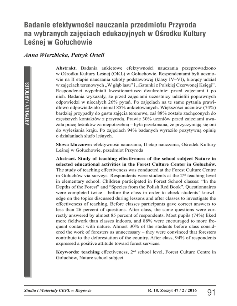 Badanie efektywności nauczania przedmiotu Przyroda na wybranych zajęciach edukacyjnych w Ośrodku Kultury Leśnej w Gołuchowie ARTYKUŁY / ARTICLES Anna Wierzbicka, Patryk Ortell Abstrakt. Badania ankietowe efektywności nauczania przeprowadzono w Ośrodku Kultury Leśnej (OKL) w Gołuchowie. Respondentami byli uczniowie na II etapie nauczania szkoły podstawowej (klasy IV–VI), biorący udział w zajęciach terenowych „W głąb lasu” i „Gatunki z Polskiej Czerwonej Księgi”. Respondenci wypełniali kwestionariusze dwukrotnie: przed zajęciami i po nich. Badania wykazały, że przed zajęciami uczestnicy udzielili poprawnych odpowiedzi w niecałych 26% pytań. Po zajęciach na te same pytania prawidłowo odpowiedziało niemal 85% ankietowanych. Większości uczniów (74%) bardziej przypadły do gustu zajęcia terenowe, zaś 88% zostało zachęconych do częstszych kontaktów z przyrodą. Prawie 30% uczniów przed zajęciami uważała pracę leśników za niepotrzebną – była przekonana, że przyczyniają się oni do wylesiania kraju. Po zajęciach 94% badanych wyraziło pozytywną opinię o działaniach służb leśnych. Słowa kluczowe: efektywność nauczania, II etap nauczania, Ośrodek Kultury Leśnej w Gołuchowie, przedmiot Przyroda Abstract. Study of teaching effectiveness of the school subject Nature in selected educational activities in the Forest Culture Center in Gołuchów. The study of teaching effectiveness was conducted at the Forest Culture Centre in Gołuchów via surveys. Respondents were students at the 2nd teaching level in elementary school. Children participated in Forest School classes: “In the Depths of the Forest” and “Species from the Polish Red Book”. Questionnaires were completed twice - before the class in order to check students’ knowledge on the topics discussed during lessons and after classes to investigate the effectiveness of teaching. Before classes participants gave correct answers to less than 26 percent of questions. After class, the same questions were correctly answered by almost 85 percent of respondents. Most pupils (74%) liked more fieldwork than classes indoors, and 88% were encouraged to more frequent contact with nature. Almost 30% of the students before class considered the work of foresters as unnecessary – they were convinced that foresters contribute to the deforestation of the country. After class, 94% of respondents expressed a positive attitude toward forest services. Keywords: teaching effectiveness, 2nd school level, Forest Culture Centre in Gołuchów, Nature school subject Studia i Materiały CEPL w Rogowie R. 18. Zeszyt 47 / 2 / 2016 91 Wstęp Gospodarka leśna nawet dziś dla wielu osób jest tematem niezrozumiałym, czasem nawet nielogicznym. Świadczyć o tym mogą chociażby komentarze pod artykułami dotyczącymi gospodarki leśnej w pobliżu dużych miast, zamieszczonymi w internetowych serwisach informacyjnych. Problem może wynikać z braku szerszego omówienia tej tematyki, zapisanego w podstawie programowej nauczania przedmiotów przyrodniczych na różnych etapach nauczania (Chrzanowski 2009). Wypełnianiem luki w edukacji formalnej poprzez budowanie i promowanie zrównoważonego leśnictwa w świadomości społeczeństwa, a także kreowanie odpowiedniego stosunku do lasu i jego gospodarzy od lat zajmują się Lasy Państwowe (Fronczak 2004). Las sam w sobie jest doskonałym obiektem przyrodniczym, który stwarza możliwość przeprowadzenia wielu obserwacji i doświadczeń. Wizyta w lesie rodzi wiele pytań, często wywołuje pozytywne emocje, w końcu budzi u najmłodszych wrażliwość, zamiłowanie i chęć opieki nad roślinami lub zwierzętami oraz zachęca do aktywnego działania (Będkowska 2005). Realizowanie zadań edukacyjnych leśników wiąże się z zakupami środków dydaktycznych, prowadzeniem szkoleń, wydawaniem materiałów promocyjno-edukacyjnych oraz tworzeniem tzw. obiektów edukacyjnych. Zaliczyć do nich można ośrodki i centra edukacji przyrodniczo-leśnej, izby i wiaty edukacyjne, a także wystawy i ścieżki edukacyjne (Będkowska 2010). Takimi obiektami są także Muzeum Leśnictwa oraz zabytkowy park-arboretum, mieszczące się na terenie Ośrodka Kultury Leśnej w Gołuchowie (OKL). Zbiory tego ośrodka są unikatowe, ponieważ nawet doświadczonym przyrodnikom przez długi czas nie udaje się spotkać w naturze wielu rzadkich gatunków zwierząt i roślin z Polskiej Czerwonej Księgi prezentowanych w muzeum. Nie co dzień także mamy okazję podziwiać ponad 300-letnie dęby przechadzając się po leśnym zaciszu, jednocześnie zgłębiając jego tajemnice. Cele badań sformułowano następująco: – sprawdzenie czy edukacja leśna prowadzona poza murami szkoły wpłynie pozytywnie na stan wiedzy przyrodniczej uczniów, – zbadanie stanu wiedzy uczniów w II etapie edukacji na temat zagadnień z przedmiotu Przyroda z podstawy programowej i podręczników, – ocena efektywności wybranych zajęć prowadzonych w OKL, – określenie najatrakcyjniejszej formy zajęć dla uczniów i nauczycieli. Metody Badanie stanu wyjściowego wiedzy uczniów oraz efektywności zajęć prowadzone były za pomocą anonimowych ankiet (ryc. 1). Ankieta to metoda pozwalająca na zbieranie informacji od wybranych osób, za pomocą jednakowej dla wszystkich listy pytań. Są one jasno i zrozumiale sformułowane, nie wymagają komentarza badającego (Silverman 2007). Ankiety dla uczniów dotyczyły głównie tematyki leśnej, zawartej w podręcznikach i zeszytach ćwiczeń zgodnych z nową podstawą programową. Ta sama tematyka realizowana jest na zajęciach muzealnych „Gatunki z Polskiej Czerwonej Księgi” oraz zajęciach terenowych „W głąb lasu w OKL”, które zostały wybrane do badania. Ankiety zostały przeprowadzone w okresie od kwietnia do końca czerwca 2015. Składały się one z 7 pytań sprawdzających stan wiedzy zdobytej w szkole i 7 pytań dotyczących nowych 