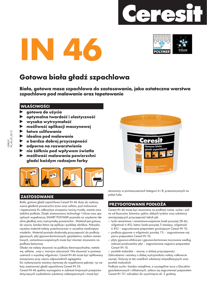 IN 46 Gotowa biała gładź szpachlowa CERESIT IN_46_KT_02.15 Biała, gotowa masa szpachlowa do zastosowania, jako ostateczna warstwa szpachlowa pod malowanie oraz tapetowanie WŁAŚCIWOŚCI gotowa do użycia optymalna twardość i elastyczność wysoka wytrzymałość możliwość aplikacji maszynowej łatwe szlifowanie idealna pod malowanie o bardzo dobrej przyczepności odporna na rozwarstwienie nie żółknie pod wpływem światła możliwość malowania powierzchni gładzi każdym rodzajem farby ZASTOSOWANIE Biała, gotowa gładź szpachlowa Ceresit IN 46 służy do wykonywania gładkich powierzchni ścian oraz sufitów, pod malowanie i tapetowanie Po całkowitym związaniu tworzy trwałe, zwarte oraz stabilne podłoże. Dzięki zastosowaniu technologii 1nSure oraz specjalnych wypełniaczy SMART POLYMER pozwala na uzyskanie idealnie gładkiej oraz wytrzymałej powierzchni.. Materiał jest gotowy do użycia, bardzo łatwo się aplikuje i poddaje obróbce. Niewykorzystany materiał należy przechowywać w szczelnie zamkniętym wiaderku. Materiał posiada doskonałą przyczepność do podłoży gipsowych, płyt gipsowo-kartonowych, gazobetonu, tynków cementowych, cementowo-wapiennych może być również stosowana na podłoża betonowe. Gładzi nie należy stosować na podłoża drewnopochodne, metalowe, szklane, oraz z tworzyw sztucznych. Nie stosować w pomieszczeniach o wysokiej wilgotności. Ceresit IN 46 może być aplikowany maszynowo przy użyciu odpowiednich agregatów. Do wykonywania warstwy startowej do wypełniania pęknięć, rys należy zastosować gładź szpachlową Ceresit IN 35. Ceresit IN 46 spełnia wymagania w zakresie krajowych przepisów dotyczących wydzielania substancji niebezpiecznych i może być stosowany w pomieszczeniach kategorii A i B, przeznaczonych na pobyt ludzi. PRZYGOTOWANIE PODŁOŻA Ceresit IN 46 może być stosowana na podłoża nośne, suche i wolne od tłuszczów, bitumów, pyłów, słabych tynków oraz substancji zmniejszających przyczepność takich jak: — tynki cementowe i cementowo-wapienne (wiek powyżej 28 dni, wilgotność ≤ 4%), beton (wiek powyżej 3 miesięcy, wilgotność ≤ 4%) – zagruntowane preparatem gruntującym Ceresit IN 10, — podłoża gipsowe o wilgotności poniżej 1% – zagruntowane najpierw preparatem Ceresit IN 10, — płyty gipsowo-włóknowe i gipsowo-kartonowe mocowane według zaleceń producentów płyt – zagruntowane najpierw preparatem Ceresit IN 10, — powłoki malarskie – mocne, o dobrej przyczepności. Zabrudzenia i warstwy o słabej wytrzymałości należy całkowicie usunąć. Dotyczy to też wszelkich substancji antyadhezyjnych oraz powłok malarskich. Podłoża suche i bardzo nasiąkliwe, a szczególnie mury z bloczków gazobetonowych i silikatowych, zaleca się zagruntować preparatem Ceresit IN 10 i odczekać do wyschnięcia ok. 2 godziny. Biała gładź szpachlowa Ceresit IN 46 jest gotowa do użycia. Po otworzeniu opakowania należy wymieszać zawartość pojemnika przy pomocy mieszadła koszykowego. Jeśli potrzeba można zwiększyć dodatek wody o około 2% na opakowanie i zamieszać ponownie. W przypadku aplikacji maszynowej dodatek wody będzie wynosił około 4%. Materiał należy nakładać na powierzchnię przy użyciu pacy metalowej. Po nałożeniu, materiał przegładzić szeroką pacą wykonaną ze stali nierdzewnej i pozostawić do wyschnięcia. Po stwardnieniu powierzchnia nadaje się do szlifowania przy użyciu papieru ściernego, siatki do szlifowania oraz za pomocą szlifierki mechanicznej tzw. żyrafy. W przypadku większych nierówności materiał należy ponownie aplikować warstwami o niewielkiej grubości o ile zajdzie taka potrzeba – wielokrotnie (po całkowitym wyschnięciu warstwy wcześniejszej). Wyschniętą warstwę należy przeszlifować, odpylić następnie zagruntować i pomalować. W przypadku gruntowania zaleca się stosowanie wyłącznie wałka malarskiego. Nie zaleca się szlifowania między warstwami, a jeżeli jest taka konieczność, szlifowaną powierzchnię należy odpylić. Zaleca się aplikację jednorazowo warstwy nie grubszej niż 3 mm. Nie stosować w warstwach poniżej 1 mm. W przypadku aplikacji maszynowej, zalecamy zastosowanie agregatu firmy Graco model T-MAX, rozmiar dyszy TMX 651. Gładź można malować po jej całkowitym wyschnięciu oraz zagruntowaniu preparatem Ceresit IN 10. W przypadku tapetowania należy używać odpowiednich klejów Metylan oraz postępować zgodnie z zaleceniami producenta. UWAGA Prace należy wykonywać w suchych warunkach, przy temperaturze powietrza i podłoża od +10°C do +25°C. Należy chronić skórę i oczy. Chronić przed dziećmi. W przypadku kontaktu materiału z oczami płukać je obficie wodą i zasięgnąć porady lekarza. SKŁADOWANIE Do 12 miesięcy od daty produkcji, przy składowaniu w chłodnych warunkach i w oryginalnych, nieuszkodzonych opakowaniach, w temperaturze od +5°C do +35°C. Chronić przed mrozem! Chronić przed bezpośrednim nasłonecznieniem. Całkowicie opróżnione opakowania należy dostarczyć do recyklingu, pozostałości materiału zebrać i przekazać do utylizacji firmie posiadającej odpowiednie uprawnienia. OPAKOWANIA Wiadro 25 kg, 15 kg i 3 kg. DANE TECHNICZNE Baza: mieszanka spoiw polimerowych z wypełniaczami mineralnymi i modyfikatorami Gęstość objętościowa: ok. 1,6 kg/dm3 Temperatura stosowania: od +10°C do +25°C Czas schnięcia: zależny od grubości nałożonej warstwy oraz warunków w jakich jest aplikowany materiał, średnio wynosi ok. 6 godzin przy warstwie 1–2 mm Przyczepność: ≥ 0,3 MPa Reakcja na ogień: klasa F Orientacyjne zużycie: ok. 1,6 kg/m2 na każdy mm grubości – Wyrób zgodny z normą PN-EN 15824. Wszelkie porady techniczne można uzyskać pod numerami telefonów: +48 800 120 241 +48 41 3710124. Poza informacjami podanymi w niniejszej karcie technicznej należy przestrzegać zasad sztuki budowlanej, wytycznych branżowych instyt