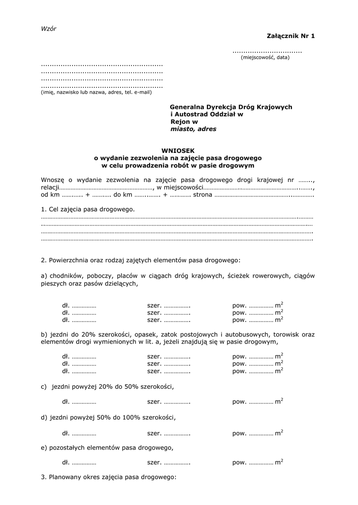 Wzór Załącznik Nr 1 ................................ (miejscowość, data) ........................................................ ........................................................ ........................................................ ........................................................ (imię, nazwisko lub nazwa, adres, tel. e-mail) Generalna Dyrekcja Dróg Krajowych i Autostrad Oddział w Rejon w miasto, adres WNIOSEK o wydanie zezwolenia na zajęcie pasa drogowego w celu prowadzenia robót w pasie drogowym Wnoszę o wydanie zezwolenia na zajęcie pasa drogowego drogi krajowej nr …….., relacji…………………………………………………, w miejscowości…………………..……………………………..……., od km …….….. + …….…. do km ……..……. + …..……. strona ………………………………………..…………. 1. Cel zajęcia pasa drogowego. ………………………………………………………………………………………………………………………………………….……… ..…………………………………………………………………………………………………………………………………………….… …………………………………………………………………………………………………………………………………………………. …………………………………………………………………………………………………………………………………………………. 2. Powierzchnia oraz rodzaj zajętych elementów pasa drogowego: a) chodników, poboczy, placów w ciągach dróg krajowych, ścieżek rowerowych, ciągów pieszych oraz pasów dzielących, dł. …………… dł. …………… dł. …………… szer. ……………. szer. ……………. szer. ……………. pow. …………… m2 pow. …………… m2 pow. …………… m2 b) jezdni do 20% szerokości, opasek, zatok postojowych i autobusowych, torowisk oraz elementów drogi wymienionych w lit. a, jeżeli znajdują się w pasie drogowym, dł. …………… dł. …………… dł. …………… szer. ……………. szer. ……………. szer. ……………. pow. …………… m2 pow. …………… m2 pow. …………… m2 c) jezdni powyżej 20% do 50% szerokości, dł. …………… szer. ……………. pow. …………… m2 d) jezdni powyżej 50% do 100% szerokości, dł. …………… szer. ……………. pow. …………… m2 e) pozostałych elementów pasa drogowego, dł. …………… szer. ……………. 3. Planowany okres zajęcia pasa drogowego: pow. …………… m2 - od dnia …………………………………….…. do dnia ………………..…………..…………. , tj. ………… dni* - zgodnie z harmonogramem robót * 4. Wykonawcą z ramienia Inwestora jest ……………………………………………………………………………… …………………………………………………………………………………………………………………………………………………. …………………………………………………………………………………………………………………………………………………. …………………………………………………………………………………………………………………………………………………. (imię, nazwisko, siedziba, tel.) 5. Kierownikiem robót (budowy) odpowiedzialnym za wykonanie robót oraz bezpieczeństwo ruchu na zajmowanym odcinku pasa drogowego będzie …………………………… …………………………………………………………………………………………………………………………………………………. …………………………………………………………………………………………………………………………………………………. …………………………………………………………………………………………………………………………………………………. (imię, nazwisko, tel. służbowy, uprawnienia budowlane nr pozwolenie na budowę) - w przypadku, gdy taki obowiązek nakłada 6. Inspektorem nadzoru inwestorskiego będzie ………………………………………………………….….. …………………………………………………………………………………………………………………………………………………. …………………………………………………………………………………………………………………………………………………. …………………………………………………………………………………………………………………………………………………. (imię, nazwisko, tel. służbowy, uprawnienia budowlane nr - w przypadku, gdy taki obowiązek nakłada pozwolenie na budowę) 7. Decyzją Generalnego Dyrektora Dróg Krajowych i Autostrad z dnia …...………………………… znak:……………………………….……………………………………………………... zostało wydane zezwolenie na lokalizację urządzeń infrastruktury technicznej / obiektów budowlanych / reklam / zjazdu* w pasie drogowym drogi krajowej nr ………. . 8. Osobą odpowiedzialną za zajęcie pasa drogowego będzie ……………………………………… …………………………………………………………………………………………………………………………………………………. ..………………………………………………………………………………………………………………………………………………. (imię, nazwisko, tel.) Do niniejszego wnio
