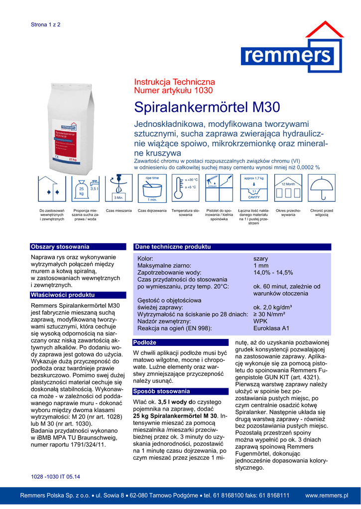 Strona 1 z 2 Instrukcja Techniczna Numer artykułu 1030 Spiralankermörtel M30 Jednoskładnikowa, modyfikowana tworzywami sztucznymi, sucha zaprawa zwierająca hydraulicznie wiążące spoiwo, mikrokrzemionkę oraz mineralne kruszywa Zawartość chromu w postaci rozpuszczalnych związków chromu (VI) w odniesieniu do całkowitej suchej masy cementu wynosi mniej niż 0,0002 % Do zastosowań wewnętrznych i zewnętrznych Proporcja mieszania sucha zaprawa / woda Czas mieszania Obszary stosowania Naprawa rys oraz wykonywanie wytrzymałych połączeń między murem a kotwą spiralną, w zastosowaniach wewnętrznych i zewnętrznych. Właściwości produktu Remmers Spiralankermörtel M30 jest fabrycznie mieszaną suchą zaprawą, modyfikowaną tworzywami sztucznymi, która cechuje się wysoką odpornością na siarczany oraz niską zawartością aktywnych alkaliów. Po dodaniu wody zaprawa jest gotowa do użycia. Wykazuje dużą przyczepność do podłoża oraz twardnieje prawie bezskurczowo. Pomimo swej dużej plastyczności materiał cechuje się doskonałą stabilnością. Wykonawca może - w zależności od poddawanego naprawie muru - dokonać wyboru między dwoma klasami wytrzymałości: M 20 (nr art. 1028) lub M 30 (nr art. 1030). Badania przydatności wykonano w iBMB MPA TU Braunschweig, numer raportu 1791/324/11. Czas dojrzewania Temperatura stosowania Pistolet do spoinowania / kielnia spoinówka Łączna ilość nakładanego materiału na 1 l pustej przestrzeni Okres przechowywania Chronić przed wilgocią Dane techniczne produktu Kolor: Maksymalne ziarno: Zapotrzebowanie wody: Czas przydatności do stosowania po wymieszaniu, przy temp. 20°C: szary 1 mm 14,0% - 14,5% Gęstość o objętościowa świeżej zaprawy: Wytrzymałość na ściskanie po 28 dniach: Nadzór zewnętrzny: Reakcja na ogień (EN 998): Podłoże W chwili aplikacji podłoże musi być matowo wilgotne, mocne i chropowate. Luźne elementy oraz warstwy zmniejszające przyczepność należy usunąć. Sposób stosowania Wlać ok. 3,5 l wody do czystego pojemnika na zaprawę, dodać 25 kg Spiralankermörtel M 30. Intensywnie mieszać za pomocą mieszalnika /mieszarki przeciwbieżnej przez ok. 3 minuty do uzyskania jednorodności, pozostawić na 1 minutę czasu dojrzewania, po czym mieszać przez jeszcze 1 mi- ok. 60 minut, zależnie od warunków otoczenia ok. 2,0 kg/dm³ ≥ 30 N/mm² WPK Euroklasa A1 nutę, aż do uzyskania pozbawionej grudek konsystencji pozwalającej na zastosowanie zaprawy. Aplikację wykonuje się za pomocą pistoletu do spoinowania Remmers Fugenpistole GUN KIT (art. 4321). Pierwszą warstwę zaprawy należy ułożyć w spoinie bez pozostawiania pustych miejsc, po czym centralnie osadzić kotwę Spiralanker. Następnie układa się drugą warstwą zaprawy - również bez pozostawiania pustych miejsc. Pozostałą przestrzeń spoiny można wypełnić po ok. 3 dniach zaprawą spoinową Remmers Fugenmörtel, dokonując jednocześnie dopasowania kolorystycznego. 1028 -1030 IT 05.14 Remmers Polska Sp. z o.o. • ul. Sowia 8 • 62-080 Tarnowo Podgórne • tel. 61 8168100 faks: 61 8168111 www.remmers.pl Strona 2 z 2 Pielęgnacja Świeżo wyspoinowane powierzchnie należy chronić przez co najmniej 1 dzień, np. za pomocą folii, przed zbyt szybkim wyschnięciem oraz czynnikami atmosferycznymi takimi jak słońce, wiatr, deszcz, przeciąg lub mróz. Nierównomierne wiązanie i wysychanie może prowadzić do powstania rys. Bezpieczeństwo, ochrona środowiska, usuwanie Bliższe informacje na temat bezpieczeństwa podczas transportu, składowania i stosowania oraz na temat usuwania i ochrony środowiska znajdują się w aktualnej karcie charakterystyki produktu. Wskazówki Stężałej zaprawy nie wolno ponownie zarabiać dodając wodę lub świeżą zaprawę. Nie stosować, gdy temperatura podłoża, powietrza i materiału budowlanego są niższe niż +5° C lub przekraczają +30° C. Podane dane techniczne produktu zostały oznaczone dla temperatury 20° C i 65 % wilgotności względnej powietrza. Niższe temperatury wydłużają, wyższe skracają czasy przydatności do stosowania po wymieszaniu oraz czasy wiązania. Może zawierać śladowe ilości pirytu lub siarczku żelaza. Narzędzia, czyszczeie Mieszarka BEBA lub mieszadło, pistolet do spoinowania (Pointing GUN KIT), kielnia do spoinowania. Przed związaniem zaprawy narzędzia można bez problemu myć wodą. Rodzaj opakowania, zużycie, składowanie Rodzaj opakowania: Worek papierowy 25 kg Zużycie suchej zaprawy: Około 1,7 kg/l wypełnianej przestrzeni Składowanie: Przy przechowywaniu w miejscu suchym, zabezpieczonym przed wilgocią, w zamkniętych opakowaniach co najmniej 12 miesięcy. 0785 ______________________________________ Remmers Baustofftechnik GmbH Bernhard - Remmers - Str.13 D - 49624 Löningen 11 GBI P37 EN 998-2: 2010-09 Spiralankermörtel M30 Zaprawa murarska ogólnego przeznaczenia do stosowania w ścianach, słupach i ścianach działowych murowych (elementy budowlane wewnątrz i na zewnątrz), które podlegają wymaganiom konstrukcyjnym ______________________________________ Wytrzymałość na ściskanie M 30 Wytrzymałość spoiny (wytrzymałość na ścinanie) (wartość tabelaryczna EN 771) 0,15 N/mm² Zawartość chlorków ≤ 0,01 % masy Reakcja na ogień Klasa A1 Absorpcja wody ≤ 0,15 kg/(m² • min0,5) Współczynnik przepuszczalności pary wodnej (wartość tabelaryczna EN 1745) μ 5/35 Współczynnik przewodzenia ciepła (λ10,dry) (wartość tabelaryczna EN 1745) Trwałość (mrozoodporność) ≤ 0,83 W / (mK) dla P = 50 % ≤ 0,93 W / (mK) dla P = 90 % Odporna, przy stosowa niu zgodnie z instrukcją producenta Niebezpieczne substancje NPD Powyższe wskazówki zostały zestawione w naszym dziale produkcji według najnowszego stanu wiedzy i techniki stosowania. Ponieważ rodzaje zastosowań i sposób użycia są poza naszą kontrolą, z treści tej instrukcji nie wynika żadna odpowiedzialność producenta. Wskazówki 