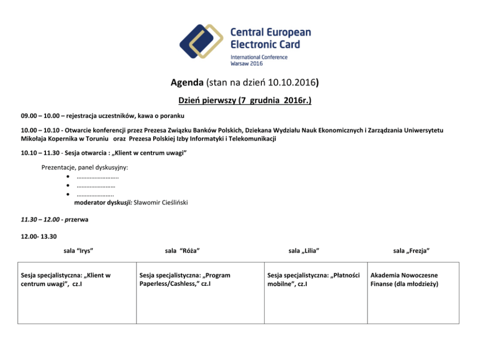 Agenda (stan na dzień 10.10.2016) Dzień pierwszy (7 grudnia 2016r.) 09.00 – 10.00 – rejestracja uczestników, kawa o poranku 10.00 – 10.10 - Otwarcie konferencji przez Prezesa Związku Banków Polskich, Dziekana Wydziału Nauk Ekonomicznych i Zarządzania Uniwersytetu Mikołaja Kopernika w Toruniu oraz Prezesa Polskiej Izby Informatyki i Telekomunikacji 10.10 – 11.30 - Sesja otwarcia : „Klient w centrum uwagi” Prezentacje, panel dyskusyjny: • …………………….. • …………………… • ………………….. moderator dyskusji: Sławomir Cieśliński 11.30 – 12.00 - przerwa 12.00- 13.30 sala “Irys” Sesja specjalistyczna: „Klient w centrum uwagi”, cz.I sala “Róża” Sesja specjalistyczna: „Program Paperless/Cashless,” cz.I sala „Lilia” Sesja specjalistyczna: „Płatności mobilne”, cz.I sala „Frezja” Akademia Nowoczesne Finanse (dla młodzieży) 13.30 – 14.30 – obiad 14.30 – 16.00 – sesje specjalistyczne sala “Irys” Sesja specjalistyczna: „Klient w centrum uwagi”, cz.II sala “Róża” Sesja specjalistyczna: „Program Paperless/Cashless”, cz.II sala „Lilia” sala „Frezja” Sesja specjalistyczna: „Płatności Akademia Nowoczesne mobilne”, cz.II Finanse (dla młodzieży) Dyskusja z udziałem w/w prelegentów oraz zaproszonych gości. 16.00 – 16.15 – przerwa 16.15 – 17.15 sesje specjalistyczne sala “Irys” przygotowania do Polskiej Kartowej Gali sala “Róża” Sesja specjalistyczna: Program Paperless/Cashless, cz.III Dyskusja z udziałem w/w prelegentów oraz zaproszonych gości. 17.15 – 17.30 – przerwa sala „Lilia” sala „Frezja” Sesja specjalistyczna: „Nowe Akademia Nowoczesne zagrożenia bezpieczeństwa Finanse (dla młodzieży) transakcji” lub „FinTech – partner czy przeciwnik?” Dyskusja z udziałem w/w prelegentów oraz zaproszonych gości. 17.30 – 18.30 – sesje specjalistyczne sala “Irys” przygotowania do Polskiej Kartowej Gali sala “Róża” Sesja specjalistyczna: „Polska karta płatnicza” sala „Lilia” sala„Frezja” Sesja specjalistyczna: „Gry komputerowe, mikropłatności” lub „Social-media a nowy kontekst funkcjonowania systemów płatności” 19. 00 – 22.00 Polska Kartowa Gala (w jej trakcie nastąpi wręczenie nagród w 10 konkursach na Najlepsze karty w Polsce w 2016r.) Sala „Irys” w „Novotel Warszawa Centrum. Dzień drugi ( 8 grudnia 2016r.) 09.00 – 10.00 – rejestracja uczestników, kawa o poranku 10.00 – 11.30 sala “Irys” Sesja plenarna: „Rozwój e-Commerce a nowoczesne metody płatności w obrocie wewnątrzkrajowym i transgranicznym” Partner sesji: Izba Gospodarki Elektronicznej Dyskusja z udziałem w/w prelegentów oraz zaproszonych gości. sala „Róża” Sesja specjalistyczna: ”Regulacja eIDAS: szansa na uporządkowanie problemów e-tożsamości i e-podpisu w Europie i w Polsce”, cz.I Partner sesji: Polska Izba Informatyki i Telekomunikacji moderator dyskusji: Wiesław Paluszyński, Wiceprezes PIIT sala “Lilia” Sesja specjalistyczna: „Polskie i europejskie regulacje prawne a rozwój nowoczesnych metod płatności”, cz.I moderator dyskusji: Krzysztof Korus, dLK Korus Okoń Radcowie Prawni sala „Frezja” Akademia Nowoczesne Finanse (dla seniorów) 11.30 – 12.00 – przerwa 12.00 – 13.30 – sesje specjalistyczne sala “Irys” Sesja specjalistyczna: „Cyfrowe pieniądze cyfrowego świata?”, cz. I Partener sesji: Polskie Stowarzyszenie Bitcoin sala „Róża” sala “Lilia” Sesja specjalistyczna: ”Regulacja eIDAS: szansa na uporządkowanie problemów e-tożsamości i e-podpisu w Europie i w Polsce”, cz.II Sesja specjalistyczna: „Polskie i europejskie regulacje prawne a rozwój nowoczesnych metod płatności”, cz.II Dyskusja z udziałem w/w prelegentów oraz zaproszonych gości. moderator dyskusji: Krzysztof Korus, Krzysztof Korus, dLK Korus Okoń Radcowie Prawni sala “Frezja” Akademia Nowoczesne Finanse (dla seniorów) Dyskusja z udziałem w/w prelegentów oraz zaproszonych gości. 13.30 – 14.30 – obiad 14.30 – 15.45 – sesje specjalistyczne sala “Irys” sala „Róża” Sesja specjalistyczna: „Cyfrowe pieniądze cyfrowego świata?”, cz. II Sesja specjalistyczna: „Technologie Smart City” Dyskusja z udziałem w/w prelegentów oraz zaproszonych gości. Dyskusja z udziałem w/w prelegentów oraz zaproszonych gości. 15.45 – 16.00 – przerwa sala “Lilia” Sesja specjalistyczna: “Chmura i inne nowoczesne rozwiązania IT dla rynku finansowego” Dyskusja z udziałem w/w prelegentów oraz zaproszonych gości. sala “Frezja” Akademia Nowoczesne Finanse (dla seniorów) 16.00 – 17.30 – Sesja plenarna: „Klient w centrum uwagi – ale na końcu dnia liczy się wynik finansowy” Dyskusja z udziałem zaproszonych gości. moderator dyskusji: Sławomir Cieśliński 17.30 – zakończenie konferencji CEEC 2016 Uwagi: Konferencja będzie na bieżąco tłumaczona na języki polski i angielski. Organizator dołoży wszelkich starań, aby konferencja odbyła się zgodnie z prezentowanym programem, jednak zastrzega się możliwość częściowych zmian.