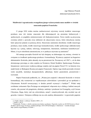 mgr Mateusz Pisarek doktorant katechetyki KUL Możliwości i ograniczenia ewangelizacyjnego wykorzystania mass mediów w świetle nauczania papieża Franciszka U progu XXI wieku można zaobserwować ożywiony rozwój środków masowego przekazu oraz ich istotne znaczenie dla dokonujących się przemian kulturowych i społecznych, co pogłębia zainteresowanie ich funkcjonowaniem. Nowe media są przyczyną swoistej euforii z powodu swej zdolności do ukazywania rzeczy, które dotychczas można było opisywać jedynie za pomocą słowa. Stosowane zamiennie określenia: środki masowego przekazu, mass media, środki masowego komunikowania, środki społecznego oddziaływania łączone są z prasą, radiem, telewizją, komputerem, Internetem, telefonem komórkowym 1. Mimo, iż są to określenia autonomiczne, to w praktyce używane są zamiennie2. Od samego początku Kościół nie był obojętny na dokonujące się zmiany, również te związane ze środkami społecznego przekazu i komunikacją. Wystarczy spojrzeć na bogactwo dokumentów Kościoła, jakie ukazały się na przestrzeni lat. Począwszy od 1967 r., aż do dnia dzisiejszego powstają co roku orędzia na Światowy Dzień Środków Społecznego Przekazu. Inicjatorem i pierwszym wydawcą takiego orędzia stał się papież Paweł VI i ta historia trwa nadal kiedy to Biskupem Rzymu jest papież Franciszek. Oprócz tego dzieła powstało również wiele encyklik, instrukcji duszpasterskich, adhortacji, listów pasterskich, przemówień i rozważań. Papież Franciszek podkreśla, że: „Ważna jest czujność i obecność Kościoła w świecie komunikacji, aby rozmawiać ze współczesnym człowiekiem i prowadzić go na spotkanie z Chrystusem: Kościół towarzyszący w drodze potrafi wyruszyć z każdym” 3. Widać tutaj ewidentne wskazanie Ojca Świętego na umiejętność włączenia się w dialog z ludźmi naszych czasów, aby poznać ich pragnienia, obiekcje, nadzieje i przekazać im Ewangelię, czyli Jezusa Chrystusa, Boga, który stał się człowiekiem, umarł i zmartwychwstał, aby uwolnić nas od grzechu i śmierci. Niniejsza refleksja ma na celu analizę dokumentów i wypowiedzi papieża 1 J. Gajda. Media w edukacji. Kraków 2003 s. 21. Tamże s. 20-21. 3 Franciszek. Przekaz w służbie autentycznej kultury spotkania. Papieskie orędzie na XLVIII Światowy Dzień Środków Społecznego Przekazu. [online] [dostęp: 24.01.2014] Dostępny w Internecie: < ścieżka dostępu: http://paulus.org.pl/display,219.html >. 2 Franciszka na temat mass mediów ich odpowiedzialnego wykorzystania w działalności ewangelizacyjnej. 1. Papieskie wezwanie do odważnego korzystania z nowych technologii W opublikowanym orędziu papieża Franciszka na 48. Dzień Środków Społecznego Przekazu już na początku dokumentu papież Franciszek zachęca do odważnego korzystania z nowych technologii, w tym sieci społecznościowych i przekazywania piękna Boga za ich pomocą. Wezwanie można odnaleźć w słowach: „Media mogą nam pomóc poczuć się bliżsi jedni drugich, tworząc odnowione poczucie jedności ludzkiej rodziny, które pobudza do solidarności i do poważnego zaangażowania na rzecz bardziej godnego życia” 4. Papież Franciszek dość często w swoich wystąpieniach używa terminu „odwaga” 5. Pewnie dlatego, że „Odwaga jest słusznie uznawana, za najważniejszą z cnót, ponieważ wszystkie inne są od niej uzależnione6”. Jedna z definicji odwagą nazywa działanie mimo niepewności, mimo strachu, bez gwarancji sukcesu, działanie bez widocznych rezultatów wbrew wewnętrznym obawom i przeszkodom. Odwaga ujawnia się w działaniu. W dzisiejszych czasach przedstawiona definicja bardzo mocno pozostaje aktualna. Podejmowane przez katolików odważne działania na rzecz ewangelizacji często nie są od razu widoczne i nie przynoszą natychmiastowego sukcesu, dopiero z perspektywy czasu owoc staje się widoczny. Papież Franciszek ponawia także wezwanie swojego poprzednika Jana Pawła II: „Wzywam cały Kościół do odważnego przekroczenia tego nowego progu, do wypłynięcia „na głębię” cyberprzestrzeni”7. Na taki apel widzialnej głowy Kościoła żaden katolik nie może pozostać obojętny, tym bardziej, że to wołanie wybrzmiewa po raz kolejny w nauczaniach ostatnich papieży. Obecnie wiele osób staje się tylko biernymi asymilatorami informacji, gdyż obawia się negatywnych komentarzy ze strony np. internautów, a jeśli osoba zdecyduje się na zamieszczenie swoich poglądów nie podpisuje się pod nimi. W swoim orędziu na 48. 4 Tamże. Podczas spotkania z wiernymi w Nowy Rok 2014 w Watykanie papież Franciszek modlił się o to, aby odwaga prowadzenia dialogu i pojednania zwyciężyła z pokusą zemsty oraz dominacji; w orędziu na Światowy Dzień Misyjny w 2013 r. pisze, że: „W tej złożonej sytuacji (…) sprawą pilną jest niesienie z odwagą w każdą rzeczywistość Ewangelii Chrystusa”; podczas homilii wygłoszonej 2 lipca 2013 w Domu Santhae Marthae powiedział, że Chrześcijanin musi mieć odwagę by uciec od kuszenia do grzechu, przez zwracanie się do Pana w chwilach słabości. 6 Winston Churchill. 7 Jan Paweł II. Internet: Nowe forum głoszenia ewangelii. Papieskie orędzie na XXXVI Światowy Dzień Środków Społecznego Przekazu. [online] [dostęp: 25.01.2014] Dostępny w Internecie: < ścieżka dostępu: http://paulus.org.pl/display,231.html >. 5 Światowy Dzień Środków Społecznego Przekazu papież Franciszek wyraźnie odcina się pasywnego „przechodzenia wzdłuż alei cyfrowych”8, gdzie człowiek jest zwyczajnie podłączony, żyje samotnie, zamknięty na innych. Ojciec Święty doskonale zdaje sobie sprawę z tego, że tylko od konkretnego człowieka zależy jak będzie wyglądał obraz mediów, w głównej mierze bowiem to ludzie kształtują rzeczywistość mass mediów. Dzisiaj właściwie każdy może stać się lub już jest posiadaczem jakiegoś medium, a wyst