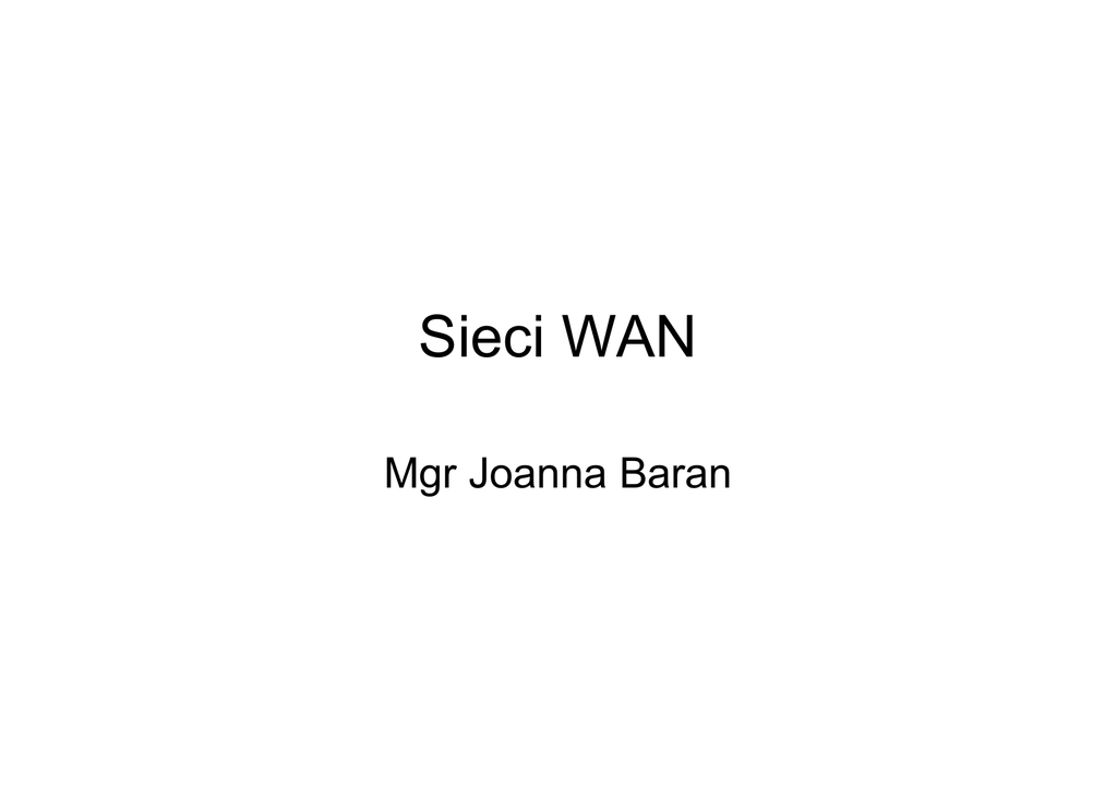 Sieci WAN Mgr Joanna Baran Technologie komunikacji w sieciach • Analogowa • Cyfrowa • Komutacji pakietów Połączenia analogowe Wykorzystanie analogowych linii telefonicznych do łączenia komputerów w sieci. Wady niska jakość i niewielka przepustowość. Możliwe jest również wykupienie dzierżawionego łącza analogowego (wysokie koszty). Połączenia cyfrowe Często spotykaną metodą łączenia sieci WAN jest korzystanie z dzierżawionych kanałów cyfrowych. Zapewniają one synchroniczne połączenie typu punktpunkt. Dzierżawienie kanału oznacza wykupienie od firmy komunikacyjnej „fragmentu” jej linii przesyłowych, stąd też stosowane jest niekiedy określenie „łącze stałe”. Techniki połączeń cyfrowych • • • • T1/E1 T3/E3 ISDN Switched 56 Komunikacja oparta na kanale cyfrowym CSU/DSU Konwertuje dane pochodzące z sieci na cyfrowe sygnały bipolarne, odpowiednie dla synchronicznego środowiska komunikacyjnego. Urządzenia CSU/DSU to sprzęt komunikacyjny znajdujący się na końcu kanałowych i cyfrowych urządzeń transmisyjnych. Zakończenie linii najczęściej ma postać modułowego gniazda. Sprzęt CSU/DSU umożliwia również połączenie szeregowe z routerem, znajdującym się w siedzibie użytkownika, co pokazane jest na rysunku. Jednostka CSU/DSU łącząca router z urządzeniem transmisyjnym T1/E1 T1 (w Europie — E1) to najszerzej stosowana technologia przy dużych prędkościach przesyłania danych. Pozwala na pełnodupleksowe przesyłanie sygnałów z szybkością 1,544 Mb/s. Może być wykorzystywana do przesyłania głosu, danych i sygnału wideo. Ze względu na wysoki koszt pełnego łącza T1, wielu abonentów decyduje się na korzystanie jedynie z jego części. Mogą oni wykupić jeden lub więcej kanałów o przepustowości 64 kb/s każdy. T3/E3 T3 może zapewnić jakość odpowiednią dla głosu i danych przy prędkości sięgającej 45 Mb/s. Jest to technologia o największej przepustowości spośród oferowanych obecnie na rynku. Podobnie jak w przypadku linii T1, również przy udostępnianiu łącz T3 jest oferowana możliwość wykupienia ich części, co jest alternatywą dla powielania łącz T1. ISDN Sieć Cyfrowa z Integracją Usług (ang. ISDN — Integrated Sewices Digital Network) to metoda łączenia sieci lokalnych, zaprojektowana pod kątem przesyłania zarówno danych i głosu, jak i obrazu. Abonenci tej usługi mogą korzystać z łącz podstawowych (basic rate ISDN) i rozszerzonych (primary rate ISDN). Dostęp podstawowy do sieci ISDN oznacza korzystanie z dwóch kanałów przesyłowych B o przepustowości 56 kb/s każdy, 8kilobitowego kanału sterującego łączem oraz kanału sygnalizacyjnego D (16 kb/s). Wykorzystanie obu kanałów B pozwala na uzyskanie łącznego strumienia danych o przepustowości 128 kb/s. • Dostęp rozszerzony daje możliwości podobne do łącza Tl: 30 kanałów B i jeden D (w Stanach Zjednoczonych tylko 23+1). Kanał sygnalizacyjny D ma w tym przypadku przepustowość 64 kb/s. • Interfejs ISDN zestawia połączenia na żądanie. Określone łącze nie pozostaje bezustannie zajęte — jest ono zestawiane tylko na czas użytkowania. Switched 56 (zestawiane kanały cyfrowe) • • System ten udostępnia szybkość transmisji 56 Kbps między dwoma dowolnymi punktami korzystającymi z tej usługi. Podobnie jak w przypadku pozostałych systemów telefonicznych, przed nawiązaniem połączenia nie istnieje żaden obwód łączący owe punkty. Obwód taki jest zestawiany w chwili nawiązania połączenia między punktem źródłowym i docelowym. Użytkownicy nie znają rzeczywistych ścieżek połączenia w infrastrukturze telekomunikacyjnej, a informacje na ten temat nie mają dla nich znaczenia. Opisywany obwód przestaje istnieć po zakończeniu połączenia. Ponieważ system Switched 56 nie ma charakteru łącz dedykowanych, jest on przystępną alternatywą dla linii dzierżawionych. Użytkownik płaci proporcjonalnie do korzystania z usługi, a nie za luksus posiadania całego pasma zarezerwowanego dla własnych potrzeb, niezależnie od stopnia jego wykorzystania. Wadą tego systemu jest jego mała wydajność. Obwody w systemie Switched 56 muszą być zestawiane w chwili żądania połączenia, co zajmuje określony czas. Dlatego połączenie przez dzierżawioną linię 56 Kbps może być nawiązane o wiele szybciej niż przy wykorzystaniu systemu Switched 56. Po nawiązaniu połączenia wydajność obu typów łączy powinna być zbliżona. Pakietowe sieci komutowane W pakietowych sieciach komutowanych ich końcówki zestawiane są niemal dowolnie. Niekiedy określa się je jako sieci kratowe lub oczkowe. Droga przesyłania informacji nie jest w nich w nich jednoznacznie określona. Przesyłane dane są dzielone na mniejsze pakiety. Do każdego dołączany jest adres jego miejsca przeznaczenia i numer porządkowy. Droga pakietów do celu jest określana zawsze według zasady najlepszej dostępnej ścieżki (ang. best current path); jest ona wybierana niezależnie dla każdego pakietu. Uszkodzenie jednego z połączeń w trakcie wykonywania transmisji nie powoduje w takiej sytuacji konieczności ponownego wysyłania wszystkich pakietów. Kolejne są wysyłane inną trasą. Popularne realizacje sieci pakietowych • X.25 • Frame Relay • ATM x.25 W sieci X.25 połączenie inicjowane przez jedną ze stacji pozwala na pełnodupleksowe przesyłanie danych do czasu rozwiązania połączenia przez jednego z dwóch uczestników. Terminal sieciowy użytkownika (ang. DTE — data terminal equipment) tworzy połączenie typu punkt-punkt z zapewniającym dostęp do sieci urządzeniem w firmie telekomunikacyjnej (lub ośrodku uniwersyteckim). Jest ono ogólnie określane jako DCE (data circuitterminating equipment — urządzenie kończące obwód). W połączeniu tym pośredniczy tzw. PAD (ang. packet assembler/disassembler). Urządzenie DCE jest połączone z centralami komutacji pak