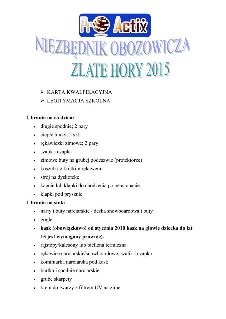 KARTA KWALFIKACYJNA LEGITYMACJA SZKOLNA Ubrania na co dzień: długie spodnie; 2 pary ciepłe bluzy; 2 szt. rękawiczki zimowe; 2 pary szalik i czapka zimowe buty na grubej podeszwie (protektorze) koszulki z krótkim rękawem strój na dyskotekę kapcie lub klapki do chodzenia po pensjonacie klapki pod prysznic Ubrania na stok: narty i buty narciarskie / deska snowboardowa i buty gogle kask (obowiązkowo! od stycznia 2010 kask na głowie dziecka do lat 15 jest wymagany prawnie). rajstopy/kalesony lub bielizna termiczna rękawice narciarskie/snowboardowe, szalik i czapka kominiarka narciarska pod kask kurtka i spodnie narciarskie grube skarpety krem do twarzy z filtrem UV na zimę Inne: mały plecaczek przybory toaletowe na basen: kąpielówki/kostium kąpielowy, czepek, okularki do pływania Jeśli podejmą Państwo decyzję, że kieszonkowe ma być w depozycie u wychowawcy proszę, żeby pieniądze zostały przekazane na zbiórce w podpisanej nazwiskiem dziecka kopercie! Małe nominały 10pln , 20pln bez bilonu. Aviomarin na podróż, oraz lekarstwa, które dziecko przyjmuje stale wraz z informacją od rodziców o dawkowaniu leku. W przypadku jakichkolwiek dodatkowych informacji dotyczących zdrowia Państwa dziecka prosimy o dokładny opis dolegliwości i sposób podawania leku w karcie obozowej uczestnika (ew. podać dodatkowe zalecenia lekarza prowadzącego). Cenne też będą informacje na temat specyficznych zachowań czy cech charakteru dziecka, jak również inne uwagi, na które wychowawca powinien zwrócić uwagę.