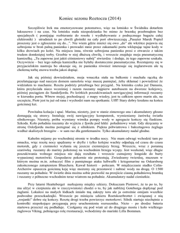 Koniec sezonu Roztocza (2014) Szczęśliwie Irek ma zmotoryzowane potomstwo, więc na lotnisko w Świdniku dotarłem luksusowo i na czas. Na lotnisku mała niespodzianka bo mimo że bramkę przebrnąłem bez specjalnych ( pomijając rozbieranie do rosołu i wydłubywanie z podręcznego bagażu całej elektroniki ) utrudnień to po chwili głośniki na cały port obwieszczają „Pasażer Marek Popiel proszony jest o zgłoszenie się do...”. Nie wiem gdzie mieści się owo „do” ale wkrótce pojawia się uzbrojona w broń palną panienka i prowadzi mnie przez zakamarki portu wklepując tajne kody w kilku drzwiach po kolei. Na miejscu inna, równie uzbrojona panienka prosi o otwarcie z takim trudem domkniętej torby. Grzebie w niej dłuższą chwilę, i wreszcie znajduje moja pneumatyczną kamizelkę. „Tu zapewne jest jakiś ciśnieniowy nabój” stwierdza i dodaje, że tego zapewne szukała. Oczywiście – bez tego naboju kamizelka nie byłaby dostatecznie pneumatyczna. Rozstajemy się w przyjacielskim nastroju bo okazuje się, że panienka również interesuje się żeglarstwem ale tą cholerną torbę znowu trzeba jakoś dopiąć. Jak się później dowiedziałem, moja wnuczka stała na balkonie i machała rączką do przelatującego nad naszym domem samolotu więc muszę pamiętać, żeby skłamać i powiedzieć że widziałem to machanie. Reszta podróży prtzebiega bez przygód.. Na lotnisku czeka już Danusia, która przyleciała nieco wcześniej i razem ruszamy najpierw autobusem na dworzec kolejowy, później pociągiem do Sandefjordu. Po krótkich poszukiwaniach nawigacyjnej informacji ruszamy w kierunku portu. Wbrew mojej, pochodzącej z mapy wiedzy, jest tu całkiem sporo marin ale, na szczęście, Piotr jest tu już od rana i wychodzi nam na spotkanie. Ufff! Stary dobry kredens na końcu gościnnej kei. Powitalna kolacja i spać. Marina, niestety, jest w stanie zimowego snu i akumulatory głosno domagają się strawy. Instaluję swój nawigacyjny komputerek, wymieniamy żarówkę światła silnikowego. Niestety, próba wymiany wirnika pompy wody w agregacie kończy się fiaskiem. Szkoda. Koło południa ruszamy do wyjścia z fjordu pod lekki południowy wiatr. Gdy skręcamy w stronę Oslofjordu można pożegnać się z silnikiem. Piękna półwiatrowa i baksztagowa żegluga wzdłuż skalistych brzegów – w sam raz dla gentlemanów. Tylko akumulatory nadal głodne. Kaholm mijamy po wschodniej stronie w środku nocy. Nie mam odwagi wchodzić tam po omacku, więc resztę nocy spędzamy w dryfie i tylko kolejne wachty odpalają od czasu do czasu motorek, gdy z ciemności wyłania się jeszcze ciemniejszy brzeg. Wreszcie, wraz z poranną szarówką ruszamy do mariny położonej na wschodnim brzegu wyspy. Jest weekend, więc długie poszukiwania wolnego miejsca nie dają rezultatu i wreszcie cumujemy longside do burty wypasionej motorówki. Gospodarze pokornie nie protestują. Zwiedzamy twierdzę, muzeum w którym można m.in. zobaczyć film z pamiętnego ataku luftwaffe i kriegsmarine na Oskarsborg zakończonego zatopieniem Bluechera. Kawał historii – polecam. W międzyczasie stadko ColinArcherów opuszcza gościnną keję więc możemy się przestawić i nabrać wody na drogę. O 1500 ruszamy na południe. W świetle dnia można sobie pozwolić na przejście ciasną południową bramką i ruszamy z północno wschodnim teraz wiatrem na południe. Akumulatory nadal cieniutkie. Przy latarni Heatteberget nurkujemy między szkiery. Dokuczam Piotrowi, że to po to, by mu ulżyć w cierpieniu ale w rzeczywistości chodzi o to, by jak nabliżej Goteborga dopłynąć pod żaglami. Lokalesi na małych łódkach śmiało tną zakręty toru ale ja ostrożnie omijam wszelkie podwodne przeszkadzajki. Wreszcie po minięciu szkieru Roetskoerbrottet i związanej z nią „rosjanki” dobre się kończy. Resztę drogi trzeba powierzyc motorkowi. Silnik startuje niechętnie a kontrolki niepokojąco przygasają przy uruchomieniu rozrusznika. Nicto – po drodze bateria startowa przecież się podładuje. Czołgamy się pod wiatr aż do drugiego mostu i koło wielkiego żaglowca Viking, pełniącego rolę rrestauracji, wchodzimy do marinki Lilla Bommen. W planie jest wyjście przed południem i odwiedzenie po drodze muzeum Volvo mieszczącego się w Arendal, przedmieściu Goteborga jednakże próba uruchomienia silnika konczy się niepowodzeniem. Silnik ledwo się obraca a przy następnej próbie słyczać tylko stukanie elektromagnesu. Identyfikacja akumulatora rozruchowego wymagało telefonicznej konsultacji z Prezesem po czym rozpoczyna się ładowania winowajcy. Po prawdzie to ofiary a nie winowajcy bo szybko się okazuje, że pasek napędzający alternator obwodu rozruchowego jest luźny i alternator można bez oporu obracać palcami. Znajdujemy nawet stosowna kolekcje pasków ale okazuje się, ze nie wymaga on wymiany. Wystarczy go porządnie napiąć. Aby wykorzystać czas potrzebny do naładowania akumulatora, postanowiamy odwiedzić muzeum Volvo drogą lądową. Danusia udaje się do informacji turystycznej gdzie nabywa stosowne bilety a i zasięga szczegółowych informacji na temat pożądanych numerów linii. Po wrażenia z muzeum odsyłam do galerii zdjęć. W każdym razie, warto było. Po powrocie okazuje się, ze wprawdzie akumulator jest przyzwoicie naładowany ale rozrusznik nie startuje i nawet nie słychać szczęku bendixu. Pamiętając o istnieniu nowiutkiego, błyszczącego elektromagnesu, przystępujemy do jego demontażu. Próby odkręcenia zacisków elektrycznych okazują się bezowocne ale na pociechę bendix po oczyszczeniu zacisków wraca do życia. Kolejne próby rozruchu potwierdzają sukces a napięcie mierzone na akumulatorze rozruchowym wynosi ca 14V zatem można uznać, że alternator również spełnia swoje zadanie. Zrobił się jednak wieczór i postanowiamy wyruszyć dopiero następnego dnia bladym świtem. Rano wczesna pobudka i w drogę. W porcie
