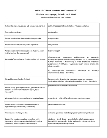KARTA ZGŁOSZENIA SEMINARIUM DYPLOMOWEGO Elżbieta Jaszczyszyn, dr hab. prof. UwB Imię i nazwisko promotora, tytuł naukowy Jednostka: katedra, zakład lub pracownia, kontakt Zakład Pedagogiki Przedszkolnej i Wczesnoszkolnej Dyscyplina naukowa pedagogika Rodzaj seminarium: licencjackie/magisterskie magisterskie Tryb studiów: stacjonarny/niestacjonarny stacjonarny Adresaci seminarium (specjalność studiów, jeżeli jest to istotne dla promotora) brak wymagań Tematyka/obszar badań (maksymalnie 1/3 strony) a)kompetencje zawodowe debiutantów w zawodzie nauczyciela przedszkola i nauczyciela klas I – III, realizowanie funkcji naukowo – badawczej, a wiec tworzenie własnych programów dydaktyczno–wychowawczych wraz z analizą ich efektywności; b) wykorzystanie środowiska obywatelskiej dzieci i dorosłych; Słowa kluczowe (maks. 7 słów) lokalnego w edukacji kompetencje, debiutant w zawodzie, program autorski, środowisko lokalne, edukacja obywatelska dzieci i dorosłych praca badawcza: badania terenowe Rodzaj pracy (praca projektowa, praca badawcza: badania terenowe lub badania typu „desk research”) Wymagania dotyczące znajomości języka obcego rozumienie i zdolność analizy tekstu obcojęzycznego Preferowane podejście badawcze w pracy dyplomowej (jakościowe / ilościowe) jakościowe/ilościowe Preferowane metody badań dobrane zgodnie z metodologią zaprojektowanych badań Badani (tu należy wpisać ewentualnie wiek badanych, miejsce prowadzenia badań (rodzaj placówki), orientacyjna liczba badanych studenci – UwB; dzieci – przedszkole, szkoła podstawowa (klasy I-III); nauczyciele; liczba badanych - odpowiednio do opracowanej metodologii badań Wymagana znajomość programów do obliczania wyników (wymagana/ nie wymagana) wymagana Inne wymagania lub informacje chęć do pracy i współpracy