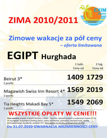 ZIMA 2010/2011 Zimowe wakacje za pół ceny – oferta limitowana EGIPT Hurghada 1 tydz. Ceny od Beirut 3* 2 tyg. Ceny od 1409 1729 2 posiłki Magawish Swiss Inn Resort 4* 1569 2019 2 posiłki Tia Heights Makadi Bay 5* 1549 2069 2 posiłki WSZYSTKIE OPŁATY W CENIE!!! Cena zawiera: przelot, transfer lotnisko – hotel – lotnisko, zakwaterowanie w wybranym hotelu (7 lub 14 noclegów), wyżywienie według oferty, opłaty lotniskowe, paliwowe, ubezpieczenie, opiekę polskojęzycznego rezydenta, podatek VAT. Wiza płatna na lotnisku w Hurghadzie 15 USD Do 31.07.2010 GWARNACJA NIEZMIENNOŚCI CENY