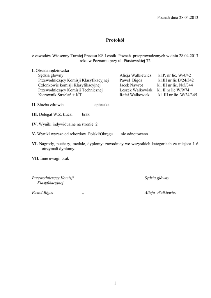 Poznań dnia 28.04.2013 Protokół z zawodów Wiosenny Turniej Prezesa KS Leśnik Poznań przeprowadzonych w dniu 28.04.2013 roku w Poznaniu przy ul. Piastowskiej 72 I. Obsada sędziowska Sędzia główny Przewodniczący Komisji Klasyfikacyjnej Członkowie komisji Klasyfikacyjnej Przewodniczący Komisji Technicznej Kierownik Strzelań + KT II. Służba zdrowia III. Delegat W.Z. Łucz. Alicja Walkiewicz Paweł Bigos Jacek Nawrot Leszek Walkowiak Rafał Walkowiak kl.P. nr lic. W/4/42 kl.III nr lic B/24/342 kl. III nr lic. N/5/344 kl. II nr lic W/9/74 kl. III nr lic. W/24/345 apteczka brak IV. Wyniki indywidualne na stronie 2 V. Wyniki wyższe od rekordów Polski/Okręgu nie odnotowano VI. Nagrody, puchary, medale, dyplomy: zawodnicy we wszystkich kategoriach za miejsca 1-6 otrzymali dyplomy. VII. Inne uwagi. brak Przewodniczący Komisji Klasyfikacyjnej Paweł Bigos Sędzia główny .. Alicja Walkiewicz 1 WYNIKI INDYWIDUALNE Miejsce 1 2 3 4 5 6 7 8 9 10 11 12 13 14 15 16 17 Mężczyźni Nazwisko i imię Ogrodowczyk Mateusz Czapczyk Marcin Napieralski Tomasz Dietrich Mariusz Wiśniewski Adam Zięciak Jakub Targowicki Błażej Pawlaczyk Mikołaj Nawrocki Bartosz Matyja Ludwik Krol Jacek Ignaczak Jakub Zakrzewski Jacek Wawrzyniak Mieszko Sajkiewicz Radosław Piotrowski Rafał Sierka Sebastian Ru 98 96 94 68 96 91 93 80 79 97 96 92 67 97 80 83 97 Klub OŚ AZS Poznań OŚ AZS Poznań OŚ AZS Poznań KS Leśnik KS Leśnik OŚ AZS Poznań KS Leśnik KS Leśnik KS Leśnik OŚ AZS Poznań KS Leśnik KS Leśnik OŚ AZS Poznań KS Leśnik KS Leśnik KS Leśnik KS Leśnik 50 m 302 273 253 249 232 221 167 186 175 142 152 70 108 97 56 40 23 30 m 320 316 325 303 267 260 275 250 249 277 197 190 148 145 175 184 83 ŁB 622 589 578 552 499 481 442 436 424 419 349 260 256 242 231 224 106 Kobiety Miejsce 1 2 3 4 Nazwisko i imię Kaczmarek Adrianna Englert Anna Silna Paulina Mrozińska Aleksandra Ru 93 97 97 90 Klub OŚ AZS Poznań KS Leśnik KS Leśnik KS Leśnik 50 m 215 167 119 34 30 m 294 214 245 108 ŁB 509 381 364 142 Miejsce 1 2 3 4 5 6 7 Młodzicy Nazwisko i imię Czapczyk Michał Budziński Cezary Kasprzak Konrad Pawelec Józef Maciej Gronowski Jakub Dietrich Michalak Maksymilian Ru 99 00 00 00 99 99 00 Klub OŚ AZS Poznań OŚ AZS Poznań OŚ AZS Poznań OŚ AZS Poznań KS Leśnik KS Leśnik OŚ AZS Poznań 30 m 283 280 242 237 207 176 165 30 m 298 283 250 243 211 170 136 2x30 m 581 563 492 480 418 346 301 Miejsce 1 2 3 4 5 6 Młodziczki Nazwisko i imię Kujawa Weronika Gruszka Paula Ziemna Joanna Zimna Agnieszka Kubisiak Karolina Bańkowska Katarzyna Ru 99 99 97 95 00 99 Klub KS Leśnik KS Leśnik OŚ AZS Poznań KS Leśnik KS Leśnik KS Leśnik 30 m 307 235 192 155 131 78 30 m 309 200 240 181 95 55 2x30 m 616 435 432 336 226 133 Ru Klub UKS Jedynka Kórnik SKS Sokół Radzewo UKŁ Leśnik 2x15 2x10 Suma 241 289 530 34 130 164 Chłopcy Miejsce Nazwisko i imię 1 Radziejewski Bartosz 01 2 Pawlaczyk Wojciech 03 2 Miejsce 1 2 Miejsce 1 2 3 4 Dziewczęta Nazwisko i imię Kordylewska Wiktoria Ru 00 Banecka Kinga 03 Bloczkowcy OPEN Nazwisko i imię Król Andrzej Dewicki Grzegorz Kraśnicki Maciej Golińska Agata Ru 55 79 91 83 Klub KS Leśnik UKS Jedynka Kórnik SKS Sokół Radzewo 2x15 156 2x10 254 Suma 410 164 197 361 Klub KS Leśnik KS Leśnik KS Leśnik KS Leśnik 50 m 326 331 311 221 50 m 318 312 320 235 2x50 m 644 643 631 456 3
