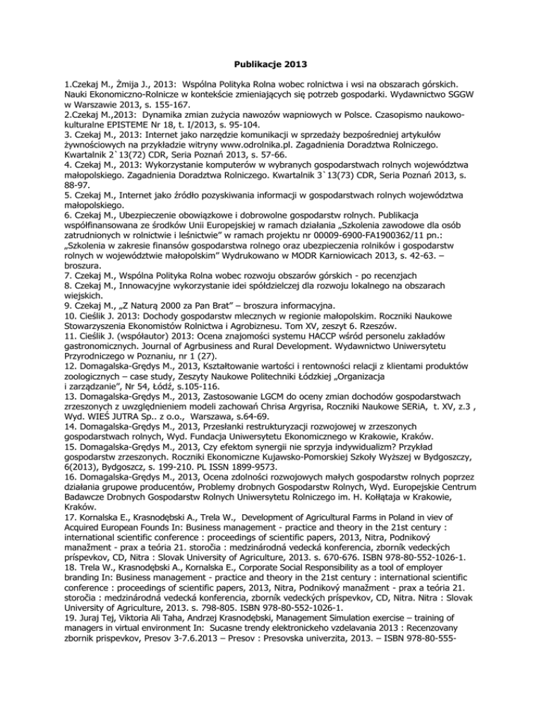 Publikacje 2013 1.Czekaj M., Żmija J., 2013: Wspólna Polityka Rolna wobec rolnictwa i wsi na obszarach górskich. Nauki Ekonomiczno-Rolnicze w kontekście zmieniających się potrzeb gospodarki. Wydawnictwo SGGW w Warszawie 2013, s. 155-167. 2.Czekaj M.,2013: Dynamika zmian zużycia nawozów wapniowych w Polsce. Czasopismo naukowokulturalne EPISTEME Nr 18, t. I/2013, s. 95-104. 3. Czekaj M., 2013: Internet jako narzędzie komunikacji w sprzedaży bezpośredniej artykułów żywnościowych na przykładzie witryny www.odrolnika.pl. Zagadnienia Doradztwa Rolniczego. Kwartalnik 2`13(72) CDR, Seria Poznań 2013, s. 57-66. 4. Czekaj M., 2013: Wykorzystanie komputerów w wybranych gospodarstwach rolnych województwa małopolskiego. Zagadnienia Doradztwa Rolniczego. Kwartalnik 3`13(73) CDR, Seria Poznań 2013, s. 88-97. 5. Czekaj M., Internet jako źródło pozyskiwania informacji w gospodarstwach rolnych województwa małopolskiego. 6. Czekaj M., Ubezpieczenie obowiązkowe i dobrowolne gospodarstw rolnych. Publikacja współfinansowana ze środków Unii Europejskiej w ramach działania „Szkolenia zawodowe dla osób zatrudnionych w rolnictwie i leśnictwie” w ramach projektu nr 00009-6900-FA1900362/11 pn.: „Szkolenia w zakresie finansów gospodarstwa rolnego oraz ubezpieczenia rolników i gospodarstw rolnych w województwie małopolskim” Wydrukowano w MODR Karniowicach 2013, s. 42-63. – broszura. 7. Czekaj M., Wspólna Polityka Rolna wobec rozwoju obszarów górskich - po recenzjach 8. Czekaj M., Innowacyjne wykorzystanie idei spółdzielczej dla rozwoju lokalnego na obszarach wiejskich. 9. Czekaj M., „Z Naturą 2000 za Pan Brat” – broszura informacyjna. 10. Cieślik J. 2013: Dochody gospodarstw mlecznych w regionie małopolskim. Roczniki Naukowe Stowarzyszenia Ekonomistów Rolnictwa i Agrobiznesu. Tom XV, zeszyt 6. Rzeszów. 11. Cieślik J. (współautor) 2013: Ocena znajomości systemu HACCP wśród personelu zakładów gastronomicznych. Journal of Agrbusiness and Rural Development. Wydawnictwo Uniwersytetu Przyrodniczego w Poznaniu, nr 1 (27). 12. Domagalska-Grędys M., 2013, Kształtowanie wartości i rentowności relacji z klientami produktów zoologicznych – case study, Zeszyty Naukowe Politechniki Łódzkiej „Organizacja i zarządzanie”, Nr 54, Łódź, s.105-116. 13. Domagalska-Grędys M., 2013, Zastosowanie LGCM do oceny zmian dochodów gospodarstwach zrzeszonych z uwzględnieniem modeli zachowań Chrisa Argyrisa, Roczniki Naukowe SERiA, t. XV, z.3 , Wyd. WIEŚ JUTRA Sp.. z o.o., Warszawa, s.64-69. 14. Domagalska-Grędys M., 2013, Przesłanki restrukturyzacji rozwojowej w zrzeszonych gospodarstwach rolnych, Wyd. Fundacja Uniwersytetu Ekonomicznego w Krakowie, Kraków. 15. Domagalska-Grędys M., 2013, Czy efektom synergii nie sprzyja indywidualizm? Przykład gospodarstw zrzeszonych. Roczniki Ekonomiczne Kujawsko-Pomorskiej Szkoły Wyższej w Bydgoszczy, 6(2013), Bydgoszcz, s. 199-210. PL ISSN 1899-9573. 16. Domagalska-Grędys M., 2013, Ocena zdolności rozwojowych małych gospodarstw rolnych poprzez działania grupowe producentów, Problemy drobnych Gospodarstw Rolnych, Wyd. Europejskie Centrum Badawcze Drobnych Gospodarstw Rolnych Uniwersytetu Rolniczego im. H. Kołłątaja w Krakowie, Kraków. 17. Kornalska E., Krasnodębski A., Trela W., Development of Agricultural Farms in Poland in viev of Acquired European Founds In: Business management - practice and theory in the 21st century : international scientific conference : proceedings of scientific papers, 2013, Nitra, Podnikový manažment - prax a teória 21. storočia : medzinárodná vedecká konferencia, zborník vedeckých príspevkov, CD, Nitra : Slovak University of Agriculture, 2013. s. 670-676. ISBN 978-80-552-1026-1. 18. Trela W., Krasnodębski A., Kornalska E., Corporate Social Responsibility as a tool of employer branding In: Business management - practice and theory in the 21st century : international scientific conference : proceedings of scientific papers, 2013, Nitra, Podnikový manažment - prax a teória 21. storočia : medzinárodná vedecká konferencia, zborník vedeckých príspevkov, CD, Nitra. Nitra : Slovak University of Agriculture, 2013. s. 798-805. ISBN 978-80-552-1026-1. 19. Juraj Tej, Viktoria Ali Taha, Andrzej Krasnodębski, Management Simulation exercise – training of managers in virtual environment In: Sucasne trendy elektronickeho vzdelavania 2013 : Recenzovany zbornik prispevkov, Presov 3-7.6.2013 – Presov : Presovska univerzita, 2013. – ISBN 978-80-555- 0745-3. – s. 184-190. 20. Viktória Ali Taha, Juraj Tej, Andrzej Krasnodębski, Vnímanie manažérskych simulácií a tvorivých metód účastníkmi simulačných cvičení - komparácia slovenských a poľských študentov In: Sociálne javy v kultúrnom a osobnostnom kontente. Nekonferenčný vedecký zborník recenzovaných štúdií s medzinárodnou účasťou, CD, Presov : Presovska univerzita, 2013. – ISBN 978-80-8165-014-7, s. 9-20. 21. Horska E., Szafrańska M., Matysik-Pejas R., 2013. Knowledge and financial skills as the factors determining the financial exclusion process of rural dwellers in Poland. Agricultural Economics (Zem d lská Ekonomika), 59, 2013 (1), s. 29-37. ISSN 0139-570X. 22. Matysik-Pejas R., Pakosz I. 2013. Działania merchandisingowe i ich wpływ na klientów sklepów wielkopowierzchniowych. Polityki Europejskie, Finanse i Marketing. Zeszyty Naukowe SGGW w Warszawie, Nr 9 (58) 2013, s. 340-350. 23. Matysik-Pejas R., 2013. Innowacyjność producentów żywności w Polsce na tle producentów z krajów Unii Europejskiej. Episteme 18/2013, t. 1, s. 245-252. 24. Matysik-Pejas R., Szafrańska M., Żmija J., 2013. Behaviours of loyalty programme participants. 25. Matysik-Pejas R., Szafrańska M., Sowula M. 2013. Perception of private labels by purchasers of food products. 26. Żmija J., Tyran E. – Sustainable development of agriculture and changes in South-eastern Poland – Malopolska District