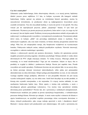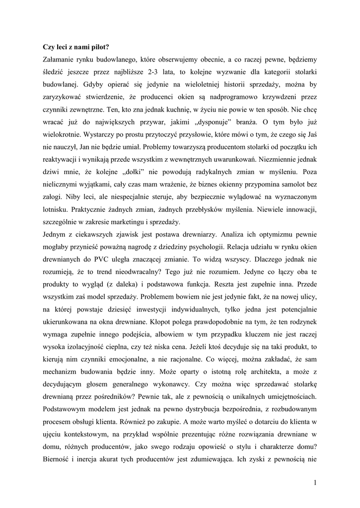 Czy leci z nami pilot? Załamanie rynku budowlanego, które obserwujemy obecnie, a co raczej pewne, będziemy śledzić jeszcze przez najbliższe 2-3 lata, to kolejne wyzwanie dla kategorii stolarki budowlanej. Gdyby opierać się jedynie na wieloletniej historii sprzedaży, można by zaryzykować stwierdzenie, że producenci okien są nadprogramowo krzywdzeni przez czynniki zewnętrzne. Ten, kto zna jednak kuchnię, w życiu nie powie w ten sposób. Nie chcę wracać już do największych przywar, jakimi „dysponuje” branża. O tym było już wielokrotnie. Wystarczy po prostu przytoczyć przysłowie, które mówi o tym, że czego się Jaś nie nauczył, Jan nie będzie umiał. Problemy towarzyszą producentom stolarki od początku ich reaktywacji i wynikają przede wszystkim z wewnętrznych uwarunkowań. Niezmiennie jednak dziwi mnie, że kolejne „dołki” nie powodują radykalnych zmian w myśleniu. Poza nielicznymi wyjątkami, cały czas mam wrażenie, że biznes okienny przypomina samolot bez załogi. Niby leci, ale niespecjalnie steruje, aby bezpiecznie wylądować na wyznaczonym lotnisku. Praktycznie żadnych zmian, żadnych przebłysków myślenia. Niewiele innowacji, szczególnie w zakresie marketingu i sprzedaży. Jednym z ciekawszych zjawisk jest postawa drewniarzy. Analiza ich optymizmu pewnie mogłaby przynieść poważną nagrodę z dziedziny psychologii. Relacja udziału w rynku okien drewnianych do PVC uległa znaczącej zmianie. To widzą wszyscy. Dlaczego jednak nie rozumieją, że to trend nieodwracalny? Tego już nie rozumiem. Jedyne co łączy oba te produkty to wygląd (z daleka) i podstawowa funkcja. Reszta jest zupełnie inna. Przede wszystkim zaś model sprzedaży. Problemem bowiem nie jest jedynie fakt, że na nowej ulicy, na której powstaje dziesięć inwestycji indywidualnych, tylko jedna jest potencjalnie ukierunkowana na okna drewniane. Kłopot polega prawdopodobnie na tym, że ten rodzynek wymaga zupełnie innego podejścia, albowiem w tym przypadku kluczem nie jest raczej wysoka izolacyjność cieplna, czy też niska cena. Jeżeli ktoś decyduje się na taki produkt, to kierują nim czynniki emocjonalne, a nie racjonalne. Co więcej, można zakładać, że sam mechanizm budowania będzie inny. Może oparty o istotną rolę architekta, a może z decydującym głosem generalnego wykonawcy. Czy można więc sprzedawać stolarkę drewnianą przez pośredników? Pewnie tak, ale z pewnością o unikalnych umiejętnościach. Podstawowym modelem jest jednak na pewno dystrybucja bezpośrednia, z rozbudowanym procesem obsługi klienta. Również po zakupie. A może warto myśleć o dotarciu do klienta w ujęciu kontekstowym, na przykład wspólnie prezentując różne rozwiązania drewniane w domu, różnych producentów, jako swego rodzaju opowieść o stylu i charakterze domu? Bierność i inercja akurat tych producentów jest zdumiewająca. Ich zyski z pewnością nie 1 opierają się na samym produkcie, choć ten musi być oczywiście dostosowany jakościowo do wymagań rynku, ale przede wszystkim w obszarze klimatu sprzedaży. Ten segment jako pierwszy oddzieli chłopców od mężczyzn. Głośne sugestie, że produkt drewniany nie ma przyszłości, drażnią mnie do tego stopnia, że nie potrafię tego bezczynnie słuchać. Takie podejście świadczy o niesamowitej ignorancji, ale przede wszystkim o udowadnia najgorsze słabości kategorii. Przypomina także, jakie są prawdziwe korzenie obecnych producentów. W tym miejscu przypomina się automatycznie zasada progu niekompetencji, zwana zasadą Petera, która opiera się na prostej obserwacji - w organizacjach awans jest zazwyczaj uzależniony od rezultatów osiąganych przez daną osobę na jej poprzednim stanowisku. Ponieważ każdy awansujący pracownik otrzymuje nowe obowiązki i musi stosować kompetencje, których dotychczas nie wykorzystywał wcale (lub wykorzystywał w mniejszym zakresie), istnieje duże prawdopodobieństwo, że przy którymś z kolei awansie okaże się "niekompetentny" w nowej roli. W tym przypadku odnosi się jednak przede wszystkim do właścicieli i faktu, że nie nadążają za wzrostem własnego przedsiębiorstwa. Czy zjawisko, które opisuję jest powszechne? Na moje oko tak, choć są chlubne wyjątki. A już prawdziwe perełki można znaleźć w produktach pokrewnych. Aby się przekonać, warto wejść na stronę firmy Marchewka, fantastycznego twórcy podłóg, drzwi i schodów. Nieprzygotowanych może dotknąć wręcz coś w rodzaju nieśmiałości. Kunszt i jakość aż dźwięczy w uszach. Drewno to materiał szlachetny, którego renesans będzie następował cyklicznie, a popyt na niego nigdy nie zejdzie poniżej określonego poziomu. Wygrać jednak mogą jedynie ci, którzy podejdą do tematu z należnym szacunkiem. Czy w wyrobach plastikowych sytuacja przedstawia się lepiej? Nic z tych rzeczy. Tam po prostu istnieje inna grupa słabości. Popatrzymy na dystrybucję. Typowy model to dostarczanie produktu poprzez niezależnych pośredników handlowych, niesmacznie określanych mianem dealerów. Przeciętny dystrybutor pracuje na powierzchni sprzedażowej rzędu 25 m², mając na ekspozycji pięć okien trzech różnych przedsiębiorstw. Z tego jedno drogie, które ma podkreślać jakość, kilka w średniej cenie jako zapychacz i kluczowe w cenie papieru toaletowego, które de facto stanowi 90% obrotu. Doskonale rozumiem producenta, który świadomie zdecydował się na walkę cenową. Ale co robią w tym miejscu pozostali? To jest zagadka. Tym bardziej, że odgrywana przez nich rola wabia jest absolutnie świadoma. Zaś ich tłumaczenie brzmi mniej więcej tak – „on (czytaj: dealer) od czasu do czasu coś tam sprzeda, więc nie ma problemu”. Kuriozum. Przecież tak polityka prowadzi do nikąd. Biorąc pod uwagę, że w oknach PVC trudno jest dostrzec wielkie różnice, a każdy ma dostęp do tych samych komponentów, można rzecz, że taka strategia nazywa 