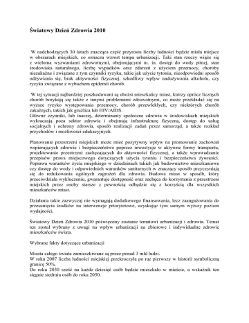 Światowy Dzień Zdrowia 2010 W nadchodzących 30 latach znacząca część przyrostu liczby ludności będzie miała miejsce w obszarach miejskich, co oznacza wzrost tempa urbanizacji. Taki stan rzeczy wiąże się z wieloma wyzwaniami zdrowotnymi, obejmującymi m. in. dostęp do wody pitnej, stan środowiska naturalnego, liczbę wypadków oraz zdarzeń z użyciem przemocy, choroby niezakaźne i związane z tym czynniki ryzyka, takie jak użycie tytoniu, nieodpowiedni sposób odżywiania się, brak aktywności fizycznej, szkodliwy wpływ nadużywania alkoholu, czy ryzyka związane z wybuchem epidemii chorób. W tej sytuacji najbardziej poszkodowani są ubożsi mieszkańcy miast, którzy oprócz licznych chorób borykają się także z innymi problemami zdrowotnymi, co może przekładać się na wyższe ryzyko występowania przemocy, chorób przewlekłych, czy niektórych chorób zakaźnych, takich jak gruźlica lub HIV/AIDS. Główne czynniki, lub inaczej, determinanty społeczne zdrowia w środowiskach miejskich wykraczają poza sektor zdrowia i obejmują infrastrukturę fizyczną, dostęp do usług socjalnych i ochrony zdrowia, sposób realizacji zadań przez samorząd, a także rozkład przychodów i możliwości edukacyjnych. Planowanie przestrzeni miejskich może mieć pozytywny wpływ na promowanie zachowań wspierających zdrowie i bezpieczeństwo poprzez inwestycje w aktywne formy transportu, projektowanie przestrzeni zachęcających do aktywności fizycznej, a także wprowadzanie przepisów prawa miejscowego dotyczących użycia tytoniu i bezpieczeństwa żywności. Poprawa warunków życia miejskiego w dziedzinach takich jak budownictwo mieszkaniowe czy dostęp do wody i odpowiednich warunków sanitarnych w znaczący sposób przyczyniają się do redukowania ogólnych zagrożeń dla zdrowia. Budowa miast w sposób, który przeciwdziała wykluczeniu, gwarantuje dostępność oraz zachęca do korzystania z przestrzeni miejskich przez osoby starsze z pewnością odbędzie się z korzyścią dla wszystkich mieszkańców miast. Działania takie zazwyczaj nie wymagają dodatkowego finansowania, lecz zaangażowania do przesunięcia środków na interwencje priorytetowe, uzyskując tym samym wyższy poziom wydajności. Światowy Dzień Zdrowia 2010 poświęcony zostanie tematowi urbanizacji i zdrowia. Temat ten został wybrany z uwagi na wpływ urbanizacji na zbiorowe i indywidualne zdrowie mieszkańców świata. Wybrane fakty dotyczące urbanizacji Miasta całego świata zamieszkiwane są przez ponad 3 mld ludzi. W roku 2007 liczba ludności miejskiej przekroczyła po raz pierwszy w historii symboliczną granicę 50%. Do roku 2030 sześć na każde dziesięć osób będzie mieszkało w mieście, a wskaźnik ten sięgnie siedmiu osób do roku 2050. Cele kampanii to przede wszystkim: 1000 miast: otwarcie przestrzeni publicznych na zdrowie, na przykład w formie aktywności fizycznej w parkach, spotkań w ratuszach, kampanii sprzątających, lub zamknięcia wydzielonych części ulic dla ruchu kołowego. 1000 istnień: zebranie 1000 opowieści wyróżniających się działaczy miejskich na rzecz zdrowia w mieście, którzy podjęli inicjatywę i w znaczący sposób wpłynęli na zdrowie mieszkańców miast. Zaangażuj się! Podziel się ze światem wydarzeniami ze swojego miasta, wymieniając się pomysłami z ludźmi na całym świecie. Odwiedź stronę kampanii społecznej, włącz się do dyskusji, załaduj własne nagrania wideo lub zdjęcia i wskaż własnego bohatera miejskiego: - Człowiek i miasto Kampania dostępna także w serwisach społecznościowych: - Facebook - YouTube - Flickr Kampania Światowego Dnia Zdrowia pod hasłem: Człowiek i miasto W ramach kampanii Człowiek i miasto na całym świecie zorganizowane zostaną imprezy towarzyszące w tygodniu 7-11 kwietnia 2010 r. Otrzymano z Wojewódzkiej Stacji Sanitarno-Epidemiologicznej w Katowicach
