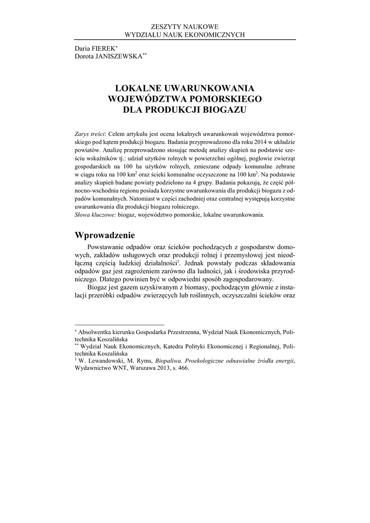 ZESZYTY NAUKOWE WYDZIAŁU NAUK EKONOMICZNYCH Daria FIEREK∗ Dorota JANISZEWSKA** LOKALNE UWARUNKOWANIA WOJEWÓDZTWA POMORSKIEGO DLA PRODUKCJI BIOGAZU Zarys treści: Celem artykułu jest ocena lokalnych uwarunkowań województwa pomorskiego pod kątem produkcji biogazu. Badania przyprowadzono dla roku 2014 w układzie powiatów. Analizę przeprowadzono stosując metodę analizy skupień na podstawie sześciu wskaźników tj.: udział użytków rolnych w powierzchni ogólnej, pogłowie zwierząt gospodarskich na 100 ha użytków rolnych, zmieszane odpady komunalne zebrane w ciągu roku na 100 km2 oraz ścieki komunalne oczyszczone na 100 km2. Na podstawie analizy skupień badane powiaty podzielono na 4 grupy. Badania pokazują, że część północno-wschodnia regionu posiada korzystne uwarunkowania dla produkcji biogazu z odpadów komunalnych. Natomiast w części zachodniej oraz centralnej występują korzystne uwarunkowania dla produkcji biogazu rolniczego. Słowa kluczowe: biogaz, województwo pomorskie, lokalne uwarunkowania. Wprowadzenie Powstawanie odpadów oraz ścieków pochodzących z gospodarstw domowych, zakładów usługowych oraz produkcji rolnej i przemysłowej jest nieodłączną częścią ludzkiej działalności1. Jednak powstały podczas składowania odpadów gaz jest zagrożeniem zarówno dla ludności, jak i środowiska przyrodniczego. Dlatego powinien być w odpowiedni sposób zagospodarowany. Biogaz jest gazem uzyskiwanym z biomasy, pochodzącym głównie z instalacji przeróbki odpadów zwierzęcych lub roślinnych, oczyszczalni ścieków oraz ∗ Absolwentka kierunku Gospodarka Przestrzenna, Wydział Nauk Ekonomicznych, Politechnika Koszalińska ** Wydział Nauk Ekonomicznych, Katedra Polityki Ekonomicznej i Regionalnej, Politechnika Koszalińska 1 W. Lewandowski, M. Ryms, Biopaliwa. Proekologiczne odnawialne źródła energii, Wydawnictwo WNT, Warszawa 2013, s. 466. 70 Daria Fierek, Dorota Janiszewska składowisk odpadów2. Powstaje w procesie biologicznego rozkładu masy organicznej przez bakterie metanowe w warunkach beztlenowych (fermentacja beztlenowa)3. Z przytoczonej definicji wynika, iż można wyróżnić trzy podstawowe źródła uzyskania biogazu tj.: osad czynny powstający w procesach oczyszczania ścieków, organiczne odpady przemysłowe, konsumpcyjne i organiczna frakcja odpadów komunalnych na wysypisku oraz obornik, plony i pozostałości z upraw rolnych4. Wymienione źródła biogazu można podzielić na dwie grupy – rolnicze i pozarolnicze. Do grupy źródeł rolniczych zalicza się surowce zwierzęce (odchody stałe i ciekłe) oraz roślinne (uprawy energetyczne, odpady roślinne). Natomiast go grupy źródeł pozarolniczych surowce komunalne (odpady organiczne, osad ściekowy) i przemysłowe (odpady spożywcze, kosmetyczne i papiernicze)5. Wykorzystanie powstałych w wyniku działalności człowieka odpadów do produkcji biogazu przynosi wiele korzyści, do których można zaliczyć m.in.: ograniczenie emisji metanu, podtlenku azotu, dwutlenku siarki i tlenków azotu, zmniejszenie efektu cieplarnianego, zmniejszenie zanieczyszczenia wód podziemnych i powierzchniowych, redukcję emisji odorów, zmniejszenie zagrożenia sanitarnego, częściowe rozwiązanie problemu odpadów oraz dostęp do alternatywnego źródła energii6. Poszukiwanie i wykorzystanie odnawialnych źródeł energii, w tym również z biogazu w województwie pomorskim jest ważne z punktu widzenia jego cech naturalnych – unikatowe środowisko i walory krajobrazowe (duża powierzchnia obszarów prawnie chronionych, lasów oraz duża liczba jezior i oczek wodnych). Ponadto badany region jest silnie uzależniony od zewnętrznych dostaw energii elektrycznej, posiada duże zaległości inwestycyjne w zakresie energetyki oraz cechuje się dwukrotnie niższą niż średnio w UE efektywnością energetyczną. W konsekwencji wypływa to na niski poziom bezpieczeństwa energetycznego i powoduje ograniczenia napływu nowych inwestycji do regionu7. Na możliwości poprawy sytuacji regionu w tym zakresie wskazuje jedna z przyjętych w województwie inteligentnych specjalizacji regionu tj. technologie ekoefektywne 2 Ustawa z dnia 20 lutego 2015 r. o odnawialnych źródłach energii, Dz. U., 2015 r. poz. 478, art. 2, poz. 1. 3 J. Kuś, Biopaliwa gazowe [w:] Odnawialne źródła energii. Rolnicze surowce energetyczne, pod red. B. Kołodziej i M. Matyki, PWRiL, Poznań 2012, s. 205. 4 W. Lewandowski, M. Ryms, op. cit. s. 471. 5 A. Głaszczka, W. J. Wardal, W. Romaniuk, T. Domasiewicz, Biogazownie rolnicze, MULTICO Oficyna Wydawnicza, Warszawa 2010, s. 8. 6 A. Oniszk-Popławska, M. Zowsik, G. Wiśniewski, Produkcja i wykorzystanie biogazu rolniczego, EC BREC/IBMER, Gdańsk-Warszawa 2003, s. 44-49. 7 Strategia rozwoju województwa pomorskiego 2020, Sejmik województwa pomorskiego, Gdańsk 2012, s. 11, 15. Lokalne uwarunkowania województwa… 71 w produkcji, przesyle, dystrybucji i zużyciu energii i paliw oraz w budownictwie, w której założono m.in. poprawę efektywności energetycznej oraz rozwój odnawialnych źródeł energii (OZE) również w układzie rozproszonym8. Cel i metody badań Celem badań jest ocena zróżnicowania uwarunkowań powiatów województwa pomorskiego pod kątem produkcji biogazu i ich podział na grupy o różnych cechach uwarunkowań. Dane na podstawie, których przeprowadzono analizę zróżnicowania uwarunkowań pochodzą z Banku Danych Lokalnych GUS. Analizę przeprowadzono dla roku 20149. Uwzględniając przesłanki merytoryczne, statystyczne, a także dostępność danych do analizy przyjęto następujące wskaźniki cząstkowe: • udział użytków rolnych w powierzchni ogólnej, • pogłowie zwierząt gospodarskich na 100 ha użytków rolnych, • zmieszane odpady komunalne zebrane w ciągu roku na 100 km2, • ścieki komunalne oczyszczone w ciągu roku na 100 km2. Przy czym wskaźnik udziału użytków rolnych w powierzchni ogólnej oraz pogłowie 