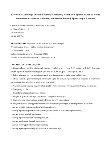 Kierownik Gminnego Ośrodka Pomocy Społecznej w Rakowie ogłasza nabór na wolne stanowisko urzędnicze w Gminnym Ośrodku Pomocy Społecznej w Rakowie Gminny Ośrodek Pomocy Społecznej w Rakowie ul. Sienieńskiego 19 26-035 Raków tel. 41 3535201 STANOWISKO: inspektor ds. świadczeń wychowawczych Wymiar czasu pracy – pełny wymiar czasu pracy Liczba etatów -1 etat Data ogłoszenia naboru – 3 marzec 2016r. Termin składania dokumentów – 14 marzec 2016r. I WYMAGANIA NIEZBĘDNE: 1) Obywatelstwo polskie lub innych państw, zgodnie z art. 11 ust. 2 i 3 ustawy z dnia 21 listopada 2008r. o pracownikach samorządowych (Dz. U. z 2014r., poz. 1202 z późn. zm.). 2) Pełna zdolność do czynności prawnych oraz korzystanie z pełni praw publicznych. 3) Brak skazania prawomocnym wyrokiem sądu za umyślne przestępstwo ścigane z oskarżenia publicznego lub umyślne przestępstwo skarbowe. 4) Wykształcenie wyższe magisterskie (preferowane kierunki: prawo, administracja, ekonomia). 5) Staż pracy – 2 lata. 6) Posiadanie nieposzlakowanej opinii. 7) Biegła znajomość obsługi komputera i urządzeń biurowych. 8) Stan zdrowia pozwalający na zatrudnienie na w/w stanowisku. 9) Znajomość oraz umiejętność stosowania przepisów prawnych w szczególności z zakresu: - ustawy kodeks postępowania administracyjnego, - ustawy o pomocy państwa w wychowywaniu dzieci w tym akty wykonawcze, - ustawy o samorządzie gminnym, - ustawy o pracownikach samorządowych, - ustawy o ochronie danych osobowych, - ustawy o dostępie informacji publicznej, - ustawy o postępowaniu egzekucyjnym w administracji. II WYMAGANIA DODATKOWE: 1) Wiedza z zakresu funkcjonowania samorządu terytorialnego. 2) Uprzejmość i życzliwość w kontaktach z klientami. 3) Umiejętność planowania i sprawnej organizacji pracy. 4) Umiejętność pracy indywidualnej oraz pracy w zespole. 5) Odpowiedzialność, sumienność, komunikatywność. 6) Odporność na stres. III ZAKRES WYKONYWANYCH ZADAŃ NA STANOWISKU: 1) Przyjmowanie wniosków o ustalenie prawa do świadczeń wychowawczych. 2) Weryfikacja złożonych wniosków oraz ustalanie prawa do świadczeń wychowawczych. 3) Wydawanie decyzji administracyjnych przyznających prawo do świadczeń wychowawczych. 4) Prowadzenie rejestru wniosków o ustalenie prawa do świadczeń wychowawczych. 5) Wydawanie decyzji administracyjnych odmawiających przyznania świadczeń wychowawczych. 6) Sporządzanie list wypłat świadczeń wychowawczych. 7) Prowadzenie postępowań w spawach nienależnie pobranych świadczeń wychowawczych. 8) Wydawanie decyzji o ustaleniu, zwrocie nienależnie pobranego świadczenia wychowawczego, prowadzenie egzekucji w trybie przepisów o postępowaniu egzekucyjnym w administracji. 9) Współpraca z marszałkiem województwa świętokrzyskiego w sprawach świadczeń wychowawczych. 10) Sporządzanie zapotrzebowania na środki finansowe. 11) Sporządzanie analiz i sprawozdań z realizacji ustawy o pomocy państwa w wychowywaniu dzieci. 12) Prowadzenie obsługi administracyjnej związanej między innymi ze sporządzeniem zaświadczeń, prowadzeniem korespondencji z innymi instytucjami. 13) Informowanie przełożonego o stanie prowadzonych spraw i zaistniałych problemach. 14) Wykonywanie innych czynności wchodzących w zakres zadań pracy. IV Informacja o warunkach pracy na stanowisku: 1) Praca biurowa w siedzibie GOPS-u w Rakowie, w pełnym wymiarze czasu pracy, jednozmianowa. 2) W przypadku osób podejmujących po raz pierwszy pracę na stanowisku urzędniczym umowę o pracę zawiera się na czas określony nie dłuższy niż 6 miesięcy. 3) Praca z monitorem ekranowym powyżej 4 godzin dziennie. 4) Użytkowanie sprzętu biurowego. V DODATKOWE INFORMACJE: W miesiącu poprzedzającym datę upublicznienia ogłoszenia o naborze wskaźnik zatrudnienia osób niepełnosprawnych w Gminnym Ośrodku Pomocy Społecznej w Rakowie w rozumieniu przepisów o rehabilitacji zawodowej i społecznej oraz zatrudnieniu osób niepełnosprawnych kształtuje się na poziomie poniżej 6%. VI WYMAGANE DOKUMENTY: 1) List motywacyjny. 2) CV. 3) Kopie dokumentów potwierdzających wykształcenie. 4) Kopie dokumentów potwierdzających kwalifikacje i staż pracy (świadectwa, zaświadczenia). 4) Wypełniony kwestionariusz osobowy dla osoby ubiegającej się o zatrudnienie (dostępny w kadrach GOPS-u). 5) Oświadczenie o pełnej zdolności do czynności prawnych oraz korzystania z pełni praw publicznych. 6) oświadczenie o nieskazaniu prawomocnym wyrokiem sądu za umyślne przestępstwo ścigane z oskarżenia publicznego lub umyślne przestępstwo skarbowe. 7) Oświadczenie o wyrażeniu zgody na przetwarzanie danych osobowych zawartych w ofercie pracy, dla potrzeb niezbędnych do realizacji procesu rekrutacji, zgodnie z ustawą z dnia 29 sierpnia 1997r. o ochronie danych osobowych (t.j. Dz. U. z 2015r., poz. 2135 z późń. zm.) oraz ustawą z dnia 21 listopada 2008r. o pracownikach samorządowych (t.j. Dz. U. z 2014r., poz. 1202 z późn. zm.). Wszystkie oświadczenia, list motywacyjny, CV oraz kwestionariusz osobowy powinny być własnoręcznie podpisane, pod rygorem nieuzyskania pozytywnej oceny formalnej. VII MIEJSCE I TERMIN SKŁADANIA DOKUMNETÓW: Wymagane dokumenty (z oznaczeniem nadawcy) należy: 1) składać w Gminnym Ośrodku Pomocy Społecznej w Rakowie ul. Sienieńskiego 19, 26-035 Raków do dnia 14 marca 2016r. do godz. 1530 w zamkniętej kopercie, lub 2) przesłać pocztą do 14 marca 2016r. (decyduje data wpływu do ośrodka) na adres: Gminny Ośrodek Pomocy Społecznej w Rakowie ul. Sienieńskiego 19, 26-035 Raków z dopiskiem „Dotyczy naboru na stanowisko inspektora ds. świadczeń wychowawczych”. Dodatkowe informacje pod nr tel. 41 3535201 w godzinach pracy ośrodka (730-1530). Oferty, które wpłyną po terminie nie będą rozpatrywane. VIII UWAGI 1) Kandydaci, których dokumenty nie spełniają wymagań formalnych, nie będą powiadamiani o dalszym toku naboru.