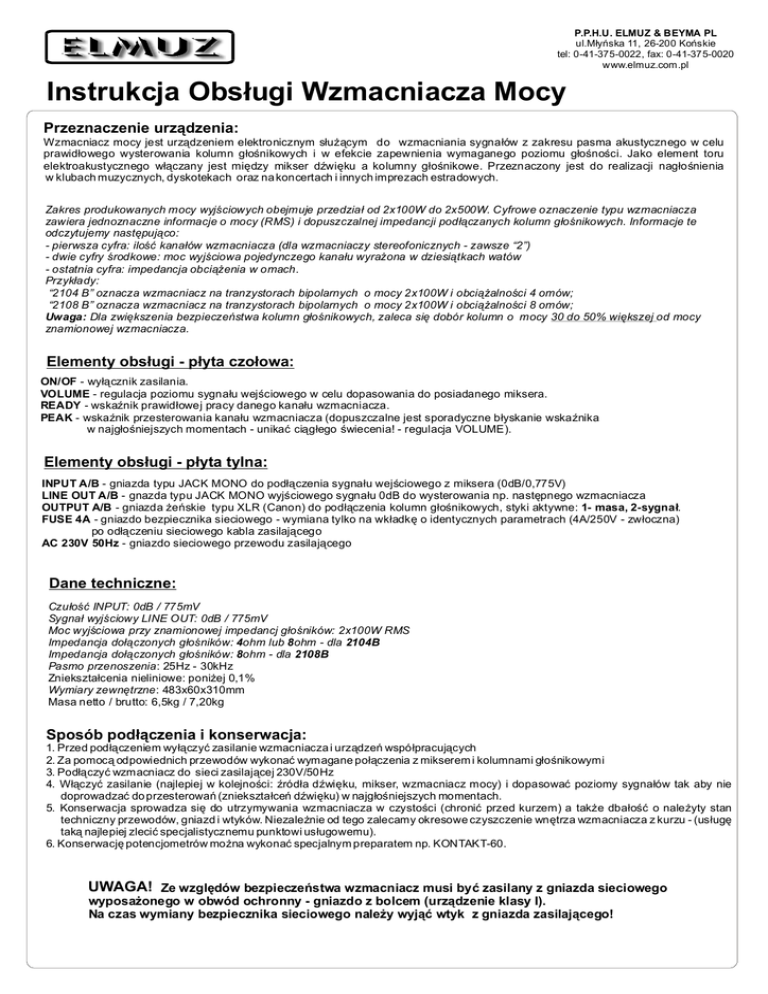 ELMUZ P.P.H.U. ELMUZ & BEYMA PL ul.Młyńska 11, 26-200 Końskie tel: 0-41-375-0022, fax: 0-41-375-0020 www.elmuz.com.pl Instrukcja Obsługi Wzmacniacza Mocy Przeznaczenie urządzenia: Wzmacniacz mocy jest urządzeniem elektronicznym służącym do wzmacniania sygnałów z zakresu pasma akustycznego w celu prawidłowego wysterowania kolumn głośnikowych i w efekcie zapewnienia wymaganego poziomu głośności. Jako element toru elektroakustycznego włączany jest między mikser dźwięku a kolumny głośnikowe. Przeznaczony jest do realizacji nagłośnienia w klubach muzycznych, dyskotekach oraz na koncertach i innych imprezach estradowych. Zakres produkowanych mocy wyjściowych obejmuje przedział od 2x100W do 2x500W. Cyfrowe oznaczenie typu wzmacniacza zawiera jednoznaczne informacje o mocy (RMS) i dopuszczalnej impedancji podłączanych kolumn głośnikowych. Informacje te odczytujemy następująco: - pierwsza cyfra: ilość kanałów wzmacniacza (dla wzmacniaczy stereofonicznych - zawsze “2”) - dwie cyfry środkowe: moc wyjściowa pojedynczego kanału wyrażona w dziesiątkach watów - ostatnia cyfra: impedancja obciążenia w omach. Przykłady: “2104 B” oznacza wzmacniacz na tranzystorach bipolarnych o mocy 2x100W i obciążalności 4 omów; “2108 B” oznacza wzmacniacz na tranzystorach bipolarnych o mocy 2x100W i obciążalności 8 omów; Uwaga: Dla zwiększenia bezpieczeństwa kolumn głośnikowych, zaleca się dobór kolumn o mocy 30 do 50% większej od mocy znamionowej wzmacniacza. Elementy obsługi - płyta czołowa: ON/OF - wyłącznik zasilania. VOLUME - regulacja poziomu sygnału wejściowego w celu dopasowania do posiadanego miksera. READY - wskaźnik prawidłowej pracy danego kanału wzmacniacza. PEAK - wskaźnik przesterowania kanału wzmacniacza (dopuszczalne jest sporadyczne błyskanie wskaźnika w najgłośniejszych momentach - unikać ciągłego świecenia! - regulacja VOLUME). Elementy obsługi - płyta tylna: INPUT A/B - gniazda typu JACK MONO do podłączenia sygnału wejściowego z miksera (0dB/0,775V) LINE OUT A/B - gnazda typu JACK MONO wyjściowego sygnału 0dB do wysterowania np. następnego wzmacniacza OUTPUT A/B - gniazda żeńskie typu XLR (Canon) do podłączenia kolumn głośnikowych, styki aktywne: 1- masa, 2-sygnał. FUSE 4A - gniazdo bezpiecznika sieciowego - wymiana tylko na wkładkę o identycznych parametrach (4A/250V - zwłoczna) po odłączeniu sieciowego kabla zasilającego AC 230V 50Hz - gniazdo sieciowego przewodu zasilającego Dane techniczne: Czułość INPUT: 0dB / 775mV Sygnał wyjściowy LINE OUT: 0dB / 775mV Moc wyjściowa przy znamionowej impedancj głośników: 2x100W RMS Impedancja dołączonych głośników: 4ohm lub 8 ohm - dla 2104B Impedancja dołączonych głośników: 8ohm - dla 2108B Pasmo przenoszenia : 25Hz - 30kHz Zniekształcenia nieliniowe: poniżej 0,1% Wymiary zewnętrzne : 483x60x310mm Masa netto / brutto: 6,5kg / 7,20kg Sposób podłączenia i konserwacja: 1. Przed podłączeniem wyłączyć zasilanie wzmacniacza i urządzeń współpracujących 2. Za pomocą odpowiednich przewodów wykonać wymagane połączenia z mikserem i kolumnami głośnikowymi 3. Podłączyć wzmacniacz do sieci zasilającej 230V/50Hz 4. Włączyć zasilanie (najlepiej w kolejności: źródła dźwięku, mikser, wzmacniacz mocy) i dopasować poziomy sygnałów tak aby nie doprowadzać do przesterowań (zniekształceń dźwięku) w najgłośniejszych momentach. 5. Konserwacja sprowadza się do utrzymywania wzmacniacza w czystości (chronić przed kurzem) a także dbałość o należyty stan techniczny przewodów, gniazd i wtyków. Niezależnie od tego zalecamy okresowe czyszczenie wnętrza wzmacniacza z kurzu - (usługę taką najlepiej zlecić specjalistycznemu punktowi usługowemu). 6. Konserwację potencjometrów można wykonać specjalnym preparatem np. KONTAKT-60. UWAGA! Ze względów bezpieczeństwa wzmacniacz musi być zasilany z gniazda sieciowego wyposażonego w obwód ochronny - gniazdo z bolcem (urządzenie klasy I). Na czas wymiany bezpiecznika sieciowego należy wyjąć wtyk z gniazda zasilającego!