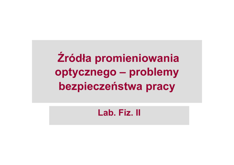 Źródła promieniowania optycznego – problemy bezpieczeństwa pracy Lab. Fiz. II Reakcje w tkankach wywołane przez promioniowanie optyczne (podczerwień, widzialne, ultrafiolet): • Reakcje termiczne – ze wzrostem temperatury • Reakcje fotochemiczne Reakcje promieniowania optycznego w tkankach: • Powierzchniowe (skóra), milimetry w głąb • Oko – centymetry w głąb Źródła promieniowania optycznego: • spójnego – lasery • Niespójnego – świeczka, żarówka, lampy spektralne, diody elektroluminescencyjne Fizjopatologiczne oddziaływanie promieniowania optycznego Zakres widmowy Nadfiolet C (200-280 nm) Nadfiolet B (280-315 nm) Nadfiolet A (315-400 nm) Oko Skóra Popromien ne zapalenie spojówki i rogówki zaćma Rumień (oparzenia słoneczne) rak skóry, wzrost pigmentacji Czernienie melaniny Reakcje fotoalergiczne Oparzenia skóry Światło widzialne (400-780 nm) Fotochemiczne i termiczne uszkodzenie siatkówki Oparzenia skóry, reakcje fotoalergiczne Podczerwień A (780-1400 nm) Podczerwień B (1.4-3.0 µm) Zaćma, oparzenia siatkówki Oparzenia skóry Oparzenie rogówki, zmętnienie płynu komory przedniej, zaćma Oparzenia skóry Podczerwień Oparzenie rogówki C (3.0-1000 µm) Oparzenia skóry Bieg promieni świetlnych w prawidłowo funkcjonującym oku www.zdrowie.med.pl/oczy/anat_i_fizjo/a_oczy.html Budowa oka www.zdrowie.med.pl/oczy/anat_i_fizjo/a_oczy.html Pasma wysokiej transmisji promieniowania optycznego w tkankach ocznych Transmisja Tkanka Pasmo wysokiej transmisji Rogówka 400 - 1300 nm ponad 80 % 300 – 1100 nm (80-90) % Ciecz wodnista Soczewka 450 – 1000 nm ~90 % 350 – 900 nm ponad 80 % Ciało szkliste Przyjęta w medycynie dopuszczalna dawka promieniowania optycznego wynosi: J mJ 2.91 2 ≅ 30 2 cm mm Dodatkowo wprowadza się współczynniki związane z długością fali. Absorpcja, emisja spontaniczna i wymuszona Absorpcja - przejście elektronu z niższego stanu energetycznego atomu do wyższego z pochłonięciem fotonu. Atom wzbudzony do stanu energii E2 pozostaje w tym stanie przez pewien czas. E2 hν0 E1 Emisja spontaniczna - samorzutne przejście elektronu ze stanu wyższego do stanu niższego połączone z emisją fotonu Emisja wymuszona - przejście elektronu ze stanu wyższego do stanu niższego połączone z emisją fotonu pod wpływem padającego promieniowania. Wyemitowane zostaje promieniowanie o tych samych właściwościach, które ma promieniowanie wymuszające. hν0 E2 E1 Emisja spontaniczna E2 hν0 2hν0 E1 Emisja wymuszona Oddziaływanie promieniowania laserowego z tkankami Zakres gęstości energii: 1 mJ/cm2 – 1MJ/cm2 Sposób oddziaływania determinują takie czynniki jak pochłanianie wody i hemoglobiny oraz gęstość mocy. • • • • Koagulacja Zwęglanie Parowanie Fragmentaryzacja i rozrywanie LASER (Light Amplification by Stimulated Emission of Radiation Laser jest generatorem promieniowania elektromagnetycznego charakteryzującego się monochromatycznością i kierunkowością, dużą gęstością mocy spektralnej oraz wysokim stopniem spójności czasowej i przestrzennej. Pierwszy laser skonstruowany został przez Maimana w 1960 r. Materiałem aktywnym był rubin (Al2O3) domieszkowany chromem (Cr3+), umieszczony między dwoma zwierciadłami stanowiącymi rezonator optyczny. LASERY • Lasery gazowe - atomowe, jonowe, molekularne • Lasery na ciele stałym np. półprzewodnikowe • Lasery barwnikowe • Lasery chemiczne • Lasery na centrach barwnych • Lasery na swobodnych elektronach Podstawowe elementy lasera • Ośrodek aktywny, mający zdolność wzmocnienia fali świetlnej (zbiór atomów, cząsteczek, ciało stałe). • Układ pompujący, który ośrodek aktywny wzbudza do wyższego stanu energetycznego. Zadaniem tego układu jest doprowadzenie ośrodka aktywnego do stanu inwersji obsadzeń - liczba atomów N2 w wyższym stanie energetycznym jest większa od liczby atomów N1 w niższym stanie energetycznym. • Rezonator optyczny Inwersja obsadzeń: N2 > N1 z warunkiem energii poziomów N2 > N1 Pompowanie ośrodka aktywnego Wiązka wyjściowa Ośrodek aktywny zwierciadło Zwierciadło transmisyjne Rezonator optyczny Funkcje rezonatora optycznego: • Wprowadzenie dodatniego sprzężenia zwrotnego do układu wzmacniającego. Sprzężenie zwrotne polega na częściowym odbiciu wiązki promieniowania od zwierciadeł rezonatora z powrotem do ośrodka wzmacniającego. • Wzbudzanie pola elektromagnetycznego tylko o takich częstotliwościach ν dla których spełniony jest warunek: v λ ν =n 2L = n 2L 2 • Uzyskanie kierunkowości promieniowania. L - długość rezonatora, n - liczba całkowita, λ - długość fali w rezonatorze, v - prędkość fali w rezonatorze Własności promieniowania laserowego • Kierunkowość • Monochromatyczność - niemożliwe jest uzyskanie jednej ściśle określonej długości fali i częstotliwości, laser emituje promieniowanie w wąskim pasmie ∆ν • Koherencja (spójność) czasowa - związana jest ze stopniem monochromatyczności, różnice w paśmie ∆ν powodują, że po pewnym czasie punkty w przekroju wiązki przestaną być ze sobą w fazie • Koherencja (spójność) przestrzenna - płaszczyzny w przekroju wiązki powinny być stałe w fazie, w dużych odległościach pojawiają się różnice fazy Wiązki gaussowskie Rezonator optyczny pozwala otrzymać wiązki świetlne o małej rozbieżności. Teoria wiązki gaussowskiej podaje dokładny opis wiązki generowanej przez laser. Równanie Helmholtza, wynikające z równań Maxwella opisuje rozkład pola E(x,y,z). ∆E + k 2 E = 0 Rozwiązanie tego równania można przyjąć w formie: E(x,y,z) = u(x, y, z)exp(-ikz) Dla przypadku propagacji fali w kierunku z wolnozmienną amplitudą u otrzymuje się równanie różniczkowe k – wektor ∂u ∂u ∂u + 2 − 2ik =o falowy 2 ∂x ∂y ∂z Rozwiązując to równanie otrzymuje się wyrażenie na pole E wiązki świetlnej. Jest to opis wiązki gaussows