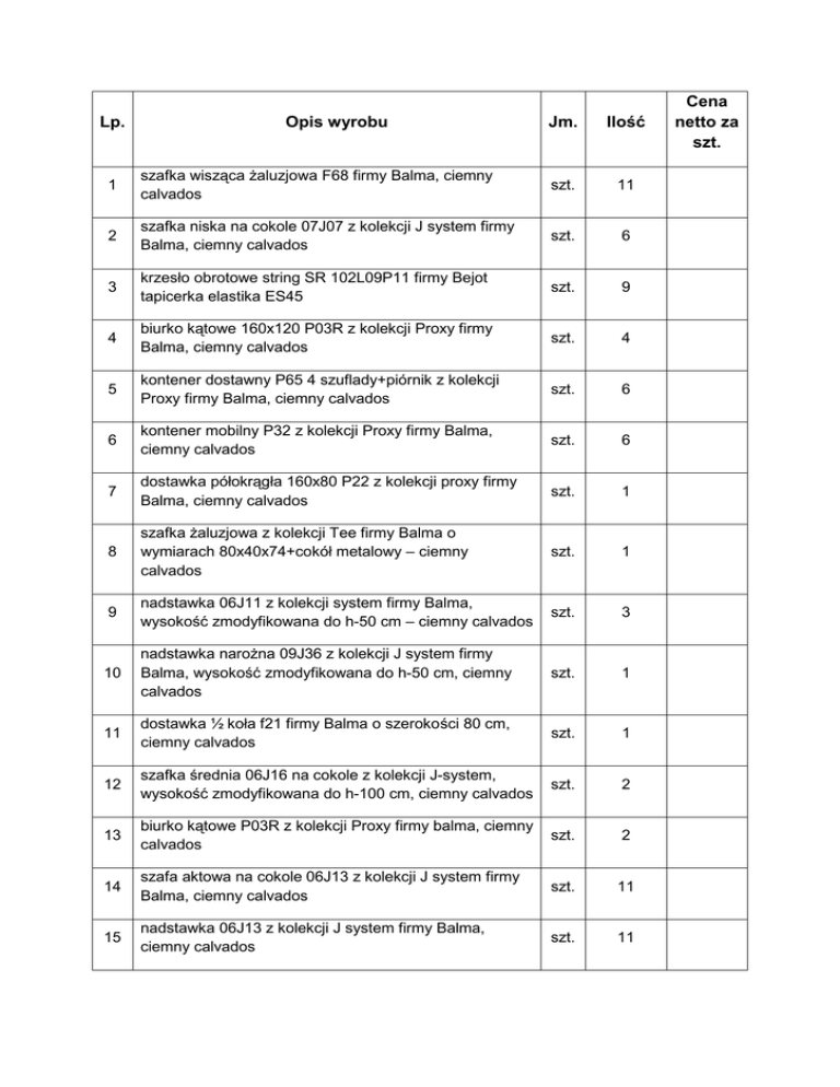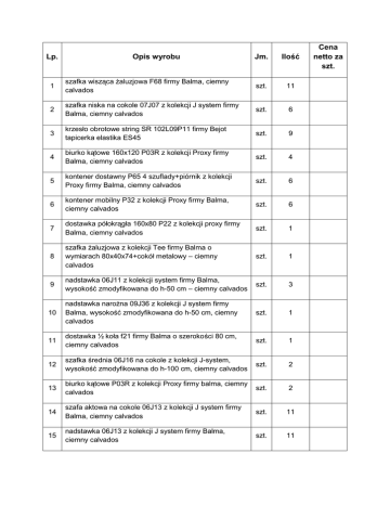 Lp. Opis wyrobu Jm. Ilość 1 szafka wisząca Ŝaluzjowa F68 firmy Balma, ciemny calvados szt. 11 2 szafka niska na cokole 07J07 z kolekcji J system firmy Balma, ciemny calvados szt. 6 3 krzesło obrotowe string SR 102L09P11 firmy Bejot tapicerka elastika ES45 szt. 9 4 biurko kątowe 160x120 P03R z kolekcji Proxy firmy Balma, ciemny calvados szt. 4 5 kontener dostawny P65 4 szuflady+piórnik z kolekcji Proxy firmy Balma, ciemny calvados szt. 6 6 kontener mobilny P32 z kolekcji Proxy firmy Balma, ciemny calvados szt. 6 7 dostawka półokrągła 160x80 P22 z kolekcji proxy firmy Balma, ciemny calvados szt. 1 8 szafka Ŝaluzjowa z kolekcji Tee firmy Balma o wymiarach 80x40x74+cokół metalowy – ciemny calvados szt. 1 9 nadstawka 06J11 z kolekcji system firmy Balma, wysokość zmodyfikowana do h-50 cm – ciemny calvados szt. 3 10 nadstawka naroŜna 09J36 z kolekcji J system firmy Balma, wysokość zmodyfikowana do h-50 cm, ciemny calvados szt. 1 11 dostawka ½ koła f21 firmy Balma o szerokości 80 cm, ciemny calvados szt. 1 12 szafka średnia 06J16 na cokole z kolekcji J-system, wysokość zmodyfikowana do h-100 cm, ciemny calvados szt. 2 13 biurko kątowe P03R z kolekcji Proxy firmy balma, ciemny calvados szt. 2 14 szafa aktowa na cokole 06J13 z kolekcji J system firmy Balma, ciemny calvados szt. 11 15 nadstawka 06J13 z kolekcji J system firmy Balma, ciemny calvados szt. 11 Cena netto za szt. 16 szafa aktowo-ubraniowa na cokole 09J44 z kolekcji system firmy Balma, ciemny calvados szt. 2 17 nadstawka otwarta 09J11 z kolekcji J system Balma, ciemny mahoń szt. 2 18 krzesło dostawne ZIP ZP22H firmy Bejot, tapicerka elestika ES45 szt. 9 19 panel frontowy z blatem 160x30x115 mocowany do frontu biurek, ciemny calvados szt. 1 20 piórnik do kontenera P65 firmy Balma szt. 1 21 szafa aktowo-ubraniowa na cokole 09J44 z kolekcji system firmy Balma, buk szt. 1 22 nadstawka 06J11 z kolekcji J system firmy Balma, buk szt. 1 23 szafka wisząca Ŝaluzjowa F68 firmy Balma, buk szt. 1 24 kontener mobilny P32 z kolekcji Proxy firmy Balma wraz z dodatkowymi kółkami do P32, buk szt. 1 25 szafa aktowa na cokole 06J13 z kolekcji J system Balma, buk szt. 1 26 nadstawka 06J13 z kolekcji J system firmy Balma, buk szt. 1 27 krzesło muza alu szt. 1 28 nadstawka na szafę WNGSW085NM z kolekcji Primo space BN Solution o wys. 65 cm, kolor NG szt. 3 29 nadstawka na szafę WNGSW085NM z kolekcji Primo Space BN Solutions o wys. 65 cm, szer. 55 cm, kolor NG szt. 1 30 szafka średnia WNGSW083NM z kolekcji Primo Space BN Office Solution, kolor NG szt. 1 31 szafa aktowa na cokole 06J44 z kolekcji J system firmy Balma szt. 1 wykonanie przepustów kablowych w istniejących biurkach szt. 4