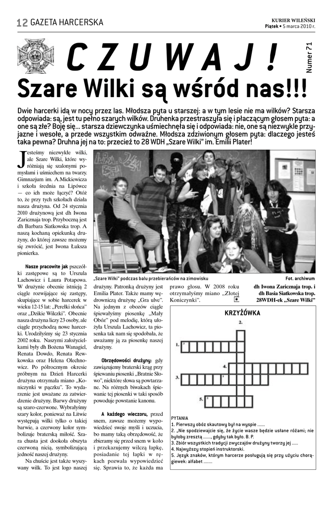 12 GAZETA HARCERSKA KURIER WILEŃSKI CZUWAJ! Numer 71 Piàtek • 5 marca 2010 r. Szare Wilki są wśród nas!!! Dwie harcerki idą w nocy przez las. Młodsza pyta u starszej: a w tym lesie nie ma wilków? Starsza odpowiada: są, jest tu pełno szarych wilków. Druhenka przestraszyła się i płaczącym głosem pyta: a one są złe? Boję się... starsza dziewczynka uśmiechnęła się i odpowiada: nie, one są niezwykle przyjazne i wesołe, a przede wszystkim odważne. Młodsza zdziwionym głosem pyta: dlaczego jesteś taka pewna? Druhna jej na to: przecież to 28 WDH „Szare Wilki” im. Emilii Plater! J esteśmy niezwykłe wilki, ale Szare Wilki, które wyróżniają się szalonymi pomysłami i uśmiechem na twarzy. Gimnazjum im. A.Mickiewicza i szkoła średnia na Lipówce — co ich może łączyć? Otóż to, że przy tych szkołach działa nasza drużyna. Od 24 stycznia 2010 drużynową jest dh Iwona Zaricznaja trop. Przyboczną jest dh Barbara Siatkowska trop. A naszą kochaną opiekunką drużyny, do której zawsze możemy się zwrócić, jest Iwona Łuksza pionierka. Nasze pracowite jak pszczółki zastępowe są to Urszula Lachowicz i Laura Potapowa. W drużynie obecnie istnieją 2 ciągle rozwijające się zastępy, skupiające w sobie harcerek w wieku 12-15 lat: „Perełki słońca” oraz „Dzikie Wilczki”. Obecnie nasza drużyna liczy 23 osoby, ale ciągle przychodzą nowe harcerki. Urodziłyśmy się 23 stycznia 2002 roku. Naszymi założycielkami były dh Bożena Wanagiel, Renata Dowdo, Renata Rewkowska oraz Helena Olechnowicz. Po półrocznym okresie próbnym na Dzień Harcerki drużyna otrzymała miano „Koniczynki w pączku”. To wydarzenie jest uważane za zatwierdzenie drużyny. Barwy drużyny są szaro-czerwone. Wybrałyśmy szary kolor, ponieważ na Litwie występują wilki tylko o takiej barwie, a czerwony kolor symbolizuje braterską miłość. Szara chusta jest dookoła obszyta czerwoną nicią, symbolizującą jedność naszej drużyny. Na chuście jest także wyszywany wilk. To jest logo naszej Fot. archiwum „Szare Wilki” podczas balu przebierańców na zimowisku drużyny. Patronką drużyny jest Emilia Plater. Także mamy wędrowniczą drużynę „Gra ulve”. Na jednym z obozów ciągle śpiewałyśmy piosenkę „Mały Obóz” pod melodię, którą ułożyła Urszula Lachowicz, ta piosenka tak nam się spodobała, że uważamy ją za piosenkę naszej drużyny. prawo głosu. W 2008 roku otrzymałyśmy miano „Złotej Koniczynki”. dh Iwona Zaricznaja trop. i dh Basia Siatkowska trop. 28WDH-ek „Szare Wilki” KRZYŻÓWKA Obrzędowości drużyny: gdy zawiązujemy braterski krąg przy śpiewaniu piosenki „Bratnie Słowo”, niektóre słowa są powtarzane. Na różnych biwakach śpiewanie tej piosenki w taki sposób powoduje powstanie kanonu. A każdego wieczoru, przed snem, zawsze możemy wypowiedzieć swoje myśli i uczucia, bo mamy taką obrzędowość, że zbieramy się przed snem w koło i przekazujemy wilczą łapkę, posiadanie tej łapki w rękach pozwala wypowiedzieć się. Sprawia to, że każda ma PYTANIA 1. Pierwszy obóz skautowy był na wyspie ...... 2. „Nie spodziewajcie się, że życie wasze będzie usłane różami; nie byłoby zresztą ......, gdyby tak było. B. P. 3. Zbiór wszystkich tradycji zwyczajów drużyny tworzy jej ..... 4. Najwyższy stopień instruktorski. 5. Język znaków, którym harcerze posługują się przy użyciu chorągiewek: alfabet ....... GAZETA HARCERSKA 13 KURIER WILEŃSKI Piàtek • 5 marca 2010 r. Dzień Myśli Braterskiej — święto, które łączy wielkich i małych Każdy człowiek, każda organizacja ma swoje święta. Wyjątkiem nie jest też Związek Harcerstwa Polskiego na Litwie czy też ogólnie skauting na świecie. Otóż zgodzą się chyba wszyscy, że świętem, które łączy wielkich i małych jest Dzień Myśli Braterskiej, używa się także skrótu: DMB. Tegoroczny DMB ZHPnL uczcił biwakiem poświęconym tej właśnie okazji, który odbył się w dniach 26-28 lutego w gimnazjum im. K. Parczewskiego w Niemenczynie. Wyjazd ten połączył 180 harcerzy i harcerek z Wilna oraz Wileńszczyzny, zorganizowany przez przeszłorocznych zwycięzców 26WDH „Białe Wilki”. Każdy wyjazd jest wyjątkowy, ale biwak z okazji DMB jest potrójnie wyjątkowy, bo, po pierwsze, egzystują już tradycje tego biwaku, jak to na przykład, że patrole przyjeżdżają z nową obrzędowością, proporcami, laskami skautowymi, przeznaczonymi na ta wyjątkową okazję. Po drugie, zrzesza on każdego roku coraz to więcej osób, drużyn. No i nie możemy zapomnieć o tym, że na przeciągu całego biwaku patrole są oceniane pod wieloma aspektami, które ogarniają nie tylko postawę harcerską, dyscyplinę, aktywność, wykonanie pracy domowej, ale także patrole konkurują podczas gry terenowej, czy też innych zawodów. Tegoroczny DMB wyróżniał się tym, że głęboko sięgnęliśmy w przeszłość, a mianowicie każdy patrol zagłębiał się w historię Wileńskiej Chorągwi Harcerzy opisanej w książce Antoniego Wasilewskiego. Podział zdobytą informacją nastąpił poprzez prezentacje i plakaty zrobione przez patrole o wybranym bohaterze książki. I chłopcy i dziewczyny miały wspaniałą okazję wykazać się podczas gry terenowej w okolicach Niemenczyna. Tam na nas czekali przemoczeni punktowi z pozytywnym nastrojem oraz, owszem, z zadaniami. Trzeba dlatego z niezmierną radością przyszliśmy na obiad do stołówki, gdzie gospodynie zadziwiały nas posiłkami. Po obiedzie ścieżki druhów i druhenek się rozdzieliły. Druhowie poszli na ciąg dalszy gry terenowej, dziewczyny natomiast zostały już w szkole, aby susząc ubrania i buty konkurować nawzajem już w ciepłym pomieszczeniu szkolnym, za udzielenie którego Zawody były w miłej atmosferze, pogrążone w śmiech i pogodność. Zdziwiliśmy się, jak szybko przeleciał dzień i już był sam czas na apel oraz pierwszy 