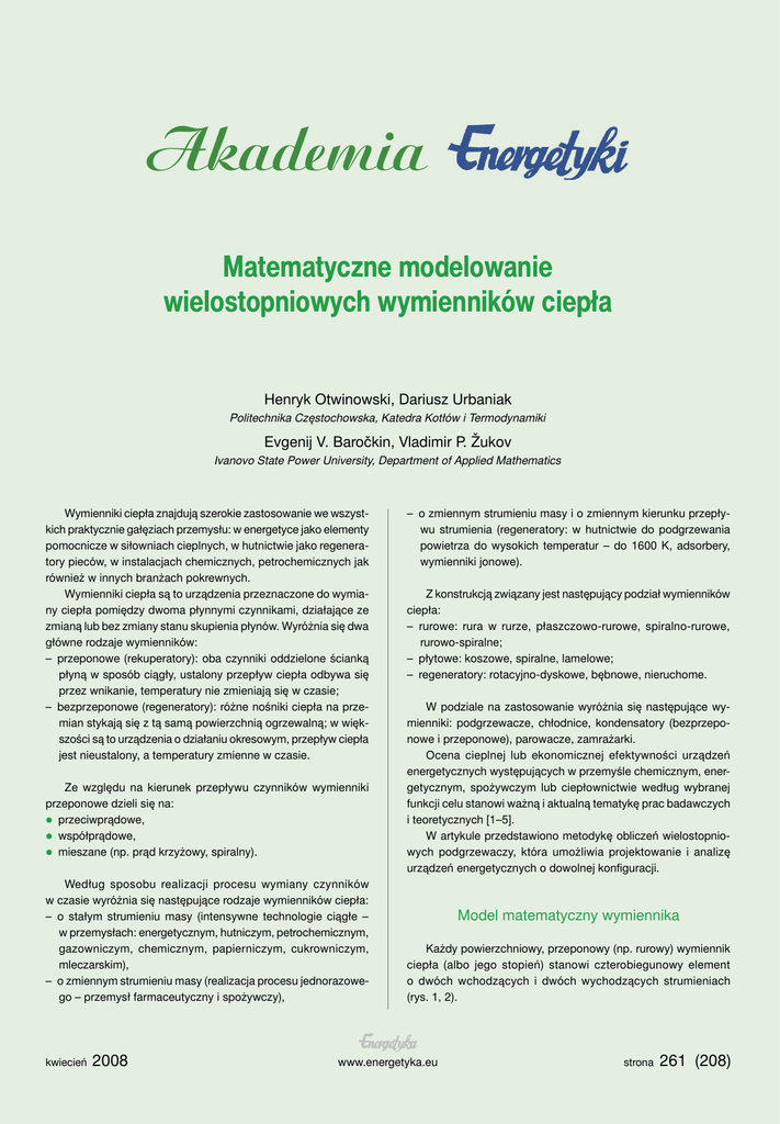 Matematyczne modelowanie wielostopniowych wymienników ciepła