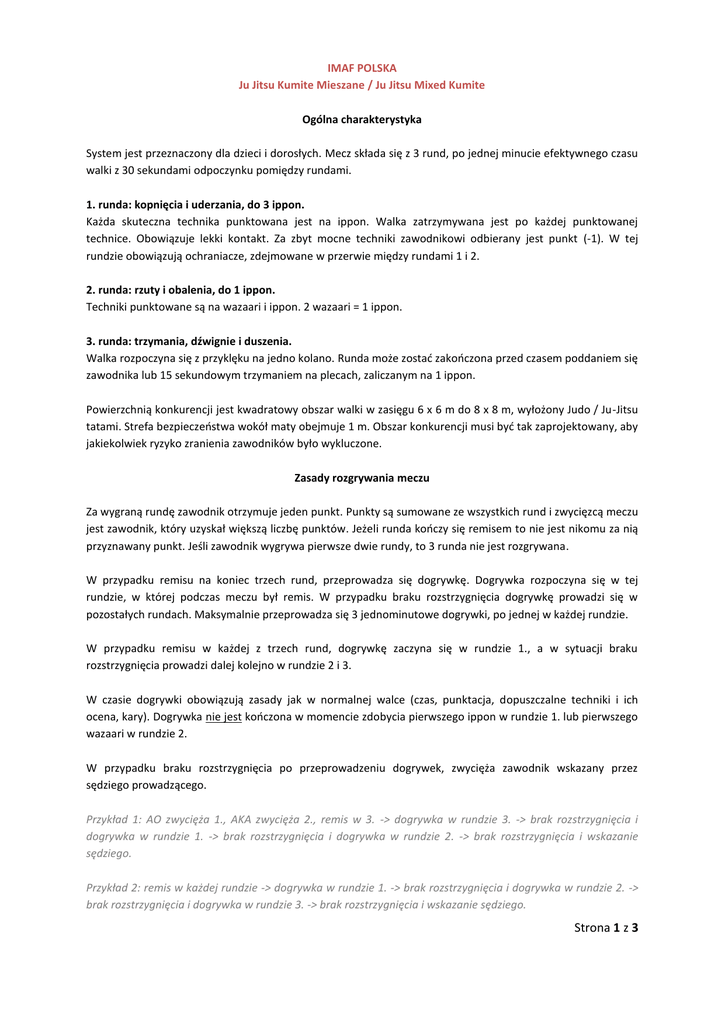 IMAF POLSKA Ju Jitsu Kumite Mieszane / Ju Jitsu Mixed Kumite Ogólna charakterystyka System jest przeznaczony dla dzieci i dorosłych. Mecz składa się z 3 rund, po jednej minucie efektywnego czasu walki z 30 sekundami odpoczynku pomiędzy rundami. 1. runda: kopnięcia i uderzania, do 3 ippon. Każda skuteczna technika punktowana jest na ippon. Walka zatrzymywana jest po każdej punktowanej technice. Obowiązuje lekki kontakt. Za zbyt mocne techniki zawodnikowi odbierany jest punkt (-1). W tej rundzie obowiązują ochraniacze, zdejmowane w przerwie między rundami 1 i 2. 2. runda: rzuty i obalenia, do 1 ippon. Techniki punktowane są na wazaari i ippon. 2 wazaari = 1 ippon. 3. runda: trzymania, dźwignie i duszenia. Walka rozpoczyna się z przyklęku na jedno kolano. Runda może zostać zakończona przed czasem poddaniem się zawodnika lub 15 sekundowym trzymaniem na plecach, zaliczanym na 1 ippon. Powierzchnią konkurencji jest kwadratowy obszar walki w zasięgu 6 x 6 m do 8 x 8 m, wyłożony Judo / Ju-Jitsu tatami. Strefa bezpieczeństwa wokół maty obejmuje 1 m. Obszar konkurencji musi być tak zaprojektowany, aby jakiekolwiek ryzyko zranienia zawodników było wykluczone. Zasady rozgrywania meczu Za wygraną rundę zawodnik otrzymuje jeden punkt. Punkty są sumowane ze wszystkich rund i zwycięzcą meczu jest zawodnik, który uzyskał większą liczbę punktów. Jeżeli runda kończy się remisem to nie jest nikomu za nią przyznawany punkt. Jeśli zawodnik wygrywa pierwsze dwie rundy, to 3 runda nie jest rozgrywana. W przypadku remisu na koniec trzech rund, przeprowadza się dogrywkę. Dogrywka rozpoczyna się w tej rundzie, w której podczas meczu był remis. W przypadku braku rozstrzygnięcia dogrywkę prowadzi się w pozostałych rundach. Maksymalnie przeprowadza się 3 jednominutowe dogrywki, po jednej w każdej rundzie. W przypadku remisu w każdej z trzech rund, dogrywkę zaczyna się w rundzie 1., a w sytuacji braku rozstrzygnięcia prowadzi dalej kolejno w rundzie 2 i 3. W czasie dogrywki obowiązują zasady jak w normalnej walce (czas, punktacja, dopuszczalne techniki i ich ocena, kary). Dogrywka nie jest kończona w momencie zdobycia pierwszego ippon w rundzie 1. lub pierwszego wazaari w rundzie 2. W przypadku braku rozstrzygnięcia po przeprowadzeniu dogrywek, zwycięża zawodnik wskazany przez sędziego prowadzącego. Przykład 1: AO zwycięża 1., AKA zwycięża 2., remis w 3. -> dogrywka w rundzie 3. -> brak rozstrzygnięcia i dogrywka w rundzie 1. -> brak rozstrzygnięcia i dogrywka w rundzie 2. -> brak rozstrzygnięcia i wskazanie sędziego. Przykład 2: remis w każdej rundzie -> dogrywka w rundzie 1. -> brak rozstrzygnięcia i dogrywka w rundzie 2. -> brak rozstrzygnięcia i dogrywka w rundzie 3. -> brak rozstrzygnięcia i wskazanie sędziego. Strona 1 z 3 Ocena 1. runda: kopnięcia i uderzenia zadawane z kontrolą, z lekkim kontaktem. Aby uzyskać 1 ippon każda technika na głowę musi tylko lekko dotknąć a na tułów musi być to czyste trafienie bez bloku ze strony drugiego zawodnika. W przypadku chaotycznych i/lub niekontrolowanych technik walka powinna być przerwana a zawodnicy ukarani. 2. runda: 1 ippon przyznaje się, jeżeli zawodnik w wyniku rzutu zostanie doprowadzony do kontaktu z podłożem pośladkami lub plecami. 1 wazaari przyznaje się, jeżeli zawodnik w wyniku obalenia zostanie doprowadzony do kontaktu z podłożem pośladkami lub plecami. 1 ippon lub 2 wazaari kończą rundę. 3. runda: 1 ippon przyznaje się, jeżeli zawodnik przytrzyma rękoma przeciwnika na plecach, bez względu na technikę trzymania, przez 15 sekund (osaekomi jest głośno sygnalizowane i odliczane przez sędziego prowadzącego). Rundę kończy również poddanie (dźwignia, duszenie). Techniki dozwolone i zabronione 1. runda: dopuszczalne są kontrolowane i wykonywane na lekki kontakt uderzenia pięścią (w tym uraken uchi) i kopnięcia, na strefy chudan i jodan. Zabronione są: ataki na strefę gedan, kopnięcia proste na twarz, zagarnięcia stopą w celu przewrócenia lub wytrącenia przeciwnika z równowagi (ashi barai). 2. runda: dopuszczalne są techniki rzutów i obaleń. Zabronione jest rzucanie przeciwnika poza obszar tatami. 3. runda: dopuszczalne są dowolne techniki trzymań na plecach, duszenia kołnierzem, duszenie trójkątne nogami (sankaku jime) oraz dźwignie: proste na staw skokowy i kolanowy, na łokieć (juji gatame) oraz bark i łokieć (ude garami). Zabronione jest duszeniem łokciem, przedramieniem, palcami, oraz dźwignie: skrętne na staw skokowy i kolanowy, na kręgosłup, na stawy palców i nadgarstkowy. Kategorie wagowe senior (18+) seniorki (18+) juniorzy (16-18) juniorki (16-18) – 75 kg, - 85 kg, + 85 kg – 60 kg, - 70 kg, + 70 kg – 60 kg, - 70 kg, + 70 kg – 55 kg, -65kg, + 65 kg Klasyfikacja kategorii opiera się na wieku, płci i masie ciała uczestników. Może ulegać modyfikacjom według uznania organizatora, biorąc pod uwagę wagę najlżejszego i najcięższego uczestnika. W przypadku zmian niedopuszczalne są zbyt duże różnice wagowe między zawodnikami jednej kategorii, wpływające na ich szanse w bezpośredniej walce. Odzież / sprzęt - Uczestnicy noszą tradycyjne judogi i są boso. - Wyposażenie obowiązkowe: ochraniacze stopy i golenia, napięstniki karate, szczęka - Wyposażenie obowiązkowe w kategorii junior: jw. + kask. - Wyposażenie dodatkowe wg uznania: suspensoria, hogo (ochraniacz tułowia), ochraniacz na piersi dla kobiet, kask w kategorii senior . - Uczestnicy z długimi włosami muszą związać je odpowiednio. - Czas na przygotowanie/uporządkowanie - jedna minuta. Strona 2 z 3 - Twarde soczewki kontaktowe i szkła nie są dozwolone. - Bandaże itp. przyjmowane są wyłącznie po decyzji lekarza zawodów, który powiadomi z wyprzedzeniem sekretariat sędziowski lub sędziego. Sędziowie Tatami: - 1 Sędzia prowadzący - 1 Sędzia pomocniczy („lustro”) Stolik sędziowski: - Sędzia czasowy - S