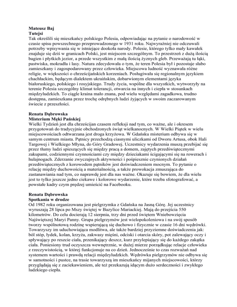 Mateusz Baj Tutejsi Tak określili się mieszkańcy polskiego Polesia, odpowiadając na pytanie o narodowość w czasie spisu powszechnego przeprowadzonego w 1931 roku. Najwyraźniej nie odczuwali potrzeby wpisywania się w istniejące dookoła narody. Polesie, którego tylko mały kawałek znajduje się dziś w granicach Polski, jest miejscem szczególnym. To przestrzeń z dużą ilością bagien i płytkich jezior, a przede wszystkim z małą ilością żyznych gleb. Przeważają tu łąki, pastwiska, mokradła i lasy. Natura zdecydowała o tym, że teren Polesia był i pozostaje słabo zamieszkany i zagospodarowany przez człowieka. Miejscowa ludność wyznawała różne religie, w większości o chrześcijańskich korzeniach. Posługiwała się regionalnym językiem chachłackim, będącym dialektem ukraińskim, dobarwionym elementami języka białoruskiego, polskiego i rosyjskiego. Trudy życia, wspólne dla wszystkich, wytworzyły na terenie Polesia szczególny klimat tolerancji, otwarcia na innych i ciepła w stosunkach międzyludzkich. To ciągle kraina mało znana, pod wielu względami zagadkowa, trudno dostępna, zamieszkana przez trochę odrębnych ludzi żyjących w swoim zaczarowanym świecie z przeszłości. Renata Dąbrowska Misterium Męki Pańskiej Wielki Tydzień jest dla chrześcijan czasem refleksji nad tym, co ważne, ale i okresem przygotowań do tradycyjnie obchodzonych świąt wielkanocnych. W Wielki Piątek w wielu miejscowościach odtwarzana jest droga krzyżowa. W Gdańsku misterium odbywa się w samym centrum miasta. Pątnicy przechodzą ciasnymi uliczkami od Dworu Artusa, obok Hali Targowej i Wielkiego Młyna, do Góry Gradowej. Uczestnicy wydarzenia muszą przebijać się przez tłumy ludzi spieszących się między pracą a domem, zajętych przedświątecznymi zakupami, codziennymi czynnościami czy między dzieciakami ścigającymi się na rowerach i hulajnogach. Zderzanie zwyczajnych aktywności i pośpiesznie czynionych działań przedświątecznych z korowodem pątników jest doświadczeniem mocnym. To pytanie o relację między duchowością a materialnością, a także prowokacja zmuszająca do zastanawiania nad tym, co naprawdę jest dla nas ważne. Okazuje się bowiem, że dla wielu jest to tylko jeszcze jedno ciekawe i kolorowe wydarzenie, które trzeba sfotografować, a powstałe kadry czym prędzej umieścić na Facebooku. Renata Dąbrowska Spotkania w drodze Od 1982 roku organizowana jest pielgrzymka z Gdańska na Jasną Górę. Jej uczestnicy wyruszają 28 lipca po Mszy świętej w Bazylice Mariackiej. Mają do przejścia 550 kilometrów. Do celu docierają 12 sierpnia, trzy dni przed świętem Wniebowzięcia Najświętszej Maryi Panny. Grupa pielgrzymów jest wielopokoleniowa i na swój sposób tworzy wspólnotową rodzinę wspierającą się duchowo i fizycznie w czasie 16 dni wędrówki. Towarzyszy im uduchowiająca modlitwa, ale także bardziej przyziemne doświadczenia jak: ból stóp, łydek, kolan, krzyża, zakwasy mięśni, odciski i otarcia skóry, pot zalewający oczy i spływający po reszcie ciała, przenikający deszcz, kurz przylepiający się do każdego zakątka ciała. Poniesiony trud oczyszcza wewnętrznie, w dużej mierze porządkując relacje człowieka z rzeczywistością, w której funkcjonuje na co dzień. Jednocześnie to czas rozważań nad systemem wartości i prawdą relacji międzyludzkich. Wędrówka pielgrzymów nie odbywa się w samotności i pustce, na trasie towarzyszą im mieszkańcy mijanych miejscowości, którzy przyglądają się z zaciekawieniem, ale też przekazują idącym dużo serdeczności i zwykłego ludzkiego ciepła. Andrzej Dobosz Jezus na Stadionie 6 lipca 2013 roku na Stadionie Narodowym w Warszawie odbyły się rekolekcje „Jezus na Stadionie”, w których wzięło udział 59 500 osób. To rekordowa frekwencja dla imprezy odbywającej się wewnątrz Stadionu Narodowego. Organizatorem spotkania była Kuria Warszawsko-Praska. Wpisało się ono w obchody Roku Wiary w Kościele katolickim ogłoszonego przez Ojca Świętego Benedykta XVI. Przebiegało pod hasłem: Jezus zbawia, każdy, kto w Niego wierzy, na pewno nie zostanie zawiedziony. Uroczystości rozpoczęły się o 9.00, a zakończyły o 22.00. Mszy świętej przewodniczył arcybiskup Henryk Hoser, a konferencje wygłosił o. John Baptist Bashobora z Ugandy, uznawany za uzdrowiciela. Jest on kapłanem katolickim, doktorem teologii duchowości oraz psychologiem; wielokrotnie przybywał do Polski, by prowadzić rekolekcje. Słynie z charyzmatycznego prowadzenia spotkań modlitewnych oraz uzdrawiania przez modlitwę, podczas której wielu odzyskało wzrok, wstało z wózków inwalidzkich i pokonało ciężkie, nieuleczalne choroby. Sława uzdrowicielska ojca Bashobory ściąga na spotkania z nim rzesze wiernych liczących na to, że wspólna modlitwa pomoże w ich kłopotach zdrowotnych. Mirosława Gmaj Starowierzy Staroobrzędowcy są potomkami rosyjskich uchodźców religijnych, którzy nigdy nie uznali reform rosyjskiej cerkwi prawosławnej wprowadzonych w XVII wieku przez ówczesnego patriarchę Nikona. W konsekwencji obrońcy starej wiary zostali wyklęci i uznani za heretyków. Strzegąc swojej tożsamości, z czasem stali się odrębną grupą wyznaniową. Przez lata prześladowani, zapłacili za swój wybór życiem w diasporze, przenosząc maleńkie skrawki starej Rosji w różne zakamarki całego świata. Tracąc wszystko, co posiadali, zabrali ze sobą wyłącznie swoją wiarę, historię, tradycję i niezłomność w ich obronie. Tak też trafili do Polski. Mimo napierającej ze wszystkich stron unifikacji kulturowej uchronili swoją wiarę, obyczaje i świadomość korzeni. Dziś jedynym miejscem w Polsce całkowicie zamieszkałym przez Staroobrzędowców są dwie przyległe do siebie wioski: Gabowe Grądy i Bór na Suwalszczyźnie. Mimo że żyją w Polsce od ponad dwóch wieków, ich świat jest niemal zupełnie nieznany. Arkad