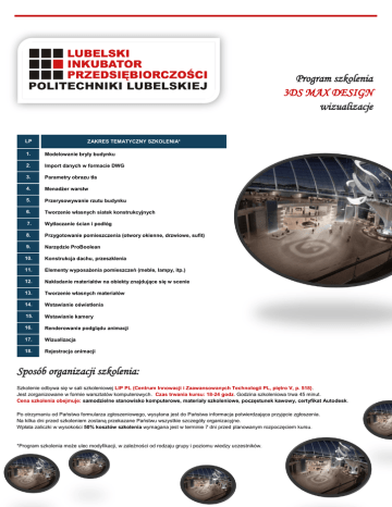 Program szkolenia 3DS MAX DESIGN wizualizacje LP ZAKRES TEMATYCZNY SZKOLENIA* 1. Modelowanie bryły budynku 2. Import danych w formacie DWG 3. Parametry obrazu tła 4. Menadżer warstw 5. Przerysowywanie rzutu budynku 6. Tworzenie własnych siatek konstrukcyjnych 7. Wytłaczanie ścian i podłóg 8. Przygotowanie pomieszczenia (otwory okienne, drzwiowe, sufit) 9. Narzędzie ProBoolean 10. Konstrukcja dachu, przeszklenia 11. Elementy wyposażenia pomieszczeń (meble, lampy, itp.) 12. Nakładanie materiałów na obiekty znajdujące się w scenie 13. Tworzenie własnych materiałów 14. Wstawianie oświetlenia 15. Wstawianie kamery 16. Renderowanie podglądu animacji 17. Wizualizacja 18. Rejestracja animacji Sposób organizacji szkolenia: Szkolenie odbywa się w sali szkoleniowej LIP PL (Centrum Innowacji i Zaawansowanych Technologii PL, piętro V, p. 518). Jest zorganizowane w formie warsztatów komputerowych. Czas trwania kursu: 18-24 godz. Godzina szkoleniowa trwa 45 minut. Cena szkolenia obejmuje: samodzielne stanowisko komputerowe, materiały szkoleniowe, poczęstunek kawowy, certyfikat Autodesk. Po otrzymaniu od Państwa formularza zgłoszeniowego, wysyłana jest do Państwa informacja potwierdzająca przyjęcie zgłoszenia. Na kilka dni przed szkoleniem zostaną przekazane Państwu wszystkie szczegóły organizacyjne. Wpłata zaliczki w wysokości 50% kosztów szkolenia wymagana jest w terminie 7 dni przed planowanym rozpoczęciem kursu. *Program szkolenia może ulec modyfikacji, w zależności od rodzaju grupy i poziomu wiedzy uczestników.
