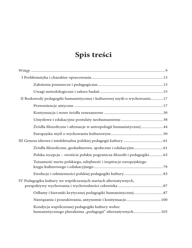 Spis treści Wstęp........................................................................................................................................ 9 I Problematyka i charakter opracowania.........................................................................13 Założenia poznawcze i pedagogiczne..................................................................13 Uwagi metodologiczne i zakres badań................................................................15 II Rodowody pedagogiki humanistycznej i kulturowej myśli o wychowaniu.............17 Proweniencje antyczne..........................................................................................17 Kontynuacja i nowe źródła renesansowe............................................................30 Umysłowe i edukacyjne postulaty neohumanizmu...........................................38 Źródła filozoficzne i afirmacje w antropologii humanistycznej.......................44 Europejska myśl o wychowaniu kulturowym.....................................................50 III Geneza ideowa i intelektualna polskiej pedagogii kultury.........................................61 Źródła filozoficzne, geokulturowe, społeczne i edukacyjne..............................61 Polska recepcja – swoiście polskie pogranicza filozofii i pedagogiki..............63 Tożsamość nurtu polskiego, odrębność i inspiracje europejskiego kręgu kulturowego i edukacyjnego......................................................................79 Ewolucje i odmienności polskiej pedagogiki kultury........................................83 IV Pedagogika kultury we współczesnych nurtach alternatywnych, perspektywy wychowania i wychowalności człowieka..............................................87 Odłamy i kierunki krytycznej pedagogiki humanistycznej..............................87 Nawiązania i poszukiwania, antynomie i kontynuacje....................................100 Kondycja współczesnej pedagogiki kultury wobec humanistycznego pluralizmu „pedagogii” alternatywnych............................103 V Postmodernizm kryzys, czy nieuchronna zmiana kulturowej koncepcji wychowania....................................................................................109 Geneza, prekursorzy i intelektualni mentorzy nurtu.......................................109 Postmodernistyczny dyskurs o kulturze i wychowaniu – możliwości i ograniczenia...................................................................................114 Tożsamość i kondycja współczesnej pedagogiki kultury w konfrontacji z postmodernistyczną myślą o wychowaniu..........................121 „Kryzys” kultury uniwersalnej a wyzwania i powinności współczesnej pedagogiki kultury.......................................................................124 VI Pedagogika kultury a „humanistyczny postmodernizm” w edukacji i wychowaniu..............................................................................................131 Pedagogika kultury i jej aksjologia wychowania na tle postmodernistycznego modelu edukacyjnego.......................................131 Uniwersalizm i maksymalizm pedagogiki kultury a postulaty edukacyjnego indywidualizmu.......................................................136 Pedagogika kultury i jej szanse na humanistyczne zrównoważenie teleologii wychowania w dobie ponowoczesnej...................139 Co i dlaczego warto kontynuować i rozwijać wobec cywilizacyjnych zmian współczesności.................................................142 Zakończenie.........................................................................................................................147 Bibliografia (wybór)............................................................................................................153 Wydawnictwa zwarte..........................................................................................................153