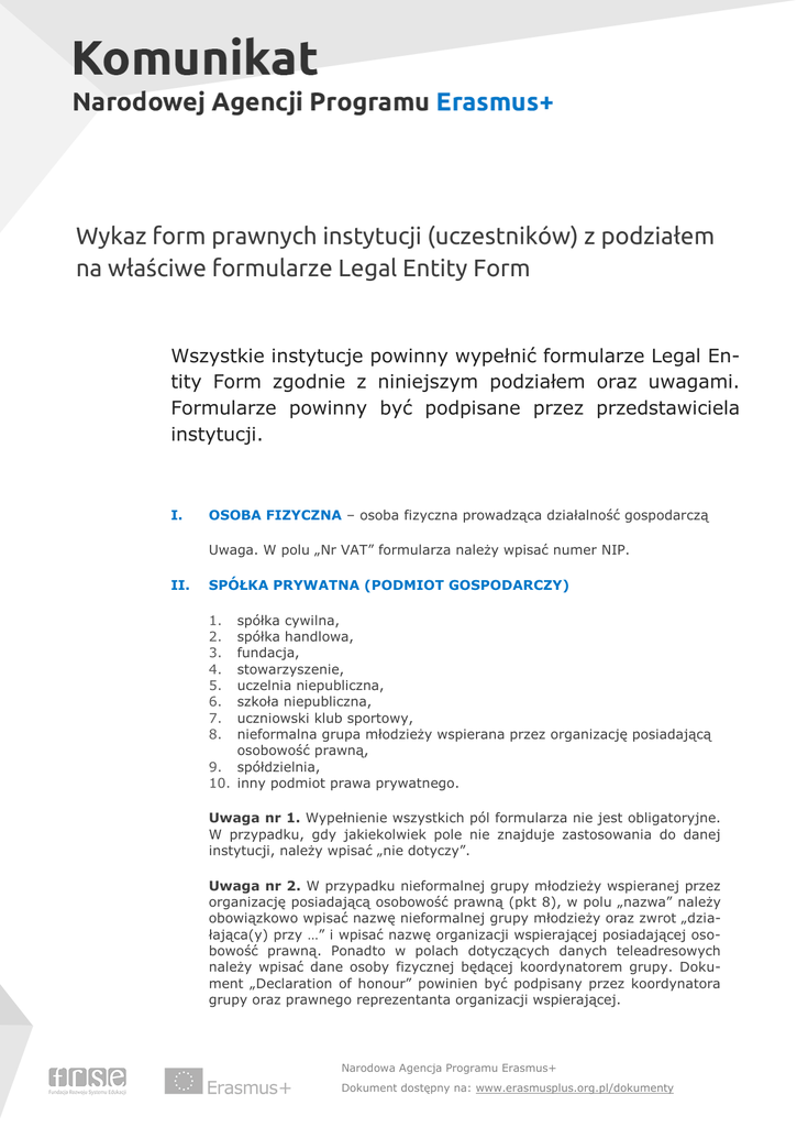Wykaz form prawnych instytucji (uczestników) z podziałem na właściwe formularze Legal Entity Form Wszystkie instytucje powinny wypełnić formularze Legal Entity Form zgodnie z niniejszym podziałem oraz uwagami. Formularze powinny być podpisane przez przedstawiciela instytucji. I. OSOBA FIZYCZNA – osoba fizyczna prowadząca działalność gospodarczą Uwaga. W polu „Nr VAT” formularza należy wpisać numer NIP. II. SPÓŁKA PRYWATNA (PODMIOT GOSPODARCZY) 1. 2. 3. 4. 5. 6. 7. 8. spółka cywilna, spółka handlowa, fundacja, stowarzyszenie, uczelnia niepubliczna, szkoła niepubliczna, uczniowski klub sportowy, nieformalna grupa młodzieży wspierana przez organizację posiadającą osobowość prawną, 9. spółdzielnia, 10. inny podmiot prawa prywatnego. Uwaga nr 1. Wypełnienie wszystkich pól formularza nie jest obligatoryjne. W przypadku, gdy jakiekolwiek pole nie znajduje zastosowania do danej instytucji, należy wpisać „nie dotyczy”. Uwaga nr 2. W przypadku nieformalnej grupy młodzieży wspieranej przez organizację posiadającą osobowość prawną (pkt 8), w polu „nazwa” należy obowiązkowo wpisać nazwę nieformalnej grupy młodzieży oraz zwrot „działająca(y) przy …” i wpisać nazwę organizacji wspierającej posiadającej osobowość prawną. Ponadto w polach dotyczących danych teleadresowych należy wpisać dane osoby fizycznej będącej koordynatorem grupy. Dokument „Declaration of honour” powinien być podpisany przez koordynatora grupy oraz prawnego reprezentanta organizacji wspierającej. Narodowa Agencja Programu Erasmus+ Dokument dostępny na: www.erasmusplus.org.pl/dokumenty III. POMIOT PRAWA PUBLICZNEGO 1. 2. 3. 4. 5. 6. 7. 8. 9. 10. 11. naczelny organ administracji publicznej (np. Minister), samorząd gminny, powiatowy, wojewódzki, kościelna osoba prawna (np. parafia), uczelnia publiczna, szkoła publiczna, instytucja kultury, dom kultury, biblioteka publiczna, instytut PAN, ośrodek pomocy społecznej, OHP (np. Komenda Główna OHP, ośrodek kształcenia i wychowania OHP), 12. inny podmiot prawa publicznego. Uwaga. Wypełnienie wszystkich pól formularza nie jest obligatoryjne. W przypadku, gdy jakiekolwiek pole nie znajduje zastosowania do danej instytucji, należy wpisać „nie dotyczy”. Narodowa Agencja Programu Erasmus+ Dokument dostępny na: www.erasmusplus.org.pl/dokumenty