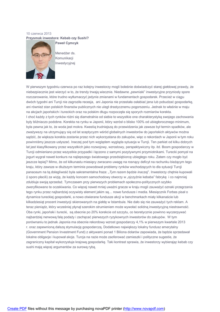 10 czerwca 2013 Przysmak inwestora: Kebab czy Sushi? Paweł Cymcyk Menedżer ds. Komunikacji Inwestycyjnej W pierwszym tygodniu czerwca po raz kolejny inwestorzy mogli boleśnie doświadczyć starej giełdowej prawdy, że niebezpiecznie jest wierzyć w to, że trendy trwają wiecznie. Niedawne „pewniaki” inwestycyjne przyniosły spore rozczarowanie, które trudno wytłumaczyć jedynie zmianami w fundamentach gospodarek. Przecież w ciągu dwóch tygodni ani Turcji nie zagroziła recesja, ani Japonia nie przestała osłabiać jena lub pobudzać gospodarkę, ani również stan polskich finansów publicznych nie uległ drastycznemu pogorszeniu. Jednak to właśnie w maju na akcjach japońskich i tureckich oraz na polskim długu rozpoczęła się sporych rozmiarów korekta. I choć każdy z tych rynków różni się diametralnie od siebie to wszystkie one charakterystyką swojego zachowania były bliźniaczo podobne. Korekta na rynku w Japonii, który wzrósł o blisko 100% od ubiegłorocznego minimum, była pewna jak to, że woda jest mokra. Kwestią trudniejszą do przewidzenia jak zawsze był termin spadków, ale zważywszy na utrzymujący się od lat sceptycyzm wśród globalnych inwestorów do japońskich aktywów można sądzić, że większa korekta zostanie przez nich wykorzystana do zakupów, więc o rekordach w Japonii w tym roku powinniśmy jeszcze usłyszeć. Inaczej pod tym względem wygląda sytuacja w Turcji. Ten parkiet od kilku dobrych lat jest klasyfikowany przez wszystkich jako rozwojowy, wzrostowy, perspektywiczny itp. itd. Boom gospodarczy w Turcji odmieniano przez wszystkie przypadki i łączono z samymi pozytywnymi przymiotnikami. Turecki pomysł na jogurt wygrał nawet konkurs na najlepszego światowego przedsiębiorcę ubiegłego roku. Zatem czy mogło być jeszcze lepiej? Mimo, że od kilkunastu miesięcy zwracano uwagę na rosnący deficyt na rachunku bieżącym tego kraju, który zawsze w dłuższym terminie powodował problemy rynków wschodzących to dla sytuacji Turcji panaceum na tą dolegliwość była sakramentalna fraza: „Tym razem będzie inaczej”. Inwestorzy chętnie kupowali (i sporo płacili) za wizję, że każdy koncern samochodowy otworzy w „ojczyźnie kebaba” fabrykę i co najmniej zdubluje swoją sprzedaż. Tymczasem przy pierwszych problemach społeczno-politycznych szybko zweryfikowano te oczekiwania. Co więcej nawet mniej uważni gracze w kraju mogli zauważyć oznaki przegrzania tego rynku przez najbardziej oczywisty element jakim są… nowe fundusze i media. Miesięcznik Forbes pisał o dynamice tureckiej gospodarki, a nowo otwierane fundusze akcji w benchmarkach miały kilkanaście lub kilkadziesiąt procent inwestycji skierowanych na giełdę w Istambule. Nie dało się nie zauważyć tych reklam. A teraz pieniądz, który wcześniej płynął szerokim strumieniem może wywołać solidną inwestycyjną niestrawność. Oba rynki, japoński i turecki, są obecnie po 20% korekcie od szczytu, co teoretycznie powinno wyczerpywać najbardziej nerwową falę podaży i zachęcać pierwszych ryzykownych inwestorów do zakupów. W tym porównaniu to jednak Japonia ma obecnie rekordowy wzrost gospodarczy 4,1% w pierwszym kwartale 2013 r. oraz zapewnioną dalszą stymulację gospodarczą. Dodatkowo największy lokalny fundusz emerytalny (Government Pension Investment Fund) z aktywami ponad 1 Biliona dolarów zapowiada, że będzie sprzedawał lokalne obligacje i kupował akcje. Turcja na razie może zaoferować zamieszki i polityczne sugestie, że zagraniczny kapitał wykorzystuje krajową gospodarkę. Taki kontrast sprawia, że inwestorzy wybierając kebab czy sushi mają więcej argumentów za surową rybą. Create PDF files without this message by purchasing novaPDF printer (http://www.novapdf.com)