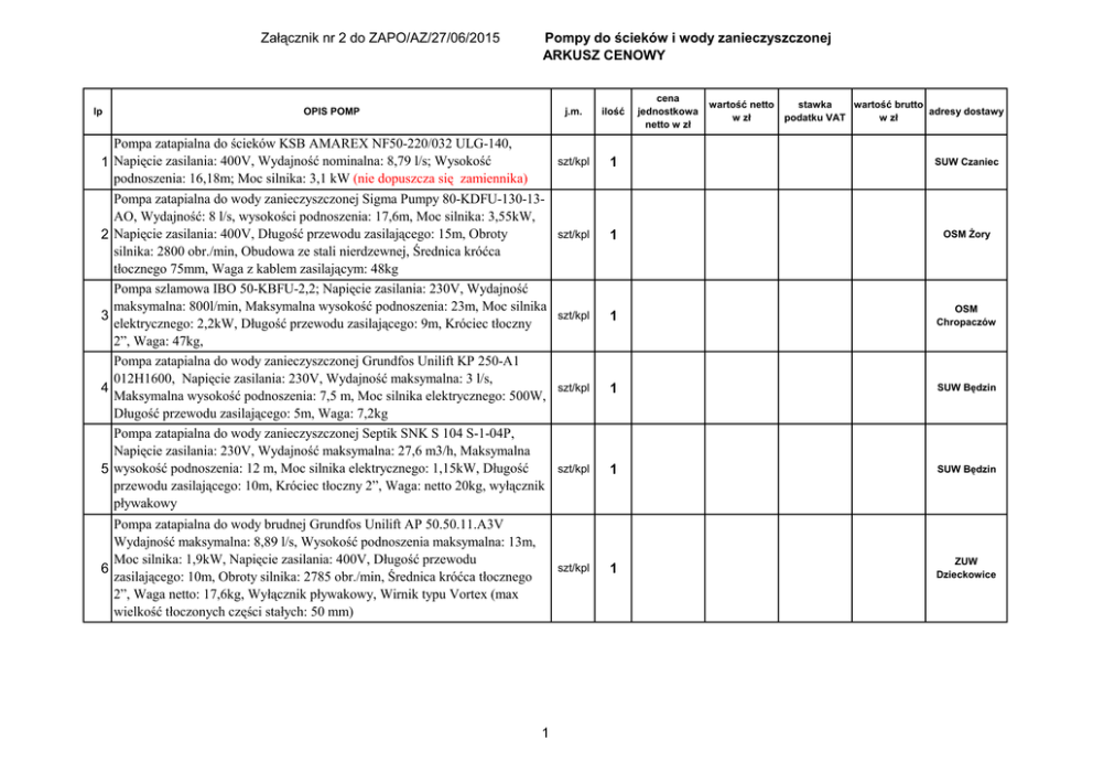 Załącznik nr 2 do ZAPO/AZ/27/06/2015 lp 1 2 3 4 5 Pompy do ścieków i wody zanieczyszczonej ARKUSZ CENOWY OPIS POMP Pompa zatapialna do ścieków KSB AMAREX NF50-220/032 ULG-140, Napięcie zasilania: 400V, Wydajność nominalna: 8,79 l/s; Wysokość podnoszenia: 16,18m; Moc silnika: 3,1 kW (nie dopuszcza się zamiennika) Pompa zatapialna do wody zanieczyszczonej Sigma Pumpy 80-KDFU-130-13AO, Wydajność: 8 l/s, wysokości podnoszenia: 17,6m, Moc silnika: 3,55kW, Napięcie zasilania: 400V, Długość przewodu zasilającego: 15m, Obroty silnika: 2800 obr./min, Obudowa ze stali nierdzewnej, Średnica króćca tłocznego 75mm, Waga z kablem zasilającym: 48kg Pompa szlamowa IBO 50-KBFU-2,2; Napięcie zasilania: 230V, Wydajność maksymalna: 800l/min, Maksymalna wysokość podnoszenia: 23m, Moc silnika elektrycznego: 2,2kW, Długość przewodu zasilającego: 9m, Króciec tłoczny 2”, Waga: 47kg, Pompa zatapialna do wody zanieczyszczonej Grundfos Unilift KP 250-A1 012H1600, Napięcie zasilania: 230V, Wydajność maksymalna: 3 l/s, Maksymalna wysokość podnoszenia: 7,5 m, Moc silnika elektrycznego: 500W, Długość przewodu zasilającego: 5m, Waga: 7,2kg Pompa zatapialna do wody zanieczyszczonej Septik SNK S 104 S-1-04P, Napięcie zasilania: 230V, Wydajność maksymalna: 27,6 m3/h, Maksymalna wysokość podnoszenia: 12 m, Moc silnika elektrycznego: 1,15kW, Długość przewodu zasilającego: 10m, Króciec tłoczny 2”, Waga: netto 20kg, wyłącznik pływakowy Pompa zatapialna do wody brudnej Grundfos Unilift AP 50.50.11.A3V Wydajność maksymalna: 8,89 l/s, Wysokość podnoszenia maksymalna: 13m, Moc silnika: 1,9kW, Napięcie zasilania: 400V, Długość przewodu 6 zasilającego: 10m, Obroty silnika: 2785 obr./min, Średnica króćca tłocznego 2”, Waga netto: 17,6kg, Wyłącznik pływakowy, Wirnik typu Vortex (max wielkość tłoczonych części stałych: 50 mm) 1 cena jednostkowa netto w zł wartość netto w zł stawka wartość brutto adresy dostawy podatku VAT w zł j.m. ilość szt/kpl 1 SUW Czaniec szt/kpl 1 OSM śory szt/kpl 1 OSM Chropaczów szt/kpl 1 SUW Będzin szt/kpl 1 SUW Będzin szt/kpl 1 ZUW Dzieckowice Załącznik nr 2 do ZAPO/AZ/27/06/2015 Pompy do ścieków i wody zanieczyszczonej ARKUSZ CENOWY Pompa zatapialna do ścieków Grundfos SE1.50.80.30.2.50D Wydajność maksymalna: 19,4 l/s, Wysokość podnoszenia maksymalna: 22m, Moc silnika: 3,8kW, Napięcie zasilania: 3x380-415V, Długość przewodu zasilającego: 10m, 7 Obroty silnika: 2910 obr./min, Średnica króćca tłocznego DN 80, Waga netto: szt/kpl 92kg, Wirnik typu S-tube (max wielkość tłoczonych cząstek stałych: 50 mm), czujnik wilgoci i obecności wody w oleju, wykonanie przeciwwybuchowe EEX DC IIB T4,T3 T135#,T200# (nie dopuszcza się zamiennika) ZUW Dziećkowice 1 razem Dla pozycji 2,3,4,5,6, dopuszcza się produkty równowaŜne przy zachowaniu parametrów takich jak wydajność, wysokość podnoszenia nie odbiegających od podanych w zestawieniu o więcej niŜ ± 10%, masy urządzenia nie przekraczającej wartości podanej w opisie oraz zachowaniu pozostałych elementów tj. napięcie zasilania, długości przewodów zasilających, średnice króćców tłocznych, wyposaŜenie lp 1 2 3 4 5 NR TELEFONU ADRESY DOSTAW Górnośląskie Przedsiębiorstwo Wodociągów S.A. Stacja Uzdatniania Wody „Czaniec” 43-356 Kobiernice ul. Wodociągowa 1 Górnośląskie Przedsiębiorstwo Wodociągów S.A. Oddział Sieci Magistralnej „śory” 44-240 śory ul. Szczejkowicka 4 Górnośląskie Przedsiębiorstwo Wodociągów S.A. Oddział Sieci Magistralnej „Chropaczów” 41-604 Świętochłowice ul. Łagiewnicka 78 Górnośląskie Przedsiębiorstwo Wodociągów S.A. Stacja Uzdatniania Wody Będzin ul. Siemońska 45 42-500 Będzin Górnośląskie Przedsiębiorstwo Wodociągów S.A. Zakład Uzdatniania Wody „Dziećkowice” 41-407 Imielin ul. Wodna 3 33 829 2155 32 434 5265 32 245 2703 Adres e-mail [email protected] [email protected] [email protected] [email protected] [email protected] [email protected] [email protected] 32 269 2161 32 222 3434 2 [email protected] [email protected]