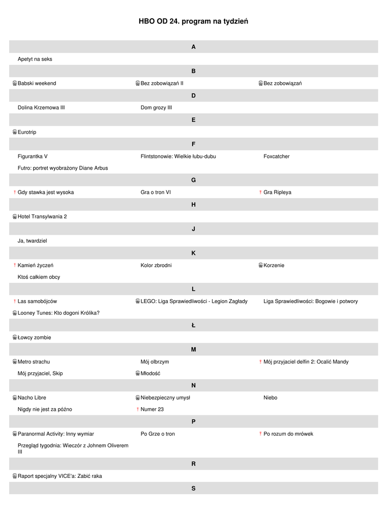 HBO OD 24. program na tydzień A Apetyt na seks B Babski weekend Bez zobowiązań II Bez zobowiązań D Dolina Krzemowa III Dom grozy III E Eurotrip F Figurantka V Flintstonowie: Wielkie łubu-dubu Foxcatcher Futro: portret wyobrażony Diane Arbus G Gdy stawka jest wysoka Gra o tron VI Gra Ripleya H Hotel Transylwania 2 J Ja, twardziel K Kamień życzeń Kolor zbrodni Korzenie Ktoś całkiem obcy L Las samobójców LEGO: Liga Sprawiedliwości - Legion Zagłady Liga Sprawiedliwości: Bogowie i potwory Looney Tunes: Kto dogoni Królika? Ł Łowcy zombie M Metro strachu Mój olbrzym Mój przyjaciel, Skip Młodość Mój przyjaciel delfin 2: Ocalić Mandy N Nacho Libre Niebezpieczny umysł Nigdy nie jest za późno Numer 23 Niebo P Paranormal Activity: Inny wymiar Po Grze o tron Po rozum do mrówek Przegląd tygodnia: Wieczór z Johnem Oliverem III R Raport specjalny VICE'a: Zabić raka S Schmidt Snajper Straszny dom Słuszna decyzja T The Walk. Sięgając chmur Tom i Jerry: Pomocnicy świętego Mikołaja U Uwięziona W Whiplash Wywiad ze Słońcem Narodu Z Zgon na pogrzebie X X+Y