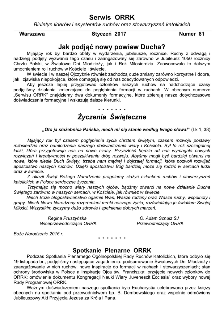 Serwis ORRK Biuletyn liderów i asystentów ruchów oraz stowarzyszeń katolickich Styczeń 2017 Warszawa Numer 81 Jak podjąć nowy powiew Ducha? Mijający rok był bardzo obfity w wydarzenia, jubileusze, rocznice. Ruchy z odwagą i nadzieją podjęły wyzwania tego czasu i zaangażowały się zarówno w Jubileusz 1050 rocznicy Chrztu Polski, w Światowe Dni Młodzieży, jak i Rok Miłosierdzia. Zaowocowało to dalszym umocnieniem roli ruchów w Kościele i świecie. W świecie i w naszej Ojczyźnie również zachodzą duże zmiany zarówno korzystne i dobre, jak i zjawiska niepokojące, które domagają się od nas zdecydowanych odpowiedzi. Aby jeszcze lepiej przygotować członków naszych ruchów na nadchodzące czasy podjęliśmy działania zmierzające do pogłębienia formacji w ruchach. W obecnym numerze „Serwisu ORRK” znajdziemy dwa dokumenty formacyjne, które zbierają nasze dotychczasowe doświadczenia formacyjne i wskazują dalsze kierunki. * * * * * * * Życzenia Świąteczne „Oto ja służebnica Pańska, niech mi się stanie według twego słowa!” (Łk 1, 38) Mijający rok był czasem pogłębienia życia chrztem świętym, czasem rozwoju postawy miłosierdzia oraz odmłodzenia naszego doświadczenia wiary i Kościoła. Był to rok szczególnej łaski, która przygotowuje nas na nowe czasy. Przyszłość będzie od nas wymagała nowych rozwiązań i kreatywności w poszukiwaniu dróg rozwoju. Abyśmy mogli być bardziej otwarci na nowe, które niesie Duch Święty, trzeba nam mądrej i dojrzalej formacji, która pozwoli rozwijać apostolstwo naszych ruchów. Dzięki apostolstwu Bóg bardziej może się rodzić w sercach ludzi oraz w świecie. Z okazji Świąt Bożego Narodzenia pragniemy złożyć członkom ruchów i stowarzyszeń katolickich w Polsce serdeczne życzenia. Trzymając się mocno wiary naszych ojców, bądźmy otwarci na nowe działanie Ducha Świętego zarówno w naszych sercach, w Kościele, jak również w świecie. Niech Boże błogosławieństwo ogarnie Was, Wasze rodziny oraz Wasze ruchy, wspólnoty i grupy. Niech Nowo Narodzony rozpromieni mroki naszego życia, rozświetlając je światłem Swojej Miłości. Wszystkim życzymy dużo zdrowia i spełnienia dobrych marzeń. Regina Pruszyńska Wiceprzewodnicząca ORRK O. Adam Schulz SJ Przewodniczący ORRK Boże Narodzenie 2016 r. * * * * * * * Spotkanie Plenarne ORRK Podczas Spotkania Plenarnego Ogólnopolskiej Rady Ruchów Katolickich, które odbyło się 19 listopada br., podjęliśmy następujące zagadnienia: podsumowanie Światowych Dni Młodzieży i zaangażowanie w nich ruchów; nowe inspiracje do formacji w ruchach i stowarzyszeniach; stan ochrony środowiska w Polsce a inspiracje Ojca św. Franciszka; przyjęcie nowych członków do ORRK; omówienie dokumentu Kongregacji Nauki Wiary „luvenescit Ecclesia” oraz wybory nowej Rady Programowej ORRK. Ważnym doświadczeniem naszego spotkania była Eucharystia celebrowana przez księży obecnych na spotkaniu pod przewodnictwem bp. B. Dembowskiego oraz wspólnie odmówiony Jubileuszowy Akt Przyjęcia Jezusa za Króla i Pana. I. Podsumowanie Światowych Dni Młodzieży i zaangażowania w nich ruchów Wojciech Terlikowski, który dokonał podsumowania zwrócił uwagę na to, że Światowe Dni Młodzież pokazały, że Kościół i Ewangelia jest ciągle aktualną propozycją zarówno dla młodzieży, jak i dla dorosłych i to na całym świecie. Przyjechali do nas ludzie z ponad 180 krajów świata, w tym ponad 900 biskupów i kardynałów. ŚDM były żywym doświadczeniem wiary, Boga oraz doświadczeniem wspólnoty, która rodziła się pośród różnych kultur, języków i doświadczeń społecznych. ŚDM ukazały też siłę i bogactwo Kościoła w Polsce. Jeśli chodzi o Europę to jest to w niej najsilniejszy Kościół a i w świecie jest jednym z najważniejszych. ŚDM oraz wizyta Ojca św. Franciszka w Polsce przyniosła ożywienie duchowe. A przygotowywanie spotkania i pobyt gości z zagranicy w poszczególnych parafiach ożywiło je. Mimo że było to spotkanie młodych, to ta pielgrzymka Ojca św. przyniosła nowe inspiracje duchowe również średniemu pokoleniu, które na nowo odkryło świeżość Ewangelii, poruszyła ich głębia i autentyczność spotkań z młodymi, a też i poziom przygotowania tych spotkań i ich przeprowadzenia. Osoby starsze poczuły się jeszcze bardziej dowartościowane, gdy Ojciec św. mocno apelował o szacunek dla babć i dziadków. Trzeba nam w tym roku szkolnym wrócić do homilii, konferencji Ojca św. i je w sposób bardziej pogłębiony przestudiować, przemodlić je - bo one mają bardzo dużo treści, które mogą być pomocne w naszym życiu duchowym. Młodzi ludzie są zainteresowani udziałem w konkretnych projektach, programach czy wydarzeniach apostolskich, stąd tak duże zainteresowanie wolontariatem realizowanym w Polsce i zagranicą. Musimy proponować młodym udział w konkretnych działaniach i przy okazji ich proponować formację. Natomiast o. Adam Schulz SJ podkreślił, że zdecydowana większość młodzieży jaka przyjechała do Krakowa z różnych stron świata była z ruchów, grup, wspólnot i stowarzyszeń katolickich. Do wyjątków należały osoby niezrzeszone, które przyjechały indywidualnie. To, że ruchy tak bardzo angażują się w organizowanie i przebieg ŚDM jest zjawiskiem, które trwa od samego początku tej inicjatywy. Jak wiemy Jan Paweł II podejmując się opieki nad ŚDM podjął inicjatywę, która powstała w jednym z ruchów katolickich. Ruchy międzynarodowe organizowały własne spotkania przygotowujące ŚDM, poza tym większość wolontariuszy oraz osób przygotowujących ŚDM w parafiach, to byli członkowie ruchów. Ruchy spisały się na medal i szkoda, że tak mało księży zaangażowało się w przygotowanie i zorganizowane ŚDM w parafiach i diecezjach. II. Postawy, do których zachęca nas Ojciec św. Franciszek 1. Towarzyszenie ludziom, n