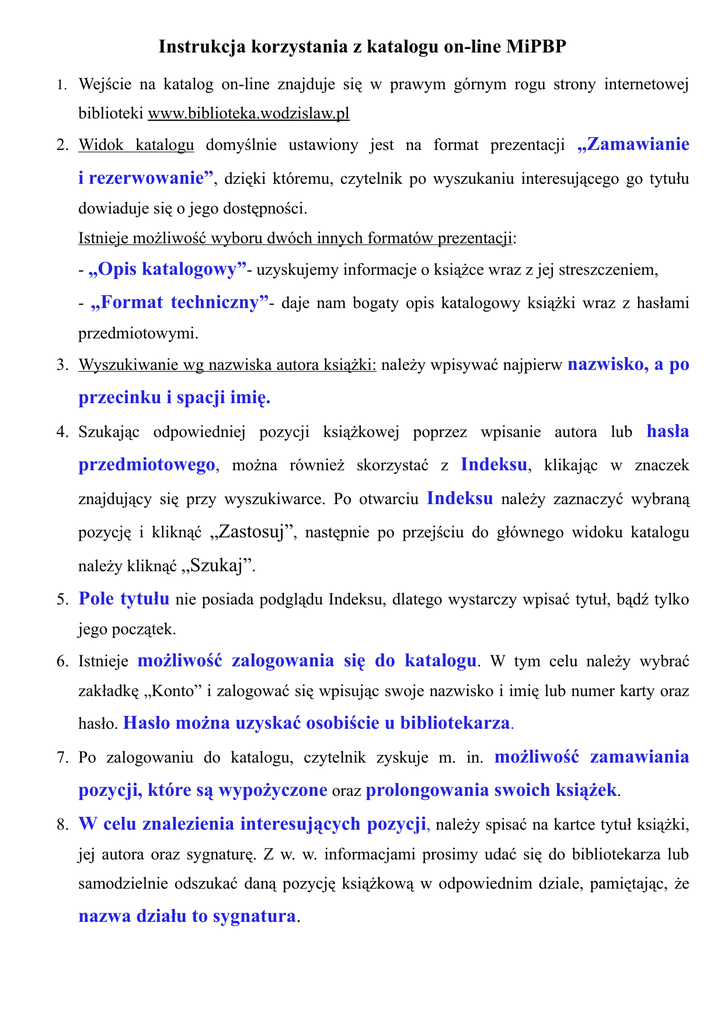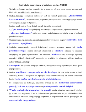 Instrukcja korzystania z katalogu on-line MiPBP 1. Wejście na katalog on-line znajduje się w prawym górnym rogu strony internetowej biblioteki www.biblioteka.wodzislaw.pl 2. Widok katalogu domyślnie ustawiony jest na format prezentacji „Zamawianie i rezerwowanie”, dzięki któremu, czytelnik po wyszukaniu interesującego go tytułu dowiaduje się o jego dostępności. Istnieje możliwość wyboru dwóch innych formatów prezentacji: - „Opis katalogowy”- uzyskujemy informacje o książce wraz z jej streszczeniem, - „Format techniczny”- daje nam bogaty opis katalogowy książki wraz z hasłami przedmiotowymi. 3. Wyszukiwanie wg nazwiska autora książki: należy wpisywać najpierw nazwisko, a po przecinku i spacji imię. 4. Szukając odpowiedniej pozycji książkowej poprzez wpisanie autora lub hasła przedmiotowego, można również skorzystać z Indeksu, klikając w znaczek znajdujący się przy wyszukiwarce. Po otwarciu Indeksu należy zaznaczyć wybraną pozycję i kliknąć „Zastosuj”, następnie po przejściu do głównego widoku katalogu należy kliknąć „Szukaj”. 5. Pole tytułu nie posiada podglądu Indeksu, dlatego wystarczy wpisać tytuł, bądź tylko jego początek. 6. Istnieje możliwość zalogowania się do katalogu. W tym celu należy wybrać zakładkę „Konto” i zalogować się wpisując swoje nazwisko i imię lub numer karty oraz hasło. Hasło można uzyskać osobiście u bibliotekarza. 7. Po zalogowaniu do katalogu, czytelnik zyskuje m. in. możliwość zamawiania pozycji, które są wypożyczone oraz prolongowania swoich książek. 8. W celu znalezienia interesujących pozycji, należy spisać na kartce tytuł książki, jej autora oraz sygnaturę. Z w. w. informacjami prosimy udać się do bibliotekarza lub samodzielnie odszukać daną pozycję książkową w odpowiednim dziale, pamiętając, że nazwa działu to sygnatura.