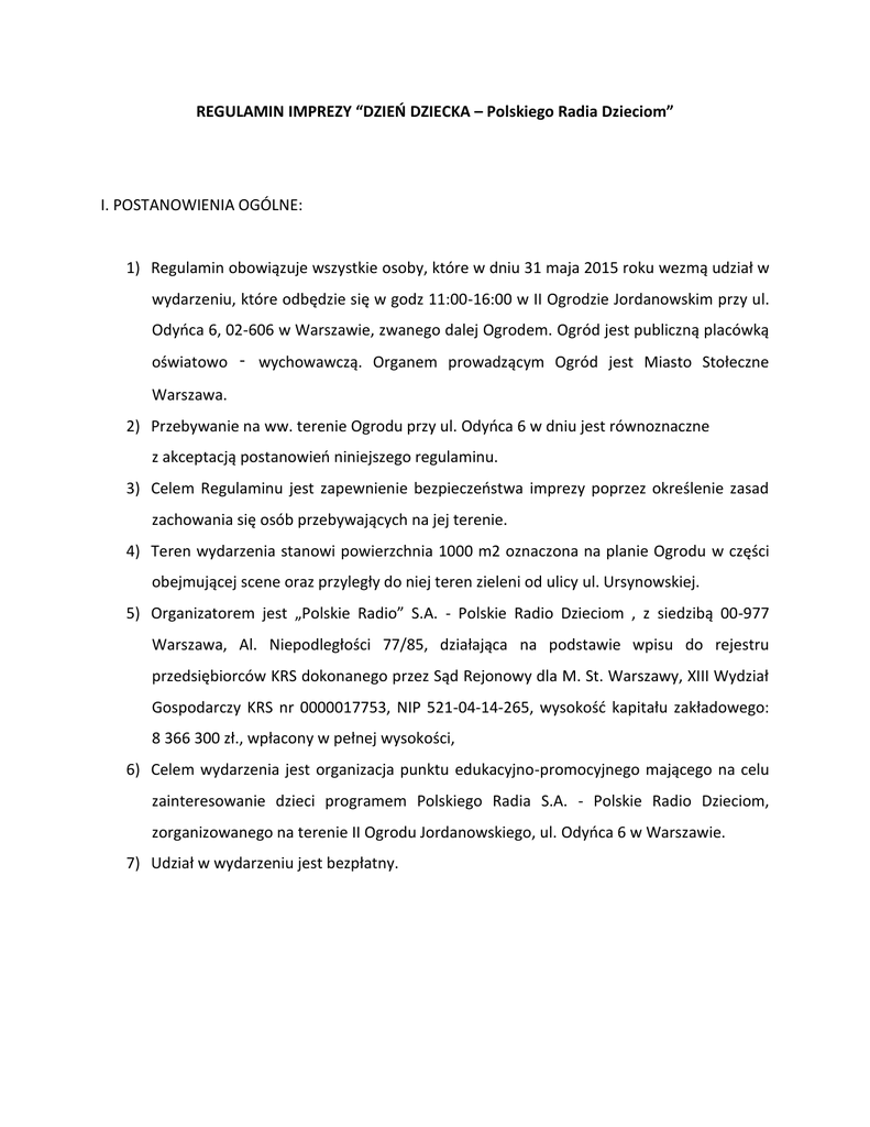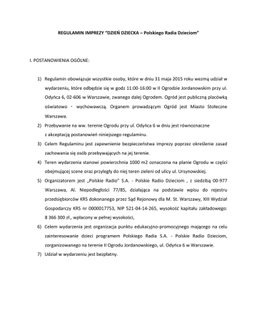 REGULAMIN IMPREZY “DZIEŃ DZIECKA – Polskiego Radia Dzieciom” I. POSTANOWIENIA OGÓLNE: 1) Regulamin obowiązuje wszystkie osoby, które w dniu 31 maja 2015 roku wezmą udział w wydarzeniu, które odbędzie się w godz 11:00-16:00 w II Ogrodzie Jordanowskim przy ul. Odyńca 6, 02-606 w Warszawie, zwanego dalej Ogrodem. Ogród jest publiczną placówką oświatowo ‑ wychowawczą. Organem prowadzącym Ogród jest Miasto Stołeczne Warszawa. 2) Przebywanie na ww. terenie Ogrodu przy ul. Odyńca 6 w dniu jest równoznaczne z akceptacją postanowień niniejszego regulaminu. 3) Celem Regulaminu jest zapewnienie bezpieczeństwa imprezy poprzez określenie zasad zachowania się osób przebywających na jej terenie. 4) Teren wydarzenia stanowi powierzchnia 1000 m2 oznaczona na planie Ogrodu w części obejmującej scene oraz przyległy do niej teren zieleni od ulicy ul. Ursynowskiej. 5) Organizatorem jest „Polskie Radio” S.A. - Polskie Radio Dzieciom , z siedzibą 00-977 Warszawa, Al. Niepodległości 77/85, działająca na podstawie wpisu do rejestru przedsiębiorców KRS dokonanego przez Sąd Rejonowy dla M. St. Warszawy, XIII Wydział Gospodarczy KRS nr 0000017753, NIP 521-04-14-265, wysokość kapitału zakładowego: 8 366 300 zł., wpłacony w pełnej wysokości, 6) Celem wydarzenia jest organizacja punktu edukacyjno-promocyjnego mającego na celu zainteresowanie dzieci programem Polskiego Radia S.A. - Polskie Radio Dzieciom, zorganizowanego na terenie II Ogrodu Jordanowskiego, ul. Odyńca 6 w Warszawie. 7) Udział w wydarzeniu jest bezpłatny. II. ZASADY ORGANIZACYJNE I PORZĄDKOWE OBOWIĄZUJĄCE NA TERENIE II OGRODU W CZASIE TRWANIA WYDARZENIA: 1) Osoby niepełnoletnie przebywają na terenie Ogrodu wyłącznie pod opieką osoby dorosłej. 2) Wszelką odpowiedzialność za osoby niepełnoletnie ponoszą ich rodzice/opiekunowie. 3) Organizator nie ponosi odpowiedzialności za wypadki osób biorących udział w imprezie, a w szczególności w zabawach animacyjnych prowadzonych w czasie imprezy. Z tych względów zaleca się ubezpieczenie we własnym zakresie osób biorących udział w imprezie od następstw nieszczęśliwych wypadków. 4) Wszystkie osoby, które znajdują się na terenie Ogrodu zobowiązane są zachowywać się w sposób niezagrażający bezpieczeństwu innych uczestników, a w szczególności przestrzegać postanowień Regulaminu oraz stosować się do poleceń pracowników ochrony, służb medycznych i przedstawicieli Organizatora mających na celu zapewnieniem bezpieczeństwa i porządku. 5) Zakazane jest: a. niszczenie oznaczeń i tablic informacyjnych, urządzeń, dekoracji i wszelkiego rodzaju sprzętu znajdującego się na terenie Ogrodu. b. jakiekolwiek działania mogących stanowić zagrożenie dla życia, zdrowia lub bezpieczeństwa osób przebywających na terenie Ogrodu. 6) Zabrania się wnoszenia: a. broni lub innych niebezpiecznych przedmiotów, b. materiałów wybuchowych, c. wyrobów pirotechnicznych, d. napojów zawierających alkohol e. materiałów pożarowo niebezpiecznych f. środków odurzających lub substancji psychotropowych 7) W II Ogrodzie Jordanowski obowiązuje bezwzględny zakaz palenia tytoniu. 8) Służby porządkowe Organizatora uprawnione są do: a. przeglądania odzieży osób w przypadku podejrzenia, że osoby te wnoszą lub posiadają przedmioty, o których mowa w cz. II pkt. 9 Regulaminu, b. wydawania poleceń porządkowych osobom zakłócającym porządek publiczny lub zachowującym się niezgodnie z Regulaminem, a w przypadku niewykonania tych poleceń – wezwania ich do opuszczenia terenu wydarzenia. c. ujęcia, w celu niezwłocznego przekazania Policji, osób stwarzających bezpośrednie zagrożenie dla życia lub zdrowia ludzkiego, a także w celu ochrony mienia. 9) Osoby przebywające na terenie Ogrodu mogą być narażone na ciągłe przebywanie w strefie dźwięków, co może spowodować uszkodzenie słuchu. 10) Uczestnicy przebywają na terenie Ogrodu na własne ryzyko. 11) W przypadku zauważenia pożaru lub innego miejscowego zagrożenia należy postępować zgodnie z poniższą instrukcją: a. kto zauważy pożar lub inne miejscowe zagrożenie zobowiązany jest niezwłocznie powiadomić Organizatora lub służby porządkowe. b. powiadomić osoby bezpośrednio zagrożone i jak najszybciej opuścić miejsce zagrożenia. c. Organizator Imprezy zobowiązany jest do bezzwłocznego powiadomienia odpowiednich służb ratowniczych i równoczesnego rozpoczęcia akcji ratowniczo -gaśniczej lub ewakuacji. 12) Z miejsca wydarzenia realizowany będzie przez Ogranizatora program radiowy “na żywo”, a wydarzenie będzie utrwalane audiowizualnie dla celów programowych, w tym realacji z wydarzenia na antenie Ogranizatora, jego strnie internetowej oraz profilach na portalach społecznościowych. 13) Organizator utrwala przebieg pokazów dla celów bezpieczeństwa, dokumentacji oraz dla celów programowych, promocji lub reklamy. Wizerunek osób przebywających na terenie Ogrodu może zostać utrwalony, a następnie rozpowszechniany dla celów dokumentacyjnych, sprawozdawczych, programowych, reklamowych oraz promocyjnych. 14) Organizator nie ponosi odpowiedzialności za skutki działania Siły Wyższej. 15) Za Siłę Wyższą uznaje się zdarzenie będące poza kontrolą Organizatora, które powoduje, że wykonanie zobowiązań jest niemożliwe lub może być uznane za niemożliwe ze względu na występujące okoliczności. Siłę Wyższą stanowią w szczególności: warunki atmosferyczne, awarie lub zakłócenia pracy urządzeń, dostarczających energię elektryczną, ciepło, światło, działania wojenne lub działania władz państwowych lub samorządowych w zakresie formułowania polityki, praw i przepisów mających wpływ na wykonanie zobowiązań. 16) Za zgubione lub skradzione przedmioty Organizator nie bierze odpowiedzialności, wartościowe przedmioty. Uczestnik wnosi je do Ogrodu na własne ryzyko. 17) Teren II O