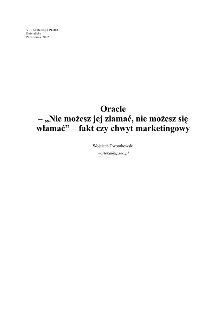 VIII Konferencja PLOUG Koœcielisko PaŸdziernik 2002 Oracle – „Nie mo¿esz jej z³amaæ, nie mo¿esz siê w³amaæ” – fakt czy chwyt marketingowy Wojciech Dworakowski [email protected] Oracle – „Nie możesz jej złamać, nie możesz się włamać” – fakt czy chwyt marketingowy 167 Oracle – „Nie możesz jej złamać, nie możesz się włamać” – fakt czy chwyt marketingowy W listopadzie 2001, Oracle rozpoczęło intensywną kampanię marketingową, pod hasłem: „Oracle 9i – The Unbreakable: You can’t break it, you can’t break in”, czyli „Nie możesz jej złamać, nie możesz się włamać”. Tyle mówi hasło reklamowe, a co mówią fakty? Podczas tegorocznego spotkania PLOUG postaram się przedstawić kilka problemów związanych z bezpieczeństwem systemów Oracle i uczulić na nie projektantów i administratorów. Już na wstępie chcę zaznaczyć, że nie zamierzam odsądzać firmy Oracle od czci i wiary, potępiać posunięć marketingowych i sugerować że DBMS Oracle jest niebezpieczny czy też „dziurawy” jak przysłowiowe rzeszoto. Moim celem jest wykazanie, że każdy produkt jest w większym lub mniejszym stopniu narażony na błędy programistów i projektantów, niezależnie od tego co twierdzą hasła na sztandarach. Oracle 9i to dobry produkt bazodanowy, świadczy o tym chociażby udział w rynku, jednak nawet tak dużym firmom i tak renomowanym produktom zdarzają się wpadki. Należy o tym pamiętać i nie ufać bezgranicznie hasłom reklamowym. Nie bez kozery motto Narodowej Agencji Bezpieczeństwa USA brzmi „Ufamy Bogu – Wszystko inne sprawdzamy”. Zaraz po rozpoczęciu kampanii „The Unbreakable” podniosły się głosy, że jest to sformułowanie co najmniej mocno przesadzone w przypadku Oracle. Zaraz po premierze 9i nie było oczywiście jeszcze znanych zagrożeń związanych z tą wersją, ale znając kłopoty z bezpieczeństwem jakie miała poprzednia wersja – 8i, większość ekspertów, przez analogie i znając zasady rządzące korporacjami zakładało, że rewolucja w podejściu do bezpieczeństwa raczej nie dokonała się. Jeszcze raz powtórzę – we współczesnej informatyce, nie ma produktów które nie posiadałyby błędów, jednakże w przypadku Oracle 8i charakterystyczna była ich ilość i trywialność1. Można było stąd wysnuć wniosek, że błędy te wynikają z niewłaściwego podejścia do zagadnień bezpieczeństwa w samej kulturze firmy. Jak się okazało – eksperci się nie mylili. Hasło „The Unbreakable” podziałało jak płachta na byka na społeczność badającą bezpieczeństwo aplikacji i wkrótce w Internecie pojawiły się liczne doniesienia o błędach w Oracle 9i i wynikających z nich zagrożeniach. Co mówią eksperci i media? Poniżej kilka cytatów z wypowiedzi ekspertów na temat tego co twierdzi departament marketingu Oracle i jakie to ma pokrycie w rzeczywistości: CERT – Organizacja zajmująca się bezpieczeństwem IT: Multiple vulnerabilities in Oracle Application Server and Oracle Database have recently been discovered. These vulnerabilities include buffer overflows, insecure default settings, failures to enforce access controls, and failure to validate input. The impacts of these vulnerabilities include the execution of arbitrary commands or code, denial of service, and unauthorized access to sensitive information. CERT® Advisory CA-2002-08 Multiple Vulnerabilities in Oracle Servers http://www.cert.org/advisories/CA-2002-08.html 1 Uczestnicy konferencji PLOUG 2001 mogli się z nimi zapoznać podczas warsztatu „Wybrane metody ataku na systemy Oracle”. 168 Wojciech Dworakowski Oracle Utilizing an Oracle Listener configured with a TCP protocol address, a knowledgeable and malicious user can write an exploit that connects to an Oracle Database server’s EXTPROC OS process without having to authenticate himself. As such, he will be able to make arbitrary calls to the underlying OS and potentially gain unauthorized administrative access to the machine hosting the Oracle Database server. Oracle Securiy Alert #29, 06 luty 2002 Oracle PL/SQL EXTPROC in Oracle 9i Database Bruce Schneier – światowej sławy kryptolog i ekspert od bezpieczeństwa IT. Wynalazca szyfrów Blowfish i Twofish. Szef firmy Counterpane zajmującej się zarządzaniem bezpieczeństwem: "Unbreakable" has a meaning. It means that it can't be broken.(…) I don't care who Larry Ellison is; he can't rewrite the dictionary. Crypto-Gram Newsleter, 15 luty 2002 http://www.counterpane.com/crypto-gram-0202.html#6 Co mówią fakty? – Przykłady zagrożeń Poniżej przedstawię kilka przykładów zagrożeń obecnych w standardowych instalacjach Oracle 9i/AS. Więcej szczegółów, oraz praktyczne demonstracje tych zagrożeń przedstawię podczas warsztatów – „Metody atakowania systemów Oracle 9i/AS”. Przy każdym z zagrożeń opisuje też krótko jak się przed nimi zabezpieczyć. Temat zabezpieczania systemów Oracle będzie dokładniej przedstawiony na warsztacie „Tunning bezpieczeństwa systemów Oracle”. Konta i hasła standardowe Wszystkie produkty spod znaku Oracle instalują bardzo dużą liczbę kont i haseł standardowych. Są to zarówno dobrze znane i udokumentowane konta takie jak konta administracyjne SYS oraz SYSTEM, konta testowe (np. SCOTT, BLAKE, JONES), jak i konta systemowe służące do realizacji określonych zadań. Zbędne konta w każdym systemie mogą stanowić doskonałą boczną furtkę dla intruza. Zwłaszcza gdy nazwy kont i hasła są powszechnie znane. Co gorsza – producenci aplikacji rozszerzających funkcjonalność programów Oracle, także hołdują temu modelowi. W tej chwili jest znanych ponad 160 kont i haseł (sic!), które można znaleźć w instalacjach Oracle i produktów towarzyszących. PL/SQL External Procedures PL/SQL pozwala na tworzenie wykonywalnych pakietów, które zawierają eksportowane procedury i funkcje. Ponadto funkcjonalność ta