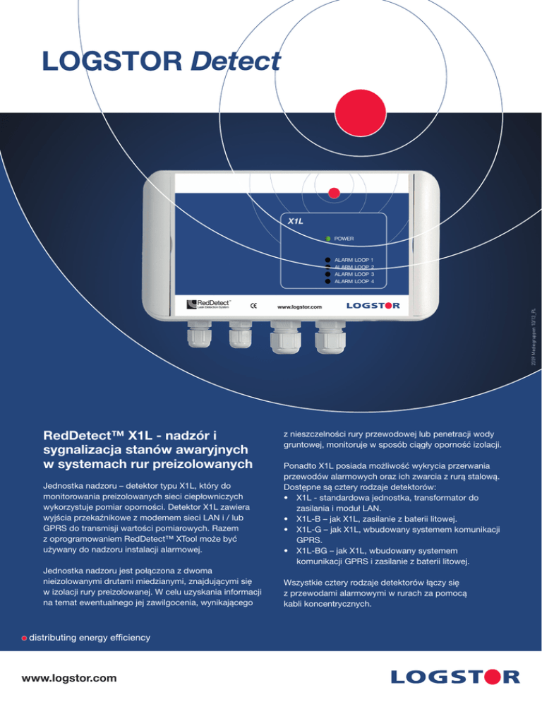 P i n d P r o m o t o r . d k 16759 2359 Mediegruppen 10/13_PL RedDetect™ X1L - nadzór i sygnalizacja stanów awaryjnych w systemach rur preizolowanych Jednostka nadzoru – detektor typu X1L, który do monitorowania preizolowanych sieci ciepłowniczych wykorzystuje pomiar oporności. Detektor X1L zawiera wyjścia przekaźnikowe z modemem sieci LAN i / lub GPRS do transmisji wartości pomiarowych. Razem z oprogramowaniem RedDetect™ XTool może być używany do nadzoru instalacji alarmowej. Jednostka nadzoru jest połączona z dwoma nieizolowanymi drutami miedzianymi, znajdującymi się w izolacji rury preizolowanej. W celu uzyskania informacji na temat ewentualnego jej zawilgocenia, wynikającego www.logstor.com z nieszczelności rury przewodowej lub penetracji wody gruntowej, monitoruje w sposób ciągły oporność izolacji. Ponadto X1L posiada możliwość wykrycia przerwania przewodów alarmowych oraz ich zwarcia z rurą stalową. Dostępne są cztery rodzaje detektorów: •X1L - standardowa jednostka, transformator do zasilania i moduł LAN. • X1L-B – jak X1L, zasilanie z baterii litowej. •X1L-G – jak X1L, wbudowany systemem komunikacji GPRS. •X1L-BG – jak X1L, wbudowany systemem komunikacji GPRS i zasilanie z baterii litowej. Wszystkie cztery rodzaje detektorów łączy się z przewodami alarmowymi w rurach za pomocą kabli koncentrycznych. RedDetect™ X1L - Dane techniczne Masa 0.5 kg Wymiary L x W x H: 200 x 110 x 60 mm Zasięg 4 x 7,000 m – przewodu, 8 kanałów (4 pętle) Zakres pomiaru – Oporność izolacji 1kΩ – 1MΩ Sygnalizacja alarmu Wizualna i akustyczna– oraz z wyjściem przekaźnikowym do oprogramowania Przesyłanie sygnału sieć LAN, GPRS, światłowód Obudowa Poliwęglan, uszczelnienie bezhalogenowe - IP 67 Zakres zastosowania -20°C – +70°C Zasilanie Transformator 110/230 V AC, 12 V DC – lub bateria. Pobór mocy < 50 μA Ulokowanie Wewnątrz lub w szafkach Oznaczenie CE Typ Właściwości Akcesoria X1L Standard, jak opisano powyżej Zawiera transformator X1L-B Jak X1L, ale z baterią litową zamiast transformatora. W normalnych warunkach, żywotność baterii wynosi więcej niż osiem lat. Zawiera baterię X1L-G Jak X1L, ale z wbudowanym modemem GPRS Zawiera antenę X1L-BG Jak X1L-G, ale z baterią litową zamiast transformatora. Obejmuje monitorowanie napięcia baterii. Jak B lub G Oprogramowanie graficzne XTool Zamawiane oddzielnie LOGSTOR Polska Sp. z o.o. ul. Handlowa 1 · 41-807 Zabrze tel. + 48 32 37 38 100 · fax. + 48 32 37 38 180 [email protected] Biuro Handlowe ul. Malborska 60 · 82-300 Elbląg tel. + 48 55 619 59 19 · fax. + 48 55 233 76 31 www.logstor.com