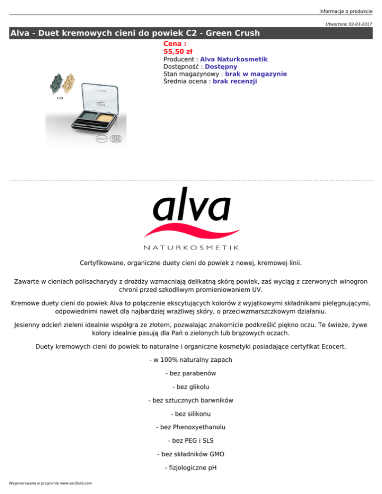 Informacje o produkcie Utworzono 02-03-2017 Alva - Duet kremowych cieni do powiek C2 - Green Crush Cena : 55,50 zł Producent : Alva Naturkosmetik Dostępność : Dostępny Stan magazynowy : brak w magazynie Średnia ocena : brak recenzji Certyfikowane, organiczne duety cieni do powiek z nowej, kremowej linii. Zawarte w cieniach polisacharydy z drożdży wzmacniają delikatną skórę powiek, zaś wyciąg z czerwonych winogron chroni przed szkodliwym promieniowaniem UV. Kremowe duety cieni do powiek Alva to połączenie ekscytujących kolorów z wyjątkowymi składnikami pielęgnującymi, odpowiednimi nawet dla najbardziej wrażliwej skóry, o przeciwzmarszczkowym działaniu. Jesienny odcień zieleni idealnie współgra ze złotem, pozwalając znakomicie podkreślić piękno oczu. Te świeże, żywe kolory idealnie pasują dla Pań o zielonych lub brązowych oczach. Duety kremowych cieni do powiek to naturalne i organiczne kosmetyki posiadające certyfikat Ecocert. - w 100% naturalny zapach - bez parabenów - bez glikolu - bez sztucznych barwników - bez silikonu - bez Phenoxyethanolu - bez PEG i SLS - bez składników GMO - fizjologiczne pH Wygenerowano w programie www.oscGold.com - hypoalergiczne Składniki: Mica, Zea Mays (Corn) Starch, Octyldodecyl Stearoyl Stearate, Zinc Stearate, Dehydroacetic Acid (and) Benzyl Alcohol, Ricinus Communis (Castor) Seed Oil, Yeast Polysaccharide, Chamomilla Recutita (Matricaria) Extract, Vitis Vinifera (Grape), Triticum Vulgare (Wheat) Germ Oil, Camelina Sativa Seed Oil, Macadamia Ternifolia Seed Oil, Oenothera Biennis (Evening Primrose) Oil, Beta Vulgaris (Beet) Root Extract. May contain: beetroot, CI 77891, CI 77491, CI 77492, CI 77499
